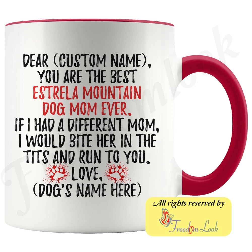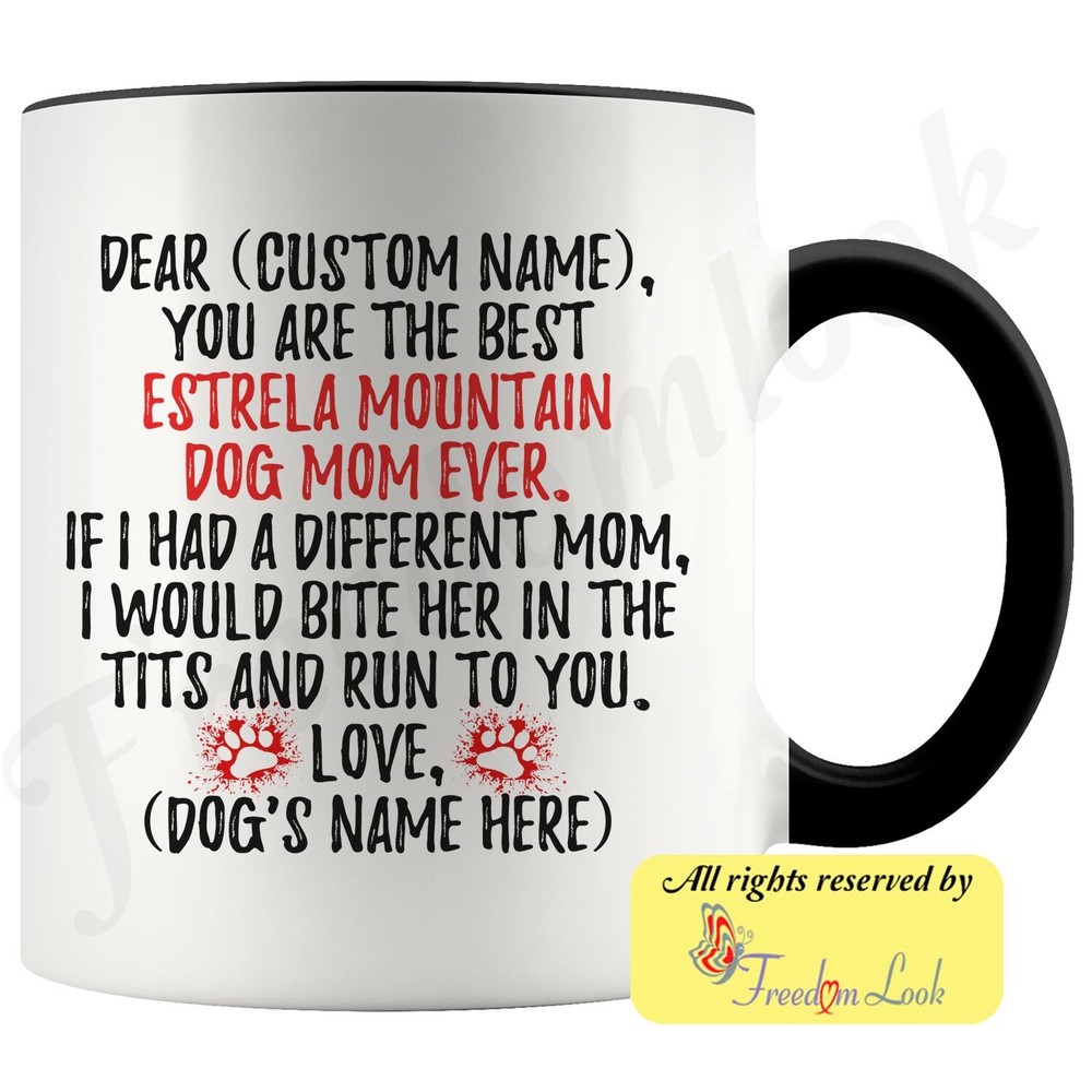 personalized estrela mountain dog mug, estrela mountain dog coffee mug, estrela mountain dog gifts, estrela mountain dog mom present gift, estrela mountain dog mommy, estrela mountain dog owner, i love estrela mountain dog, custom dog gifts, dog coffee cup, mothers day gift Are you looking for a great, unique and personalized gift for a dog owner? Search no more and get this mug TODAY. They will be thankful forever. Don't miss it because you'll regret it later by not getting it. This is the perfect coffee mug with content "DEAR 'CUSTOM NAME', YOU ARE THE BEST ESTRELA MOUNTAIN DOG MOM EVER. IF I HAD A DIFFERENT MOM, I WOULD BITE HER IN THE TITS AND RUN TO YOU. LOVE, 'DOG'S NAME HERE' ". CUSTOM MOM'S NAME AND DOG'S NAME Please put the mom's and dog's name in the notes at the checkout or just send us a message. By not doing this, it will delay your order. Example: Mom's name: Emma; Dog's name: Charlie A PERFECT FUNNY GIFT FOR AN ESTRELA MOUNTAIN DOG MOM! This special coffee cup can be a great gift for every Estrela Mountain dog mom. Sizes: Colored coffee mug size: 11 oz White coffee mug size: 11 oz or 15 oz DISHWASHER AND MICROWAVE SAFE! This version of ceramic mug shows it's true colors with quality assurance to withstand heat in the microwave and put it in the dishwasher as many times as you like, the quality will not be Altered. THE MUG DESIGN IS PRINTED ON BOTH SIDES! No matter if you hold your teacup in your right or left hand, you and everyone else will be able to see this unique design. Looking at this cute coffee mug will put a smile on everyone's face! We want you to be 100% satisfied, so please let us know if there is anything wrong with your order so we can fix it right away. We truly offer the most stunning, unique and trendy highest-quality products in the world. All of our products are custom-made-to-order and handcrafted to the highest quality standards. We stand by our products the quality is outstanding rest assured. Triple check your address , we copy addresses exactly as written, any undeliverable orders due to customer error are not our responsibility. Mug for every day. Christmas birthday brother sister mom mother father dad aunt grandma grandpa girlfriend gift