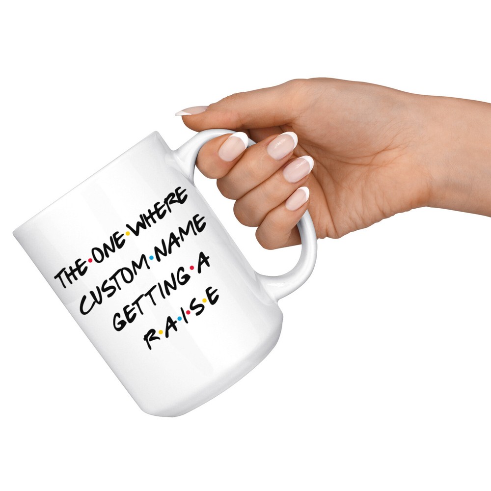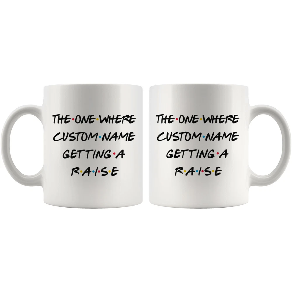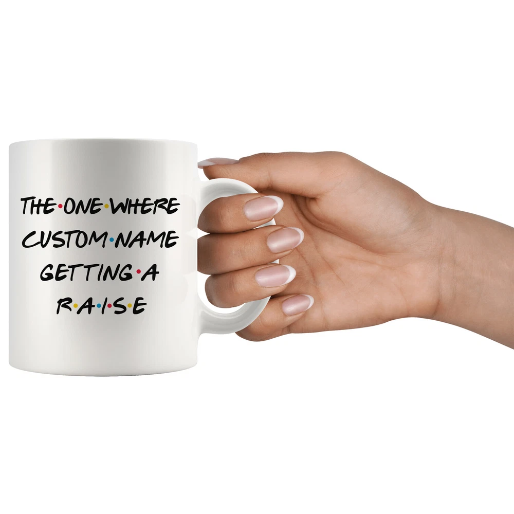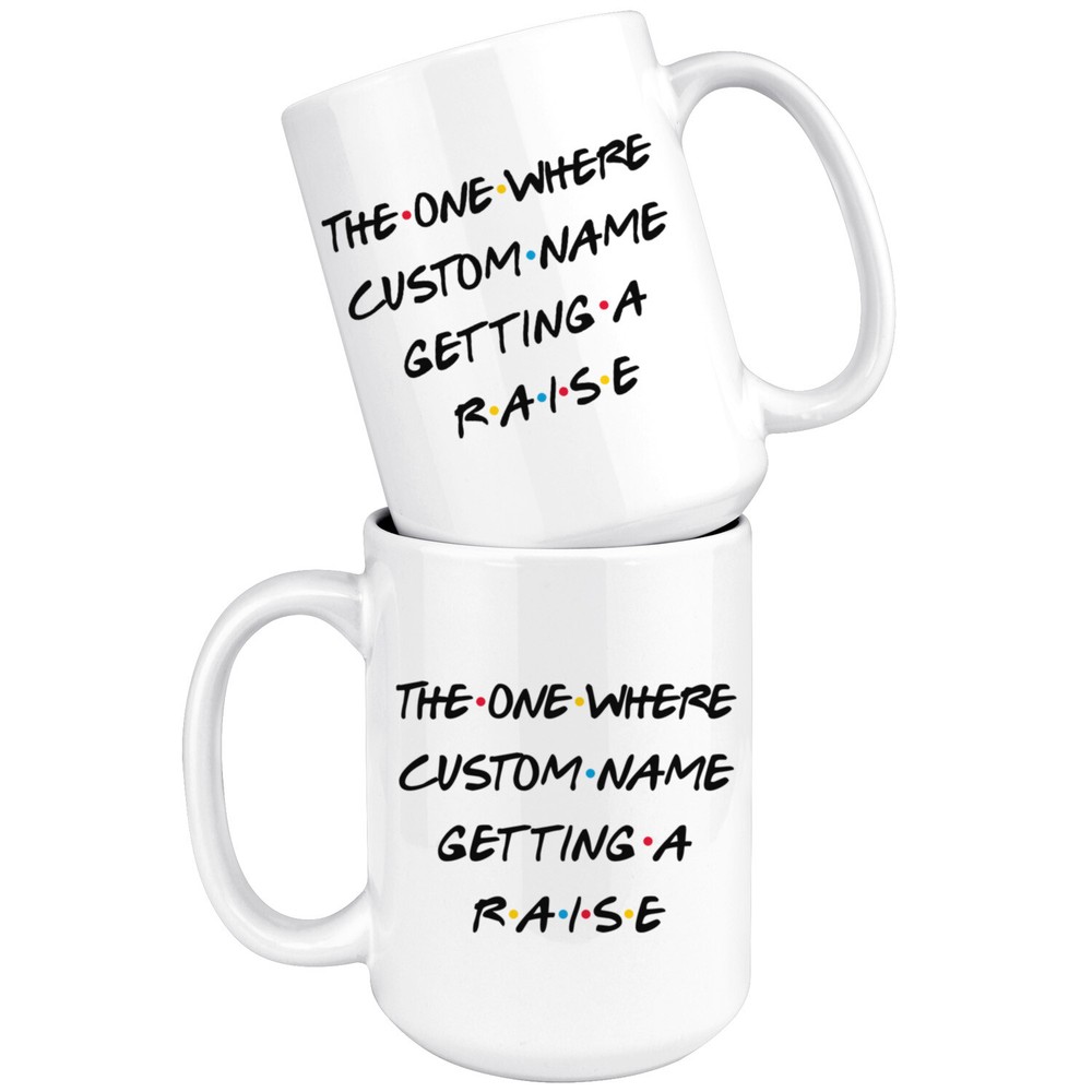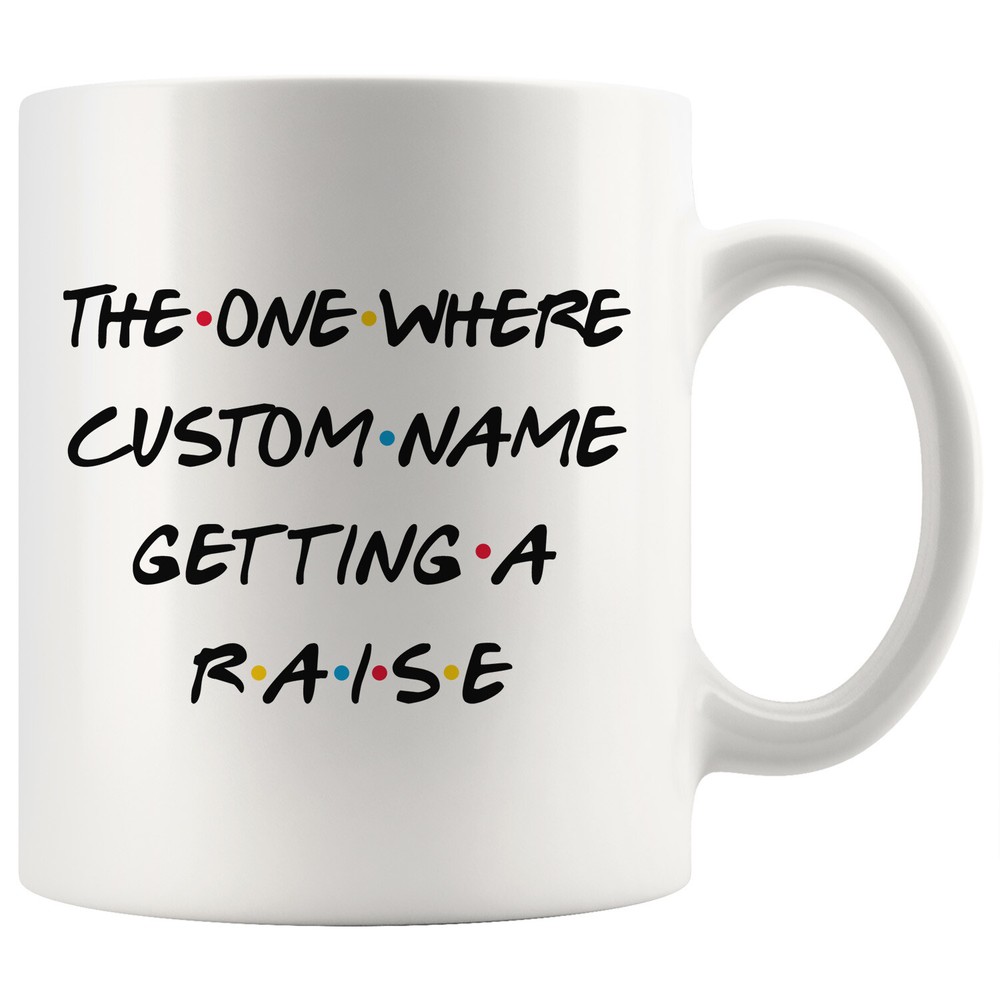 personalized getting a raise coffee mug, gift for new raise, job raise present gift, getting a raise in career, appreciation gift for men & women, congratulation in job coffee mug, getting a raise coffee cup, mothers day gift, fathers day gift, gifts for her, gifts for him, employee gets a raise This is the perfect coffee mug with content " THE ONE WHERE 'CUSTOM NAME' GETTING A RAISE ". CUSTOM NAME Please put the custom name in the notes at the checkout or send us a message. By not doing this, it will delay your order. Example: Custom name: Lynda. A PERFECT GIFT FOR EVERY EMPLOYEE WHO GETS A RAISE ! This special coffee cup can be a great gift for friends or family members. Bring a smile to your family member or friend with this unique gift . DISHWASHER AND MICROWAVE SAFE! This version of ceramic mug shows it's true colors with quality assurance to withstand heat in the microwave and put it in the dishwasher as many times as you like, the quality will not be Altered. THE MUG DESIGN IS PRINTED ON BOTH SIDES! No matter if you hold your teacup in your right or left hand, you and everyone else will be able to see this unique design. Looking at this cute coffee mug will put a smile on everyone's face! We want you to be 100% satisfied, so please let us know if there is anything wrong with your order so we can fix it right away.