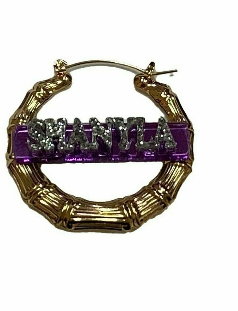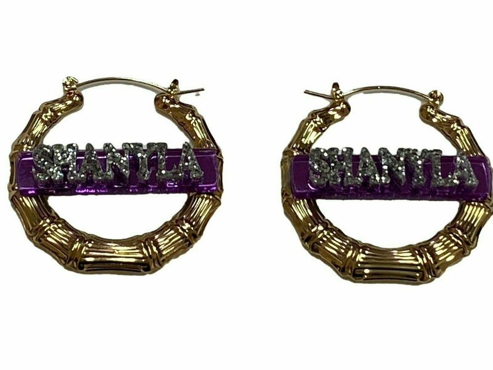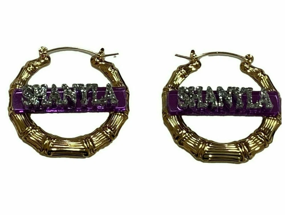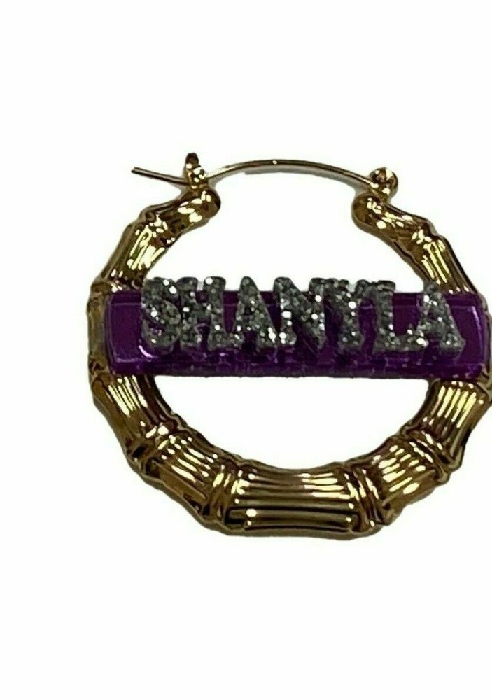 Personalized Custom Gold Hoop Earrings Name Plate Laser Cut Stunning Diamond Look Personalized Custom Gold Hoop Bamboo Earrings Name Plate Laser Cut Design Stunning - Quality, Attractive Gold Bamboo Hoop Earrings, Made To Order - 1.5 INCHES size Great for Children's Kids and Smaller Hoop Earrings Desires Please let us know the name that you want, and color background by “Message to seller”. We can make any name and can fit all the letters in your name. The earrings are light in weight so they are super comfortable. They're unique, different and pretty. You can pick your favorite color for the background and a design at the end of your name. The custom name plate earrings are priced to sell and are good quality. We offer free shipping. We also make the same in necklaces so you can match the necklace and the earrings with same color and design. Personalized items make great gifts. It's an "Everything" gift and you can treat yourself or great for birthdays, holidays, graduation, etc. Our customers asked us for the shape of their name and we are excited to offer our Name Plate Necklaces as our new creation! Browse our Ebay store to see all of our personalized products: http://stores.ebay.com/mirrormaniarandy/ High Quality and Design Personalized Custom Name Plate Earrings Comes With: Pair of beautiful quality hoop gold fashion earrings Your Name - it doesn't matter how many letters are in your name. You could also put a nickname or word. Choose a free design on the end (heart, princess crown, skull, music note, cross, star, horse, dolphin, butterfly, peace sign, $ sign, or no design). Choose the color background that you like (pink, red, gold, blue, purple, black). Choose the color letters that you like Font is same as shown in sample Looking for a great gift for someone that has everything, well you can get them one of these custom made beautiful necklaces... With the colors of your choice.... Unusual or Unique Spelling.. Not a problem.. Let us know how you spell it and we'll fix it up for you. Feel free to use the 'ask seller a question' button on the top right if you have any queries and we will get back to you promptly. Mirror Mania is a company with unique personalized products that motivate, excite and electrify! If you like something specific, we will make it, please contact us. We have many years of experience working with people from all over the country and are very good at ensuring that our customers are satisfied and pleased. If you need a special and memorable gift for a birthday, holiday, special occasion, party favors, weddings, or just to put a smile on someone’s face, take a browse on our store and have fun shopping! We have that extra personal touch and something for everyone.
