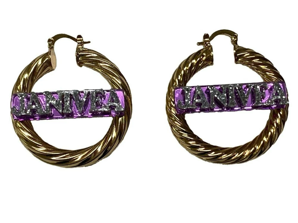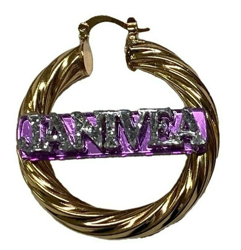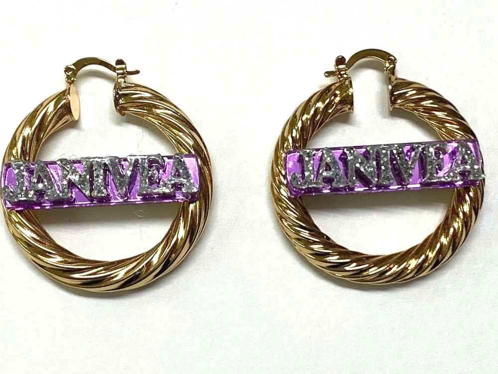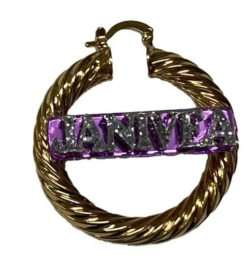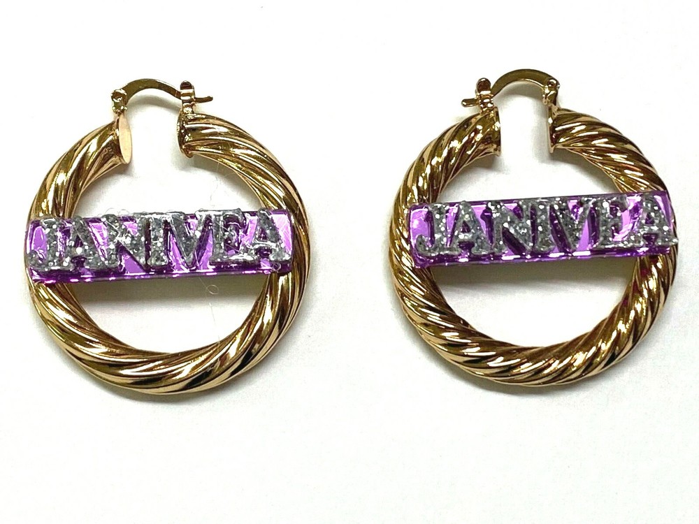 Personalized Custom Gold Hoop Earrings Name Plate Laser Cut Stunning Diamond Look Please let us know the name that you want, and color background by “Message to seller”. We can make any name and can fit all the letters in your name. The earrings are light in weight so they are super comfortable. They're unique, different and pretty. You can pick your favorite color for the background and a design at the end of your name. The custom name plate earrings are priced to sell and are good quality. We offer free shipping. We also make the same in necklaces so you can match the necklace and the earrings with same color and design. Personalized items make great gifts. It's an "Everything" gift and you can treat yourself or great for birthdays, holidays, graduation, etc. Our customers asked us for the shape of their name and we are excited to offer our Name Plate Necklaces as our new creation! Browse our Ebay store to see all of our personalized products: http://stores.ebay.com/mirrormaniarandy/ High Quality and Design Personalized Custom Name Plate Earrings Comes With: Pair of beautiful quality hoop gold fashion earrings Your Name - it doesn't matter how many letters are in your name. You could also put a nickname or word. Choose a free design on the end (heart, princess crown, skull, music note, cross, star, horse, dolphin, butterfly, peace sign, $ sign, or no design). Choose the color background that you like (pink, red, gold, blue, purple, black). Choose the color letters that you like Font is same as shown in sample Looking for a great gift for someone that has everything, well you can get them one of these custom made beautiful necklaces... With the colors of your choice.... Unusual or Unique Spelling.. Not a problem.. Let us know how you spell it and we'll fix it up for you. Feel free to use the 'ask seller a question' button on the top right if you have any queries and we will get back to you promptly. Mirror Mania is a company with unique personalized products that motivate, excite and electrify! If you like something specific, we will make it, please contact us. We have many years of experience working with people from all over the country and are very good at ensuring that our customers are satisfied and pleased. If you need a special and memorable gift for a birthday, holiday, special occasion, party favors, weddings, or just to put a smile on someone’s face, take a browse on our store and have fun shopping! We have that extra personal touch and something for everyone.