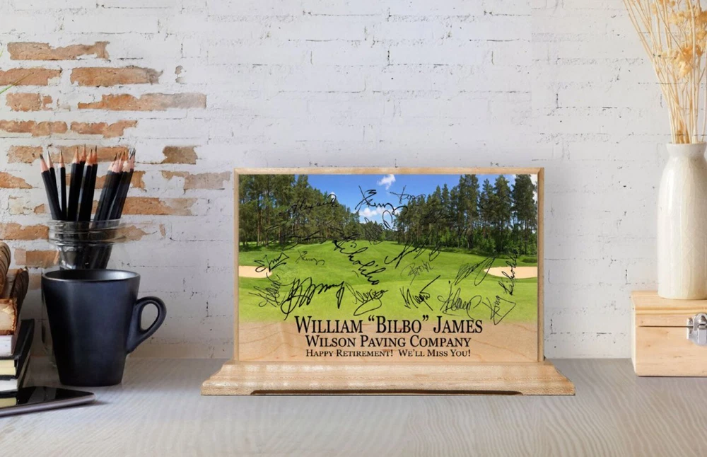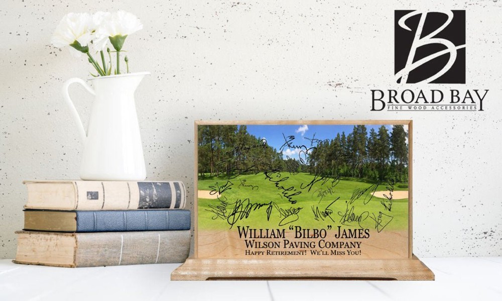 Personalized Retirement Gift Plaque Golf Theme For Golfers FREE 2 Day Air & SAME DAY SHIPPING - ORDER BY 2:00 PM Eastern Time PERSONALIZED RETIREMENT GIFT AND DESIGNED FOR CO-WORKER SIGNATURES AND NOTES! CUSTOM MADE SUPER FAST - It's Not Too Late To Make Your Golfer Retirement Gift EXTRA SPECIAL with PERSONALIZATION! FREE STANDING - FOR SHELF, DESK or MANTEL! Elegant Design And Crafted In The USA - Made in Virginia! SOOTHING GOLF THEME DESIGN! OUR RETIREMENT GIFT PLAQUES ARE MADE FROM SOLID WOOD! No Cheap Veneers, MDF or Plywood. You'll Have it in 2 DAYS If You order by 2:00PM Eastern Time! Its Not Too Late To Make It Special! This great personalized golf theme retirement gift plaque is perfect for any well liked retired golfer co-worker. Personalized with a name, company name, and a note or slogan, this unique golf oriented retirement plaque is made for notes and signatures of co-workers and friends. Made for display on a desk, shelf, or mantel, this solid wood custom golf design retirement gift is made like a fine piece of furniture. Proudly crafted in the United States from American Maple, this personalized retirement gift is perfect in any decor. Well Sized at 5.75 in tall by 9 in wide - not too big - This great retirement gift plaque won't overwhelm a desk or shelf and will be a wonderful reminder of the time you shared together and a symbol of your appreciation for their efforts! Personalized Retirement Gift Plaque Golf Theme For Golfers FREE 2 Day Air & SAME DAY SHIPPING - ORDER BY 2:00 PM Eastern Time PERSONALIZED RETIREMENT GIFT AND DESIGNED FOR CO-WORKER SIGNATURES AND NOTES! CUSTOM MADE SUPER FAST - It's Not Too Late To Make Your Golfer Retirement Gift EXTRA SPECIAL with PERSONALIZATION! FREE STANDING - FOR SHELF, DESK or MANTEL! Elegant Design And Crafted In The USA - Made in Virginia! SOOTHING GOLF THEME DESIGN! OUR RETIREMENT GIFT PLAQUES ARE MADE FROM SOLID WOOD! No Cheap Veneers, MDF or Plywood. You'll Have it in 2 DAYS If You order by 2:00PM Eastern Time! Its Not Too Late To Make It Special! This great personalized golf theme retirement gift plaque is perfect for any well liked retired golfer co-worker. Personalized with a name, company name, and a note or slogan, this unique golf oriented retirement plaque is made for notes and signatures of co-workers and friends. Made for display on a desk, shelf, or mantel, this solid wood custom golf design retirement gift is made like a fine piece of furniture. Proudly crafted in the United States from American Maple, this personalized retirement gift is perfect in any decor. Well Sized at 5.75 in tall by 9 in wide - not too big - This great retirement gift plaque won't overwhelm a desk or shelf and will be a wonderful reminder of the time you shared together and a symbol of your appreciation for their efforts! × × × × × × × × × Buy now and save! Tell a friend Visit store Watch now Postage info Click the Postage tab above the listing description for more info FREE Postage Click the Postage tab above the listing description for more info! Additional delivery notes PICK UP OPTION Sorry, our items are NOT available for pick-up. PAYING VIA PAYPAL We accept PayPal on our all our items so you can shop with confidence. Simple choose the PayPal option when proceeding through the checkout. Additional Information No additional information at this time Ask seller a question You might also like Personalized 12 Year Anniversary Gift – Custom Names | Solid Wood Countdown Sign Personalized 13 Year Anniversary Gift – Custom Names | Solid Wood Years Together Personalized 15 Year Anniversary Gift – Custom Couple’s Names | Solid Wood “Fore Personalized 16 Year Anniversary Gift – Custom Couple’s Names | Solid Wood “Fore Contact To contact our Customer Service Team, simply click the button here and our Customer Service team will be happy to assist. Ask seller a question © Broad Bay Personalized Gifts Shipped Fast Postage Shipping is FREE for this item Payment Accepted Payment Methods PayPal Returns Returns are accepted Items must be returned within 30 days of the auction ending Buyer will pay for return shipping. eBay integration by