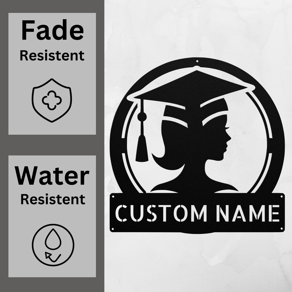 Product Description Personalized Girl Grad Cap Metal Sign Custom Graduation Decor Unique Gift Idea Celebrate a special achievement with the Personalized Girl Grad Cap Metal Sign ! This delightful sign is the perfect way to honor a graduate and add a personal touch to any space. Made from 16 gauge high-quality metal , this sign is designed for durability. The powder coating ensures it is dust, weather, and water-resistant, making it suitable for both indoor and outdoor display. Key features include: Customizable Design: Personalize it with the graduate’s name and graduation year. Sturdy and Long-Lasting: Crafted from high-quality metal for enduring use. Perfect Gift: An ideal choice for graduations, birthdays, or any special occasion. Stylish Decor: Great for home, office, or dorm room decoration. Show your pride and create a lasting memory with the Personalized Girl Grad Cap Metal Sign . It’s not just a sign; it’s a cherished keepsake that celebrates success! Service and Color Choice Our metal signs are designed to be personalized just for you, making them the perfect addition to any space! The default color for our signs is Black , but we also offer a variety of beautiful options including Copper, Gold, White, and Silver . After placing your order, simply contact us with your preferred color choice, and we'll ensure your sign is exactly how you envision it. Let’s create something special together!