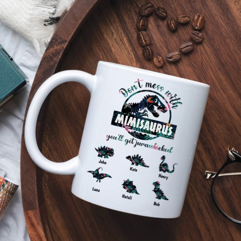 Personalized Grandma Mimisaurus Mug Gift For Grandma Granny Mimi Custom T Rex Baby Dinosaur Mothers Day Gift Birthday Nana Decor Gift Product Details.. This high quality 11oz. ceramic white mug has a premium hard coat that provides crisp and vibrant color reproduction sure to last for years. Perfect for all hot & cold beverages. The highest quality printing possible is used. It will never fade no matter how many times you wash it. Material: 100% Ceramic. Print both sides. Dishwasher and Microwave Safe. High Gloss + Premium White Finish. Printed in the U.S.A. Personalized & Custom. We support personalized and custom mug to add custom, when placing an order, you can add notes to the "order note" in shipping address section. Also you can contact us directly via message. Shipping Info. Ready to ship in 1 to 2 business days, All products are made-to-order and proudly printed in the United States. Shipped by USPS and DHL, You will receive your order in 5-7 days. Replace & Refund. All products are defective during shipping broken, chipped will be replaced free of charge. You are not satisfied with the product, we will refund 100% money to you. If any other issues arise, please do not hesitate to message, we would be more than happy to assist you.