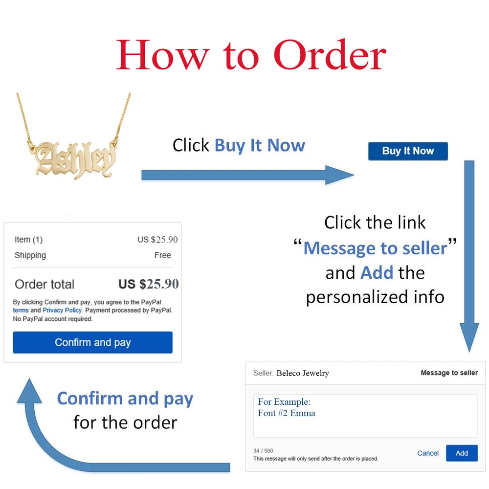 HIGH QUALITY FREE SHIPPING FOR US ORDERS BEST PRICING Beleco Jewelry making beautiful jewellery for woman and man, like this "Personalized Name Necklace with Heart" , a beauty jewelry which could be the perfect special gift for her or you, gift for sister, gift for bride, gift for mom or gift for your best friend. This is your unique gift! H O W ∙ T O ∙ O R D E R: ✔ Choose necklace length and type. ✔ Choose Material. ✔ Leave a note in the "Note to Seller" section when you checkout with your Personalization Details: For Example: Trey Font #2 ➥ For live font preview, please go to: https://beleco-jewelry.com/font-preview ▪ Up to 12 characters. Item Description: ▪ Material: 925 Sterling Silver or Rose/Gold Plated 18k. ▪ It's coat with at least 2 micron of real 18K gold for a long lasting item. ▪ Pendant Name Width: 25-45mm. ▪ Pendant Name Height: 9-12mm. Necklace Length: ▪ 16 inches = 40 cm (Age 6-18 years). ▪ 18 inches = 45 cm (Most popular size for women). ▪ 20 inches = 50 cm (Please See Size Picture). ▪ 24 inches = 60 cm (Please see Size Picture). Shipping Payments Returns ABOUT US Shipping Payments Returns ABOUT US ▪ US ORDERS: Standard shipping 1-5 business days (FREE). DHL Express 1-4 business days (14.90$). ▪ Other countries: Expedited shipping by DHL Express 2-6 business days (14.90$). Please pay attention: ▪ We ship to your eBay or Paypal address. Please make sure your eBay and Paypal address is correct before you pay. ▪ Items will be shipped within 1-5 business days when we received payment. ▪ International buyers please note: A. Import duties, taxes and charges are not included in the item price or shipping charges. These charges are the buyer’s responsibility. We will try our best to reduce the risk of customs duties. B. Please check with your country's customs office to determine what these additional costs will be prior to buying. We accept payment by any of the following methods: PayPal If you are not 100% satisfied with your purchase, you can return the product and get a full refund or exchange the product for another one, be it similar or not. You can return a product for up to 30 days from the date you purchased it. Any product you return must be in the same condition you received it and in the original packaging. Shipping charges for item return will apply to the customer. Hey there, welcome to Beleco Jewelry! At BELECO, we take a personal approach to not only design, but customer service. You could say we are all about personality, personalization and personability. All of our handmade jewelry is made from top-notch materials and is full of fun, flare and a playful attitude towards life and style. We love to experiment with different typography styles, create unique takes on classic pieces and show off our expertise in silver, gold plating and engraving. We believe that every person deserves a unique piece of jewelry, just for them or for their loved ones. This is why we love to offering personalized pieces that allow anyone to become part of the design process - making the final jewelry piece that much more meaningful. Through our eclectic collection and then free-wheeling customization, anyone can get what they truly want (and look great doing it!) To put a cherry on top, our customer service standards are top-tier. We not only offer a 1 year warranty, but also a 100 day return policy. Our delivery is speedy, our team is friendly, and we genuinely just want to get you the best (sparkliest and specialist) piece of jewelry you could want. ✨Keep Shining ✨ -The BELECO Team Beleco Jewelry making beautiful jewellery for woman and man, like this "Personalized Name Necklace with Heart" , a beauty jewelry which could be the perfect special gift for her or you, gift for sister, gift for bride, gift for mom or gift for your best friend. This is your unique gift! H O W ∙ T O ∙ O R D E R: ✔ Choose necklace length and type. ✔ Choose Material. ✔ Leave a note in the "Note to Seller" section when you checkout with your Personalization Details: For Example: Trey Font #2 ➥ For live font preview, please go to: https://beleco-jewelry.com/font-preview ▪ Up to 12 characters. Item Description: ▪ Material: 925 Sterling Silver or Rose/Gold Plated 18k. ▪ It's coat with at least 2 micron of real 18K gold for a long lasting item. ▪ Pendant Name Width: 25-45mm. ▪ Pendant Name Height: 9-12mm. Necklace Length: ▪ 16 inches = 40 cm (Age 6-18 years). ▪ 18 inches = 45 cm (Most popular size for women). ▪ 20 inches = 50 cm (Please See Size Picture). ▪ 24 inches = 60 cm (Please see Size Picture). HIGH QUALITY FREE SHIPPING FOR US ORDERS BEST PRICING Beleco Jewelry making beautiful jewellery for woman and man, like this "Personalized Name Necklace with Heart" , a beauty jewelry which could be the perfect special gift for her or you, gift for sister, gift for bride, gift for mom or gift for your best friend. This is your unique gift! H O W ∙ T O ∙ O R D E R: ✔ Choose necklace length and type. ✔ Choose Material. ✔ Leave a note in the "Note to Seller" section when you checkout with your Personalization Details: For Example: Trey Font #2 ➥ For live font preview, please go to: https://beleco-jewelry.com/font-preview ▪ Up to 12 characters. Item Description: ▪ Material: 925 Sterling Silver or Rose/Gold Plated 18k. ▪ It's coat with at least 2 micron of real 18K gold for a long lasting item. ▪ Pendant Name Width: 25-45mm. ▪ Pendant Name Height: 9-12mm. Necklace Length: ▪ 16 inches = 40 cm (Age 6-18 years). ▪ 18 inches = 45 cm (Most popular size for women). ▪ 20 inches = 50 cm (Please See Size Picture). ▪ 24 inches = 60 cm (Please see Size Picture). Shipping ▪ US ORDERS: Standard shipping 1-5 business days (FREE). DHL Express 1-4 business days (14.90$). ▪ Other countries: Expedited shipping by DHL Express 2-6 business days (14.90$). Please pay attention: ▪ We ship to your eBay or Paypal address. Please make s