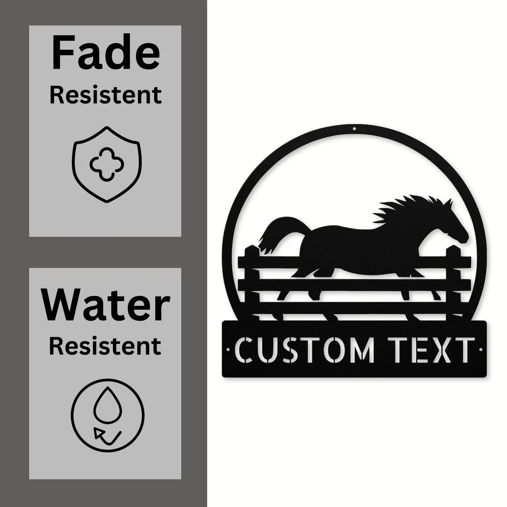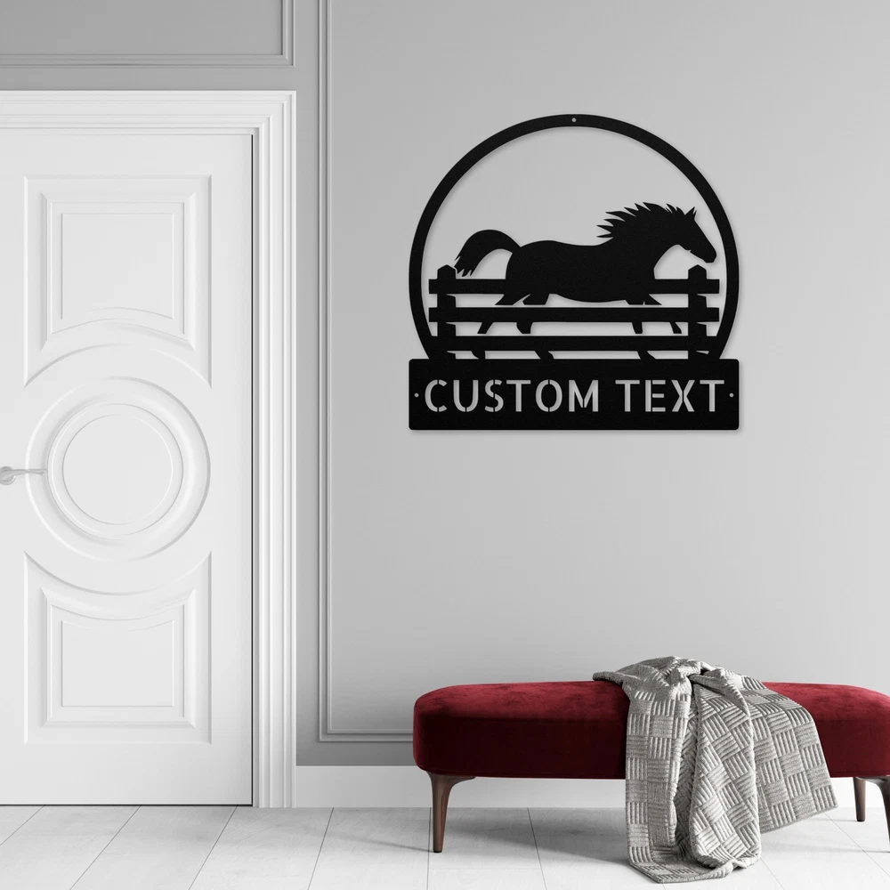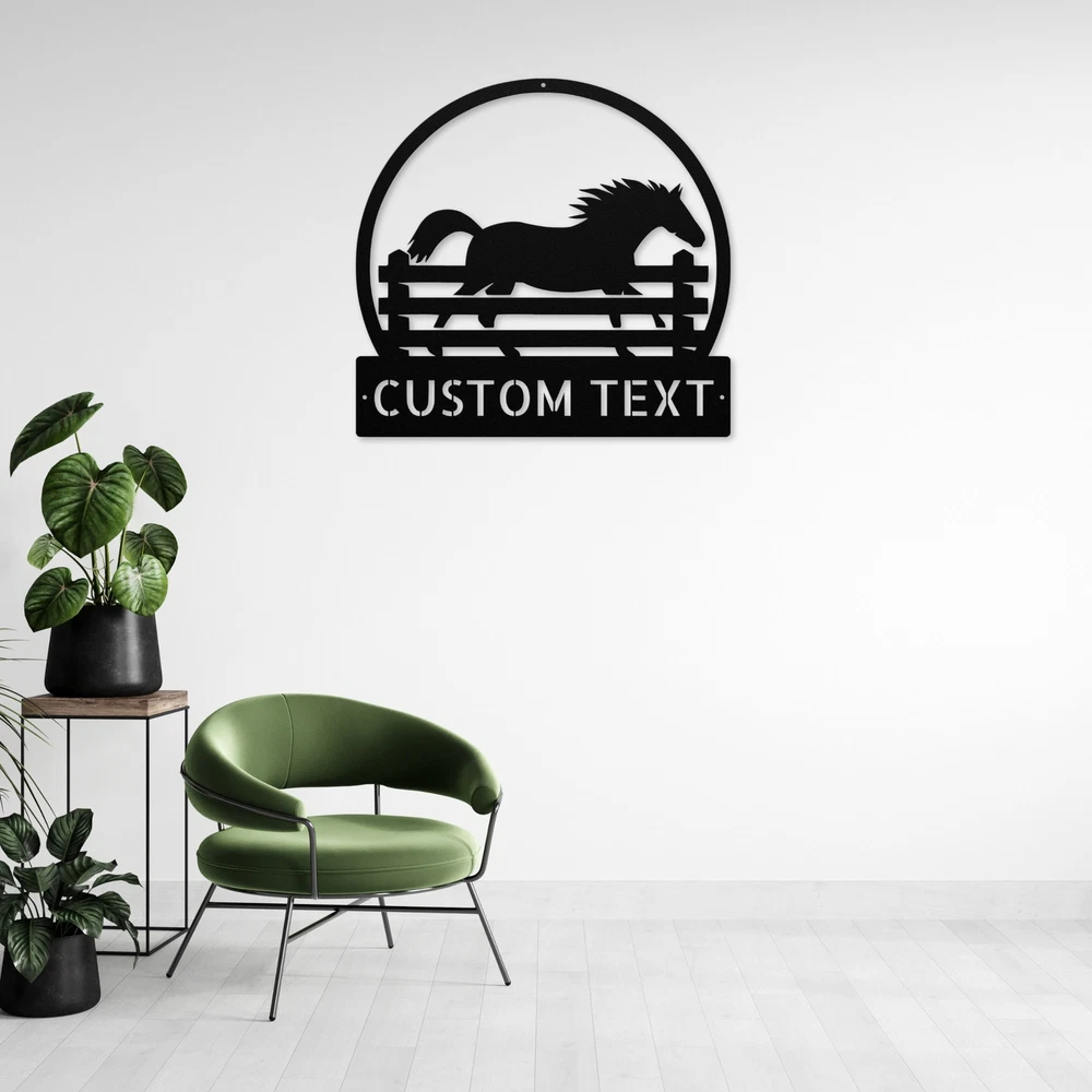 Product Description Custom Horse Metal Sign Durable Wall Decor for Equestrian Lovers Showcase your love for horses with our Custom Horse Metal Sign . This stunning sign is perfect for horse enthusiasts and adds a unique touch to any space. Crafted from 16 gauge high-quality metal, it is designed to last, making it an ideal choice for both indoor and outdoor settings. With a powder-coated finish, this sign is not only visually appealing but also resistant to dust, weather, and moisture. Whether you hang it in your home, barn, or office, it beautifully represents your passion for these magnificent animals. You can customize it with your name or a special message, turning it into a one-of-a-kind piece that truly reflects your personality. This sign makes a fantastic gift for Christmas, birthdays, or any special occasion, ensuring that any horse lover in your life will appreciate this thoughtful gesture. It effortlessly enhances any decor, adding warmth and charm to your surroundings. Key Features: Customizable: Personalize with your name or a special message for a unique touch. Durable Construction: Made from high-quality 16 gauge metal for lasting durability. Weather Resistant: Powder coating protects against dust, moisture, and fading. Versatile Decor: Perfect for homes, barns, offices, or as a gift for horse lovers. Elegant Design: Enhances the beauty of any space while showcasing your love for horses. Elevate your decor with the Custom Horse Metal Sign and celebrate your equestrian passion in style! Service and Color Choice Our metal signs are designed to be personalized just for you, making them the perfect addition to any space! The default color for our signs is Black , but we also offer a variety of beautiful options including Copper, Gold, White, and Silver . After placing your order, simply contact us with your preferred color choice, and we'll ensure your sign is exactly how you envision it. Let’s create something special together!
