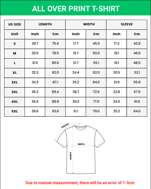 Classic Unisex T-Shirt We offer high-quality all-over print t-shirts under in-house manufacturing. You can design on the front, back, and sleeve of printed shirts or fully printed with logos, quotes, paintings, and drawings with no limit or minimum order quantity. Feel free to create a unique design, design online and we will assure you that the design process for these all-over print shirts won’t take long! These all-over print shirts are made with high-quality material and applied with the best T-shirt printing technique to make sure that the shirt printing won’t fade, crack, or peel off. Material: 100% polyester fabric Instead of using traditional screen printing, we apply sublimated printing techniques for these all-over print shirts. Sublimated printing of full-print shirts creates vibrant colors that won’t fade off for the whole shirt. These tee shirts include double-needle hems and neck bands for durability. **Please note that due to lighting conditions, the colors may appear slightly different, but the variation is minimal and does not significantly affect the overall appearance.** 🎅🔔🎄【SHIPPING TIME】 – Processing Time: 5-7 business days – Shipping time (US): 15-20 business days – Shipping time (WW): 20-25 business days 🌟 PLEASE NOTE : - Shipment to AOPs/FPOs/island area, special states (AK, HI, PR-US)/ countries (MX, BR, CA) will charge extra shipping fees. - Actual color may be slightly different from the image due to different monitor and light effects. - If you guys have any questions, feel free message me. I will reply you as soon as possible. ❤️Thank you for visiting❤️