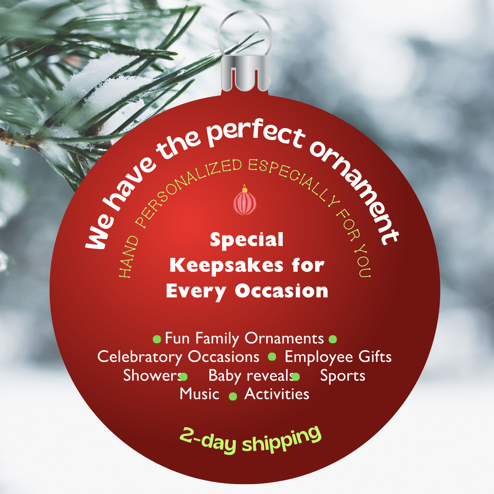 FREE personalization is included with your order giving you, the buyer, the opportunity to add any sentiment in a personal and meaningful way. Each ornament is uniquely and joyfully hand-personalized by our talented staff. ( ornament colors can not be changed and displayed personalization is for example only.) Please provide your personalization text in the space provided before selecting "Add To Cart" or "Buy It Now". "Contact Seller" with any questions or special requests. We will neatly center your personalization in the appropriate space for a perfect, lasting memory. High-quality and colorfully painted resin ornament with a 3D front and a flat back. Each ornament arrives ready-to-hang with a ribbon loop. If personalization is not indicated, we will ship it as a kit (permanent marker and font card included) for at-home personalization, if desired. WE SINCERELY APPRECIATE YOUR BUSINESS!