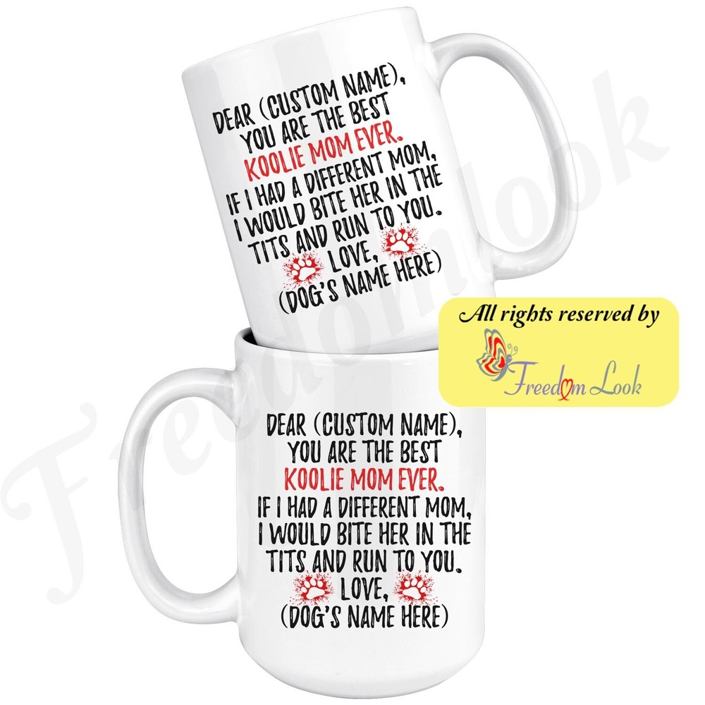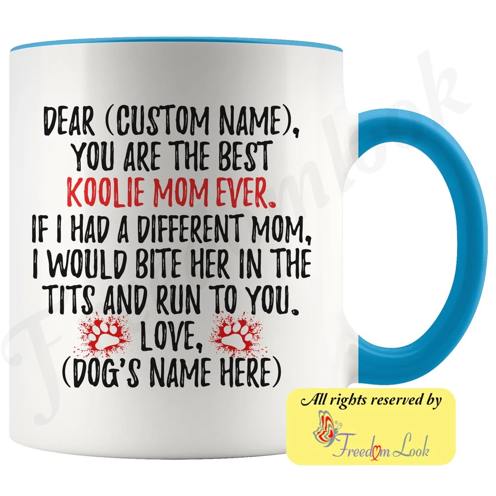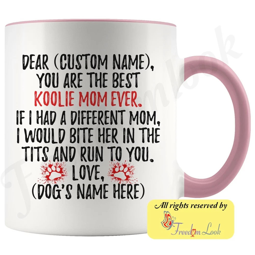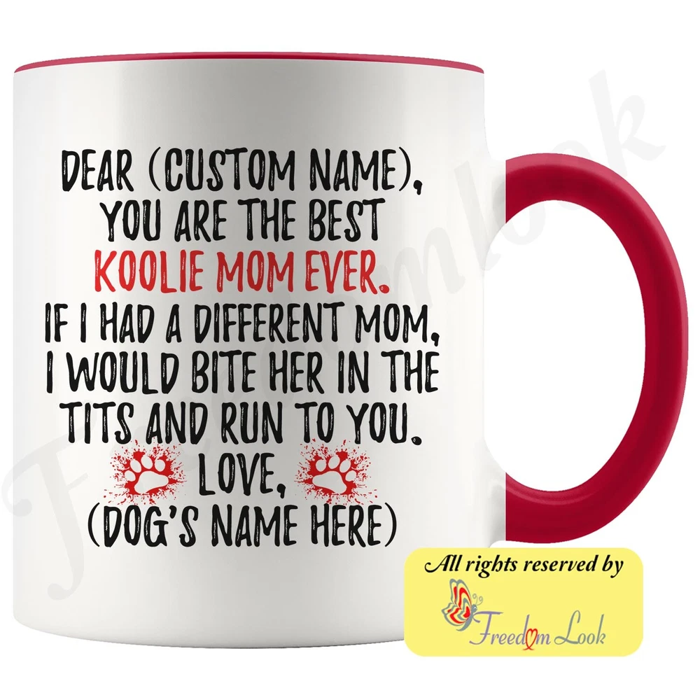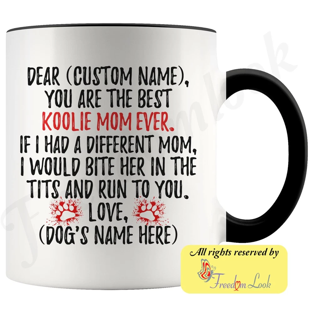 personalized koolie dog mug, australian koolie coffee mug, german koolie gifts, german coolie mom present gift, coulie dog mommy mug, koolie dog owner, i love koolie, custom koolie gift, dog coffee cup, mothers day gift Are you looking for a great, unique and personalized gift for a dog owner? Search no more and get this mug TODAY. They will be thankful forever. Don't miss it because you'll regret it later by not getting it. This is the perfect coffee mug with content "DEAR 'CUSTOM NAME', YOU ARE THE BEST KOOLIE MOM EVER. IF I HAD A DIFFERENT MOM, I WOULD BITE HER IN THE TITS AND RUN TO YOU. LOVE, 'DOG'S NAME HERE' ". CUSTOM MOM'S NAME AND DOG'S NAME Please put the mom's and dog's name in the notes at the checkout or just send us a message. By not doing this, it will delay your order. Example: Mom's name: Emma; Dog's name: Charlie A PERFECT FUNNY GIFT FOR A KOOLIE DOG MOM! This special coffee cup can be a great gift for every Koolie mom. Sizes: Colored coffee mug size: 11 oz White coffee mug size: 11 oz or 15 oz DISHWASHER AND MICROWAVE SAFE! This version of ceramic mug shows it's true colors with quality assurance to withstand heat in the microwave and put it in the dishwasher as many times as you like, the quality will not be Altered. THE MUG DESIGN IS PRINTED ON BOTH SIDES! No matter if you hold your teacup in your right or left hand, you and everyone else will be able to see this unique design. Looking at this cute coffee mug will put a smile on everyone's face! We want you to be 100% satisfied, so please let us know if there is anything wrong with your order so we can fix it right away. We truly offer the most stunning, unique and trendy highest-quality products in the world. All of our products are custom-made-to-order and handcrafted to the highest quality standards. We stand by our products the quality is outstanding rest assured. Triple check your address , we copy addresses exactly as written, any undeliverable orders due to customer error are not our responsibility. Mug for every day. Christmas birthday brother sister mom mother father dad aunt grandma grandpa girlfriend gift