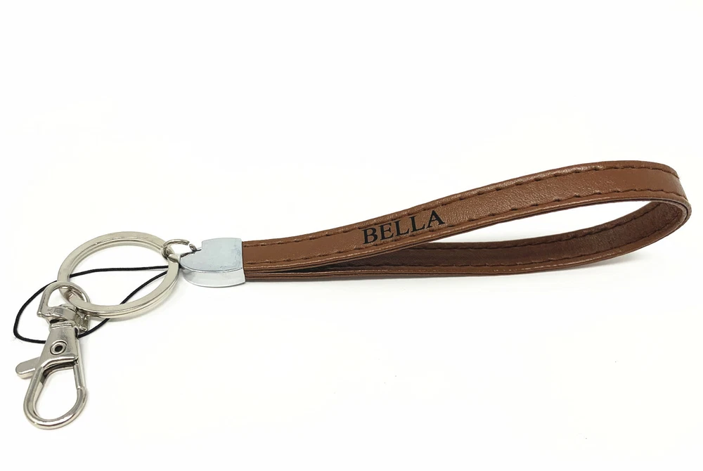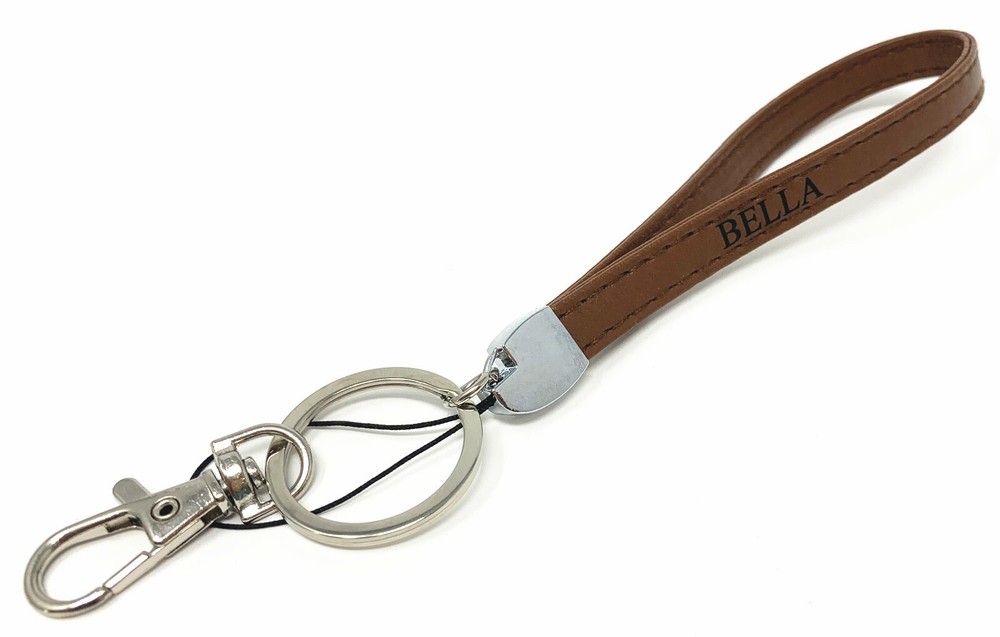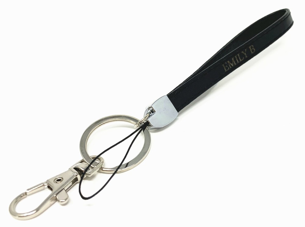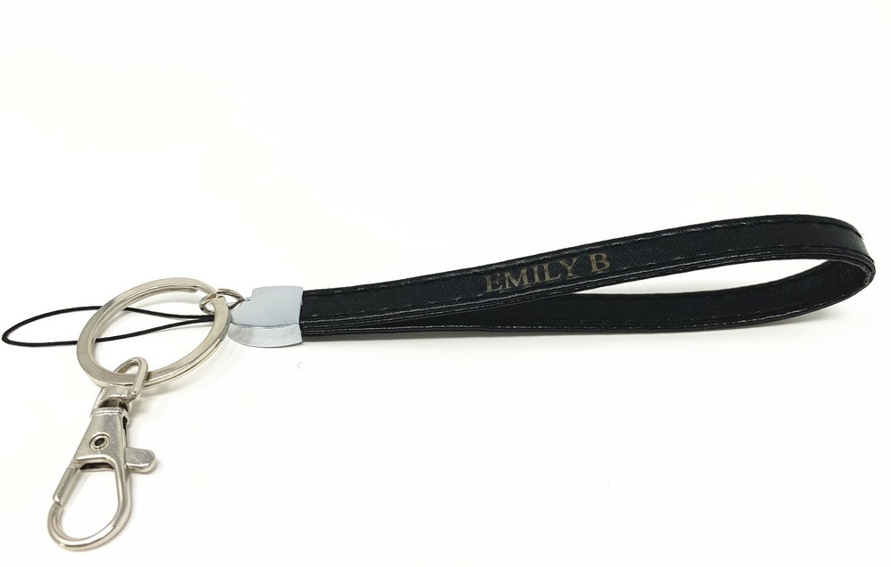 * Two Colors available: Black and Brown * Fonts: Times New Roman or you could leave a note for the font style you'd like * Max 10 characters including space (name, number, initial or mark.. ) * Compatible For: Key/ ID Badge /Cell Phone/USB... * Material : pu Leather * Wristlet Dimensions: 8 x 0.5 x 0.2 inches * Shipment: USPS First Class ; USPS Priority package