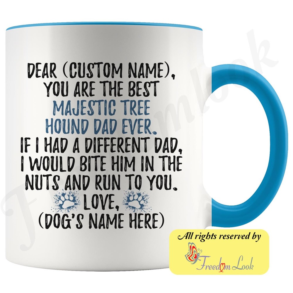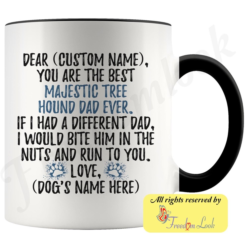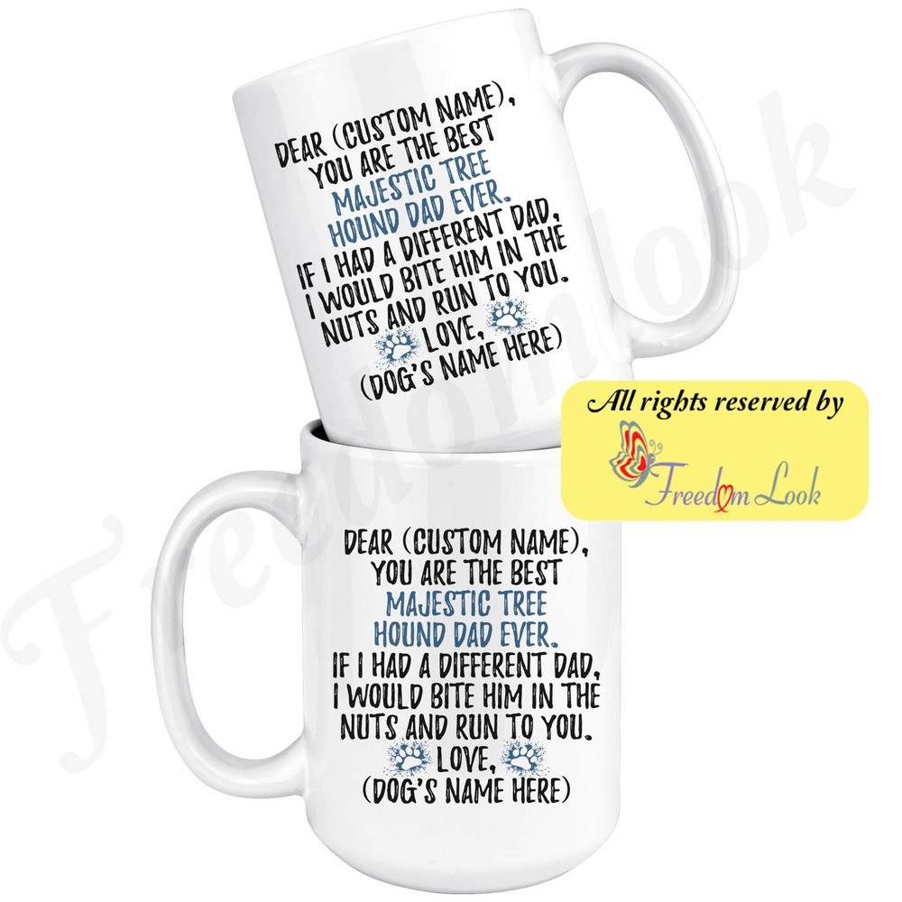 personalized majestic tree hound dog mug, majestic treehound coffee mug, majestic tree hound gifts, majestic tree hound dad present gift, majestic tree hound daddy mug, majestic tree hound owner, i love dogs, custom dog gifts, dog coffee cup, fathers day gift Are you looking for a great, unique and personalized gift for a dog owner? Search no more and get this mug TODAY. They will be thankful forever. Don't miss it because you'll regret it later by not getting it. This is the perfect coffee mug with content "DEAR 'CUSTOM NAME', YOU ARE THE BEST MAJESTIC TREE HOUND DAD EVER. IF I HAD A DIFFERENT DAD, I WOULD BITE HIM IN THE NUTS AND RUN TO YOU. LOVE, 'DOG'S NAME HERE' ". CUSTOM DAD'S NAME AND DOG'S NAME Please put the dad's and dog's name in the notes at the checkout or just send us a message. By not doing this, it will delay your order. Example: Dad's name: Bill; Dog's name: Charlie A PERFECT FUNNY GIFT FOR A MAJESTIC TREE HOUND DOG DAD! This special coffee cup can be a great gift for every Majestic Tree Hound dad. Sizes: Colored coffee mug size: 11 oz White coffee mug size: 11 oz or 15 oz DISHWASHER AND MICROWAVE SAFE! This version of ceramic mug shows it's true colors with quality assurance to withstand heat in the microwave and put it in the dishwasher as many times as you like, the quality will not be Altered. THE MUG DESIGN IS PRINTED ON BOTH SIDES! No matter if you hold your teacup in your right or left hand, you and everyone else will be able to see this unique design. Looking at this cute coffee mug will put a smile on everyone's face! We want you to be 100% satisfied, so please let us know if there is anything wrong with your order so we can fix it right away. We truly offer the most stunning, unique and trendy highest-quality products in the world. All of our products are custom-made-to-order and handcrafted to the highest quality standards. We stand by our products the quality is outstanding rest assured. Triple check your address , we copy addresses exactly as written, any undeliverable orders due to customer error are not our responsibility. Mug for every day. Christmas birthday brother sister mom mother father dad aunt grandma grandpa girlfriend gift