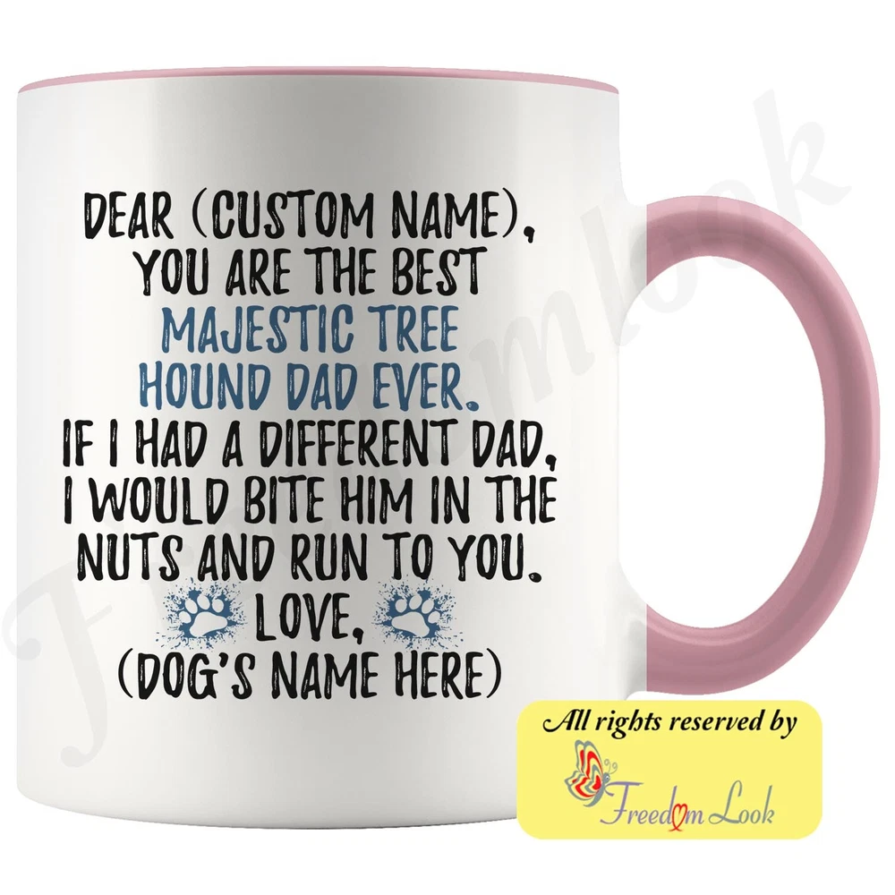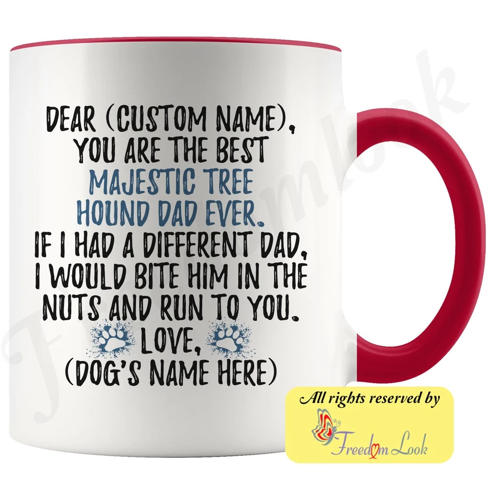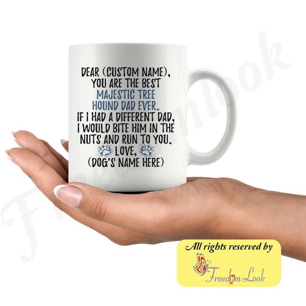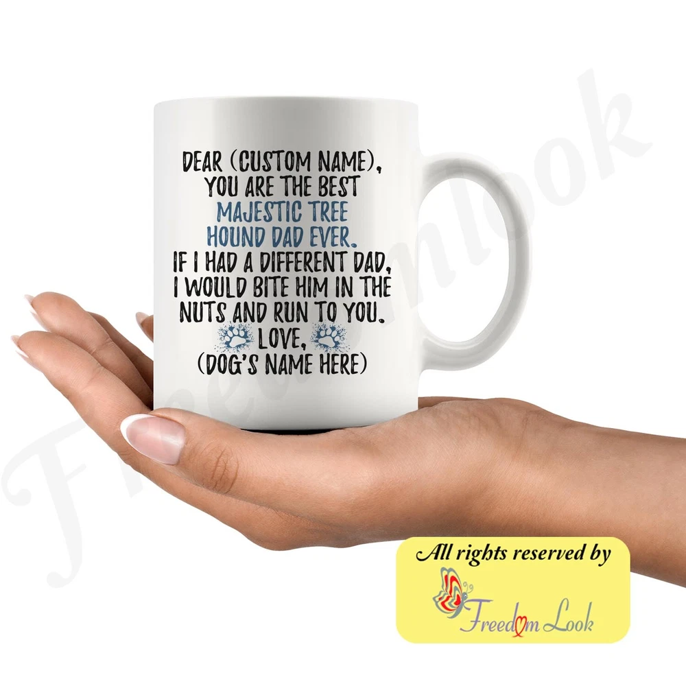 personalized majestic tree hound dog mug, majestic treehound coffee mug, majestic tree hound gifts, majestic tree hound dad present gift, majestic tree hound daddy mug, majestic tree hound owner, i love dogs, custom dog gifts, dog coffee cup, fathers day gift Are you looking for a great, unique and personalized gift for a dog owner? Search no more and get this mug TODAY. They will be thankful forever. Don't miss it because you'll regret it later by not getting it. This is the perfect coffee mug with content "DEAR 'CUSTOM NAME', YOU ARE THE BEST MAJESTIC TREE HOUND DAD EVER. IF I HAD A DIFFERENT DAD, I WOULD BITE HIM IN THE NUTS AND RUN TO YOU. LOVE, 'DOG'S NAME HERE' ". CUSTOM DAD'S NAME AND DOG'S NAME Please put the dad's and dog's name in the notes at the checkout or just send us a message. By not doing this, it will delay your order. Example: Dad's name: Bill; Dog's name: Charlie A PERFECT FUNNY GIFT FOR A MAJESTIC TREE HOUND DOG DAD! This special coffee cup can be a great gift for every Majestic Tree Hound dad. Sizes: Colored coffee mug size: 11 oz White coffee mug size: 11 oz or 15 oz DISHWASHER AND MICROWAVE SAFE! This version of ceramic mug shows it's true colors with quality assurance to withstand heat in the microwave and put it in the dishwasher as many times as you like, the quality will not be Altered. THE MUG DESIGN IS PRINTED ON BOTH SIDES! No matter if you hold your teacup in your right or left hand, you and everyone else will be able to see this unique design. Looking at this cute coffee mug will put a smile on everyone's face! We want you to be 100% satisfied, so please let us know if there is anything wrong with your order so we can fix it right away. We truly offer the most stunning, unique and trendy highest-quality products in the world. All of our products are custom-made-to-order and handcrafted to the highest quality standards. We stand by our products the quality is outstanding rest assured. Triple check your address , we copy addresses exactly as written, any undeliverable orders due to customer error are not our responsibility. Mug for every day. Christmas birthday brother sister mom mother father dad aunt grandma grandpa girlfriend gift