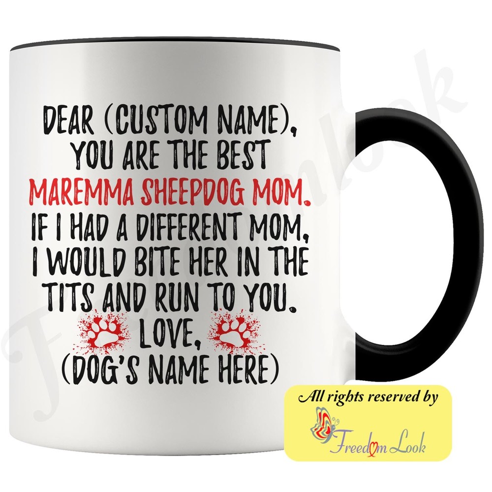 personalized maremma sheepdog dog mug, cane da pastore maremmano-abruzzese coffee mug, pastore abruzzese gifts, pastore maremmano mom present gift, abruzzo sheepdog mommy mug, abruzzese sheepdog owner, i love dogs, custom dog gifts, dog coffee cup, mothers day gift Are you looking for a great, unique and personalized gift for a dog owner? Search no more and get this mug TODAY. They will be thankful forever. Don't miss it because you'll regret it later by not getting it. This is the perfect coffee mug with content "DEAR 'CUSTOM NAME', YOU ARE THE BEST MAREMMA SHEEPDOG MOM. IF I HAD A DIFFERENT MOM, I WOULD BITE HER IN THE TITS AND RUN TO YOU. LOVE, 'DOG'S NAME HERE' ". CUSTOM MOM'S NAME AND DOG'S NAME Please put the mom's and dog's name in the notes at the checkout or just send us a message. By not doing this, it will delay your order. Example: Mom's name: Emma; Dog's name: Charlie A PERFECT FUNNY GIFT FOR A MAREMMA SHEEPDOG MOM! This special coffee cup can be a great gift for every Maremma Sheepdog mom. Sizes: Colored coffee mug size: 11 oz White coffee mug size: 11 oz or 15 oz DISHWASHER AND MICROWAVE SAFE! This version of ceramic mug shows it's true colors with quality assurance to withstand heat in the microwave and put it in the dishwasher as many times as you like, the quality will not be Altered. THE MUG DESIGN IS PRINTED ON BOTH SIDES! No matter if you hold your teacup in your right or left hand, you and everyone else will be able to see this unique design. Looking at this cute coffee mug will put a smile on everyone's face! We want you to be 100% satisfied, so please let us know if there is anything wrong with your order so we can fix it right away. We truly offer the most stunning, unique and trendy highest-quality products in the world. All of our products are custom-made-to-order and handcrafted to the highest quality standards. We stand by our products the quality is outstanding rest assured. Triple check your address , we copy addresses exactly as written, any undeliverable orders due to customer error are not our responsibility. Mug for every day. Christmas birthday brother sister mom mother father dad aunt grandma grandpa girlfriend gift