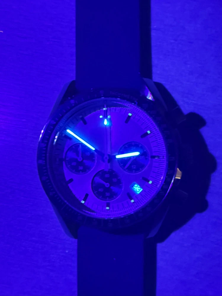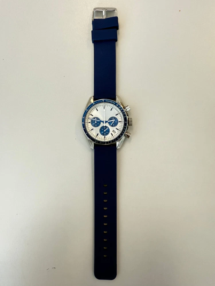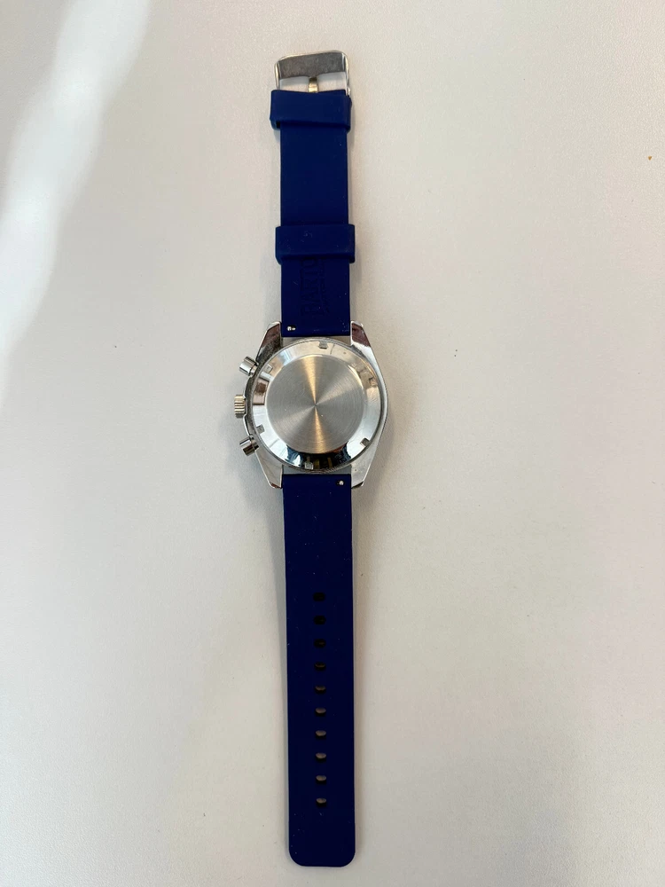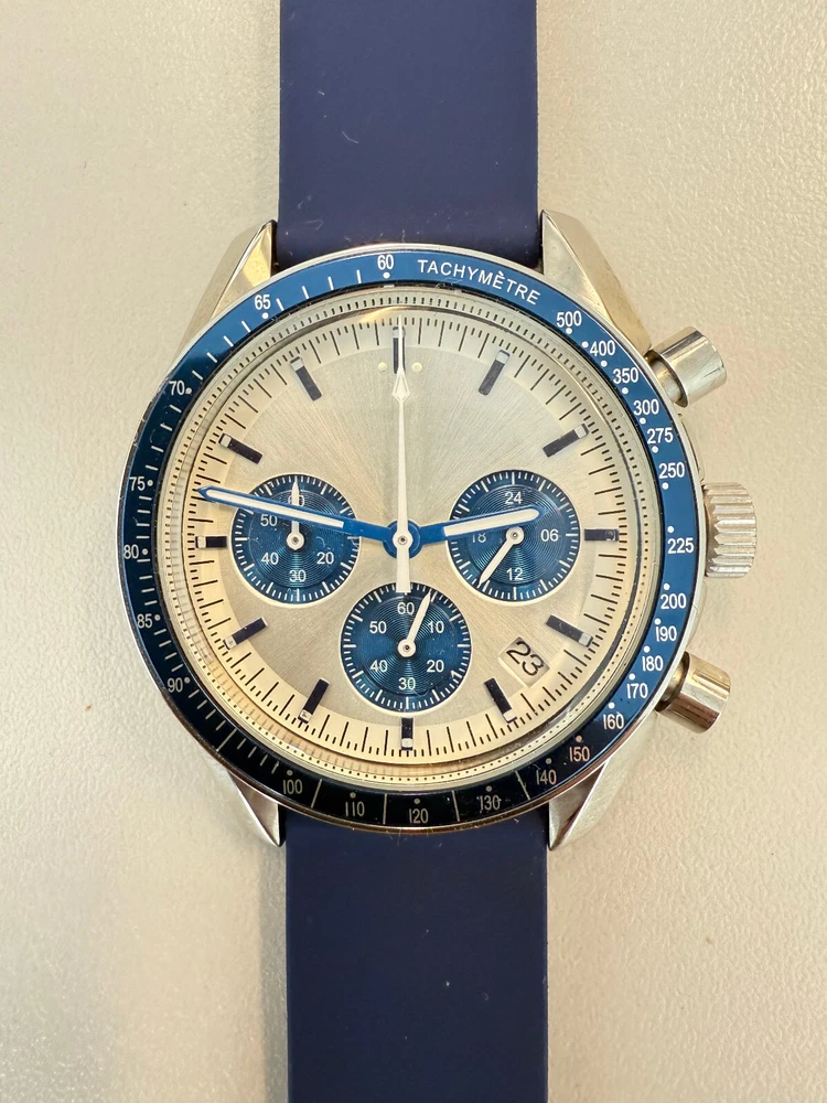 Hand-built mecha-quartz chronograph watch. Genuine Seiko VK63 mecha-quartz date movement, complementary Super-LumiNova hands and dial, case, and rubber strap. For chronograph watches, main dial seconds hand is chronograph seconds. Upper-right pusher starts and stops chronograph. Lower-right pusher resets chronograph. Left small subdial is 60-minute timer. Right small subdial is 24-hour dial. Lower small subdial is small seconds dial. These are built as a hobby and I need to move them after I finish them, so the purchase cost is approximately one-third the parts cost. The watch is run for one week to test functionality, but I cannot warranty the overall longevity of the parts used to construct the watch. Because of this, the watch is sold as-is with the expectation of long-term reliability based on previous builds, but no guarantee given that I cannot verify the individual parts used in the build.