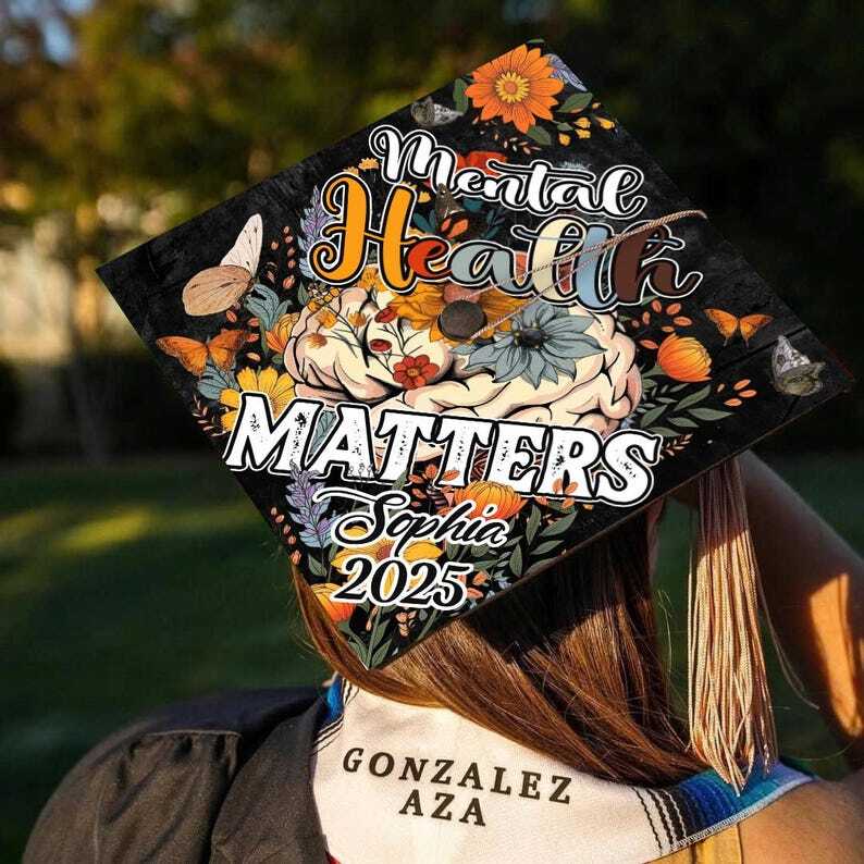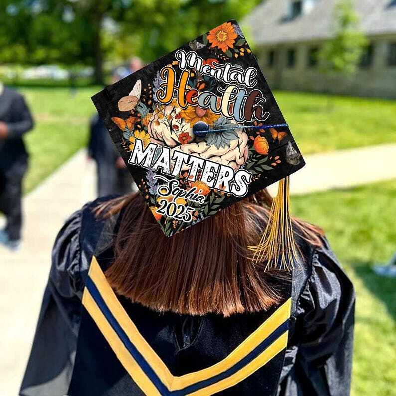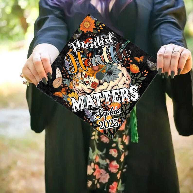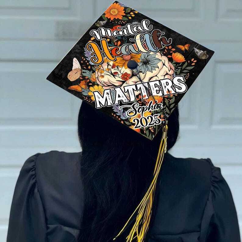 This is a personalized graduation cap topper designed for mental health advocates or psychology graduates. Handmade in Vietnam from acrylic material, the topper features a multi-color design and can be customized with a name and graduation year. The unisex cap accessory allows individuals to express their support for mental health awareness or showcase their achievement in the field of psychology. Perfect for adding a personal touch to graduation attire, this unique topper is a meaningful way to celebrate accomplishments and promote the importance of mental health awareness. Product Details: - Material: Acrylic - 9.5 x 9.5 inches printed Acrylic topper - Double-sided adhesive to attach to your cap - It's easy to apply to your graduation cap up to minutes before graduation.