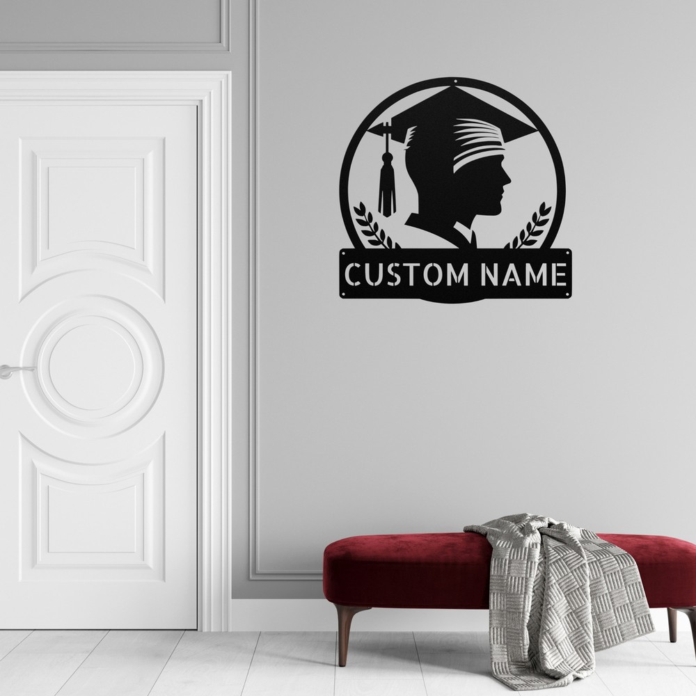 Product Description Personalized Boy Grad Cap Metal Sign Custom Graduation Decor Unique Gift Idea Celebrate a milestone achievement with the Personalized Boy Grad Cap Metal Sign ! This charming sign is a fantastic way to recognize a graduate and add a personal touch to any space. Crafted from 16 gauge high-quality metal , this sign is built to last. The powder coating provides excellent protection, making it dust, weather, and water-resistant for both indoor and outdoor display. Key features include: Customizable Design: Personalize with the graduate’s name and graduation year. Durable Construction: Made from high-quality metal for long-lasting use. Ideal Gift: Perfect for graduations, birthdays, or any special occasion. Stylish Decor: Great addition to home, office, or dorm room decoration. Honor the achievements of a special graduate with the Personalized Boy Grad Cap Metal Sign . It’s not just a decoration; it’s a treasured keepsake celebrating success! Service and Color Choice Our metal signs are designed to be personalized just for you, making them the perfect addition to any space! The default color for our signs is Black , but we also offer a variety of beautiful options including Copper, Gold, White, and Silver . After placing your order, simply contact us with your preferred color choice, and we'll ensure your sign is exactly how you envision it. Let’s create something special together!