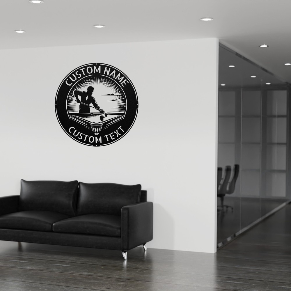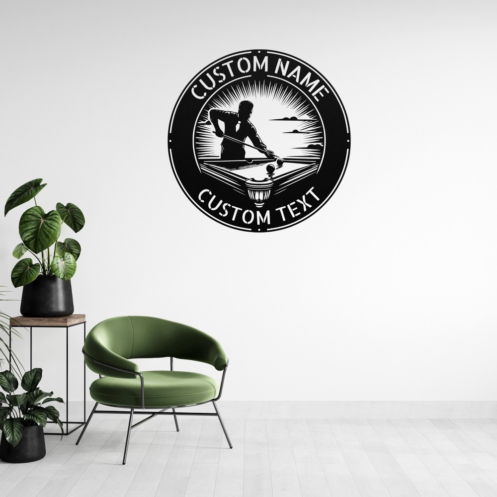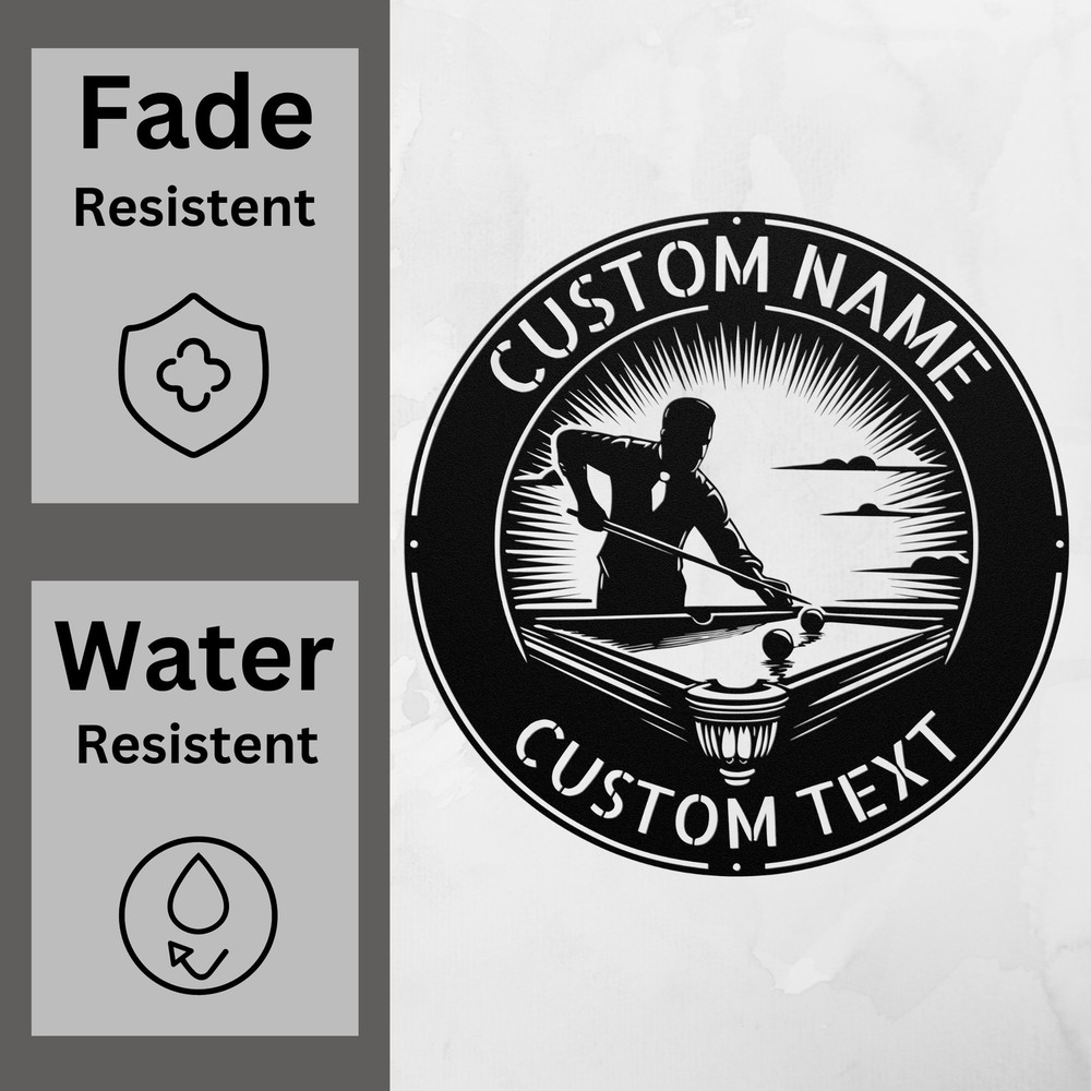 Product Description Personalized Billiards Player Metal Sign Pool Table Wall Decor Custom Art Enhance your game room or home with our Personalized Billiards Player Metal Sign . Crafted from high-quality 16-gauge metal, this custom wall decor is built to last. Its durable powder coating makes it dust, weather, and water resistant, so it’s perfect for both indoor and outdoor use. This unique sign is ideal for billiards enthusiasts and adds a personal touch to any space. Whether you’re decorating your game room, man cave, or office, it brings a stylish flair that celebrates your love for the game. It also makes a great gift for birthdays, Christmas, or any special occasion, ensuring that friends and family will appreciate this thoughtful and customized present. Key Features: Customizable design to reflect your personality Made from 16-gauge high-quality metal for durability Powder-coated finish for dust, weather, and water resistance Suitable for indoor and outdoor display Perfect gift for pool lovers on holidays, birthdays, or special occasions Eye-catching decor that adds character to any room Bring home the Personalized Billiards Player Metal Sign and celebrate your passion for billiards every day! Service and Color Choice Our metal signs are designed to be personalized just for you, making them the perfect addition to any space! The default color for our signs is Black , but we also offer a variety of beautiful options including Copper, Gold, White, and Silver . After placing your order, simply contact us with your preferred color choice, and we'll ensure your sign is exactly how you envision it. Let’s create something special together!