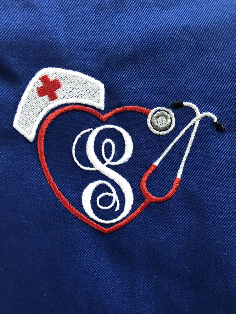 Personalized Navy Blue Apron with a nurse Stethoscope design embroidered. Embroidery: Design is a red stethoscope in a heart shape with a nurse cap and a white letter S. made with high quality MADEIRAUSA thread. Apron: "PORT AUTHORITY" Navy Blue apron one-size-for-all 100% Cotton. Machine wash cold. Made in Vietnam. Features a long secure tie, and three pockets and a pen pocket. Stain Release Technology • Allows stains to be be removed more easily during laundering • Doesn't affect fabric weight or breathability • Maintains color *Polo in photo not included