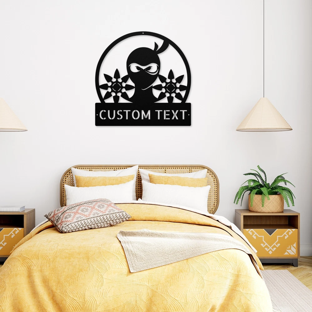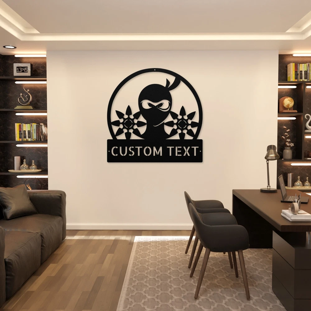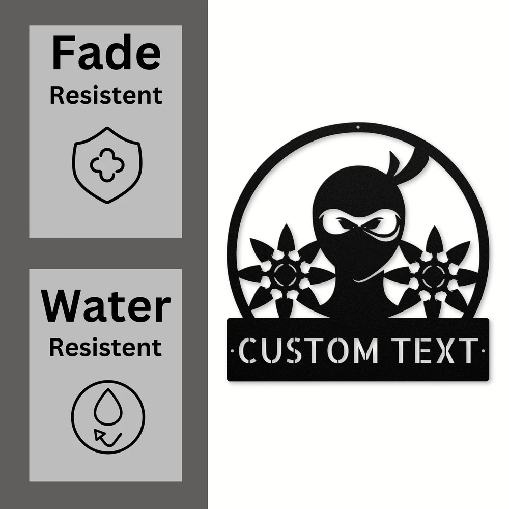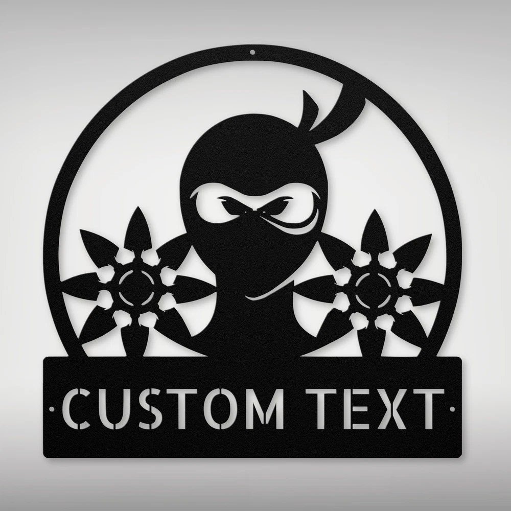 Product Description Custom Ninja Metal Sign - Unique Wall Art for Ninja Fans Unleash your inner warrior with our Custom Ninja Metal Sign ! This striking sign is perfect for anyone who loves martial arts or ninja culture. Made from premium 16 gauge high-quality metal, this sign is not only stylish but also built to last. With a durable powder coating, this sign is resistant to dust, weather, and water, making it suitable for both indoor and outdoor display. You can hang it in your home, office, or dojo to show off your passion for ninjas in a unique way. Plus, you can customize it with a name or special message, adding a personal touch to your decor. This Custom Ninja Metal Sign also makes an excellent gift for birthdays, Christmas, or any other special occasion. It’s a thoughtful present for martial arts enthusiasts, kids who love ninja stories, or anyone who enjoys unique decor. Key Features: Customizable: Personalize with a name or message for a unique touch. Durable Metal: Crafted from high-quality 16 gauge metal for long-lasting use. Weather Resistant: Powder coating protects against dust, water, and fading. Versatile Decor: Perfect for homes, offices, or martial arts studios. Great Gift Idea: Ideal for birthdays, holidays, or any special occasion for ninja lovers. Get your Custom Ninja Metal Sign today and bring a touch of ninja style to your space! Service and Color Choice Our metal signs are designed to be personalized just for you, making them the perfect addition to any space! The default color for our signs is Black , but we also offer a variety of beautiful options including Copper, Gold, White, and Silver . After placing your order, simply contact us with your preferred color choice, and we'll ensure your sign is exactly how you envision it. Let’s create something special together!