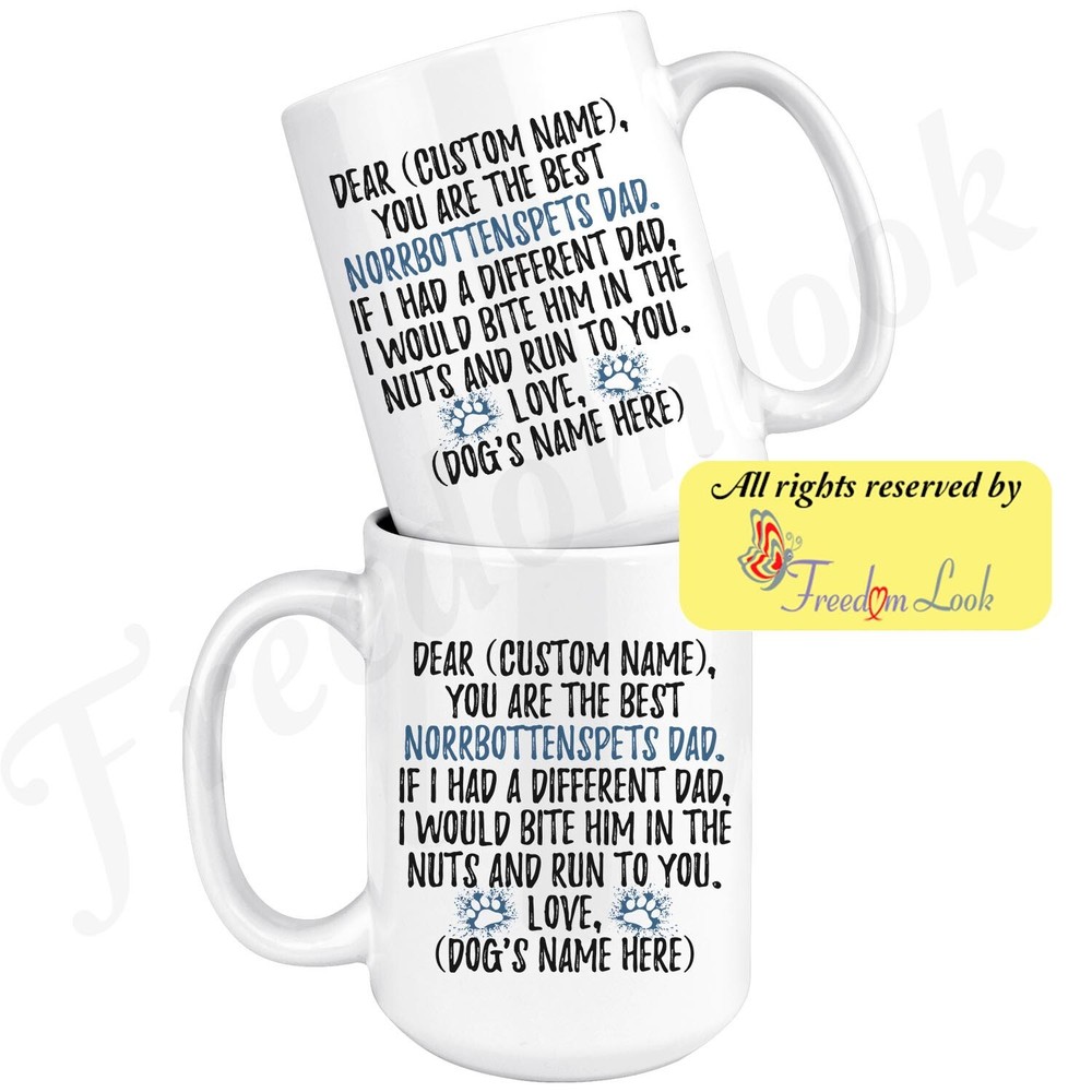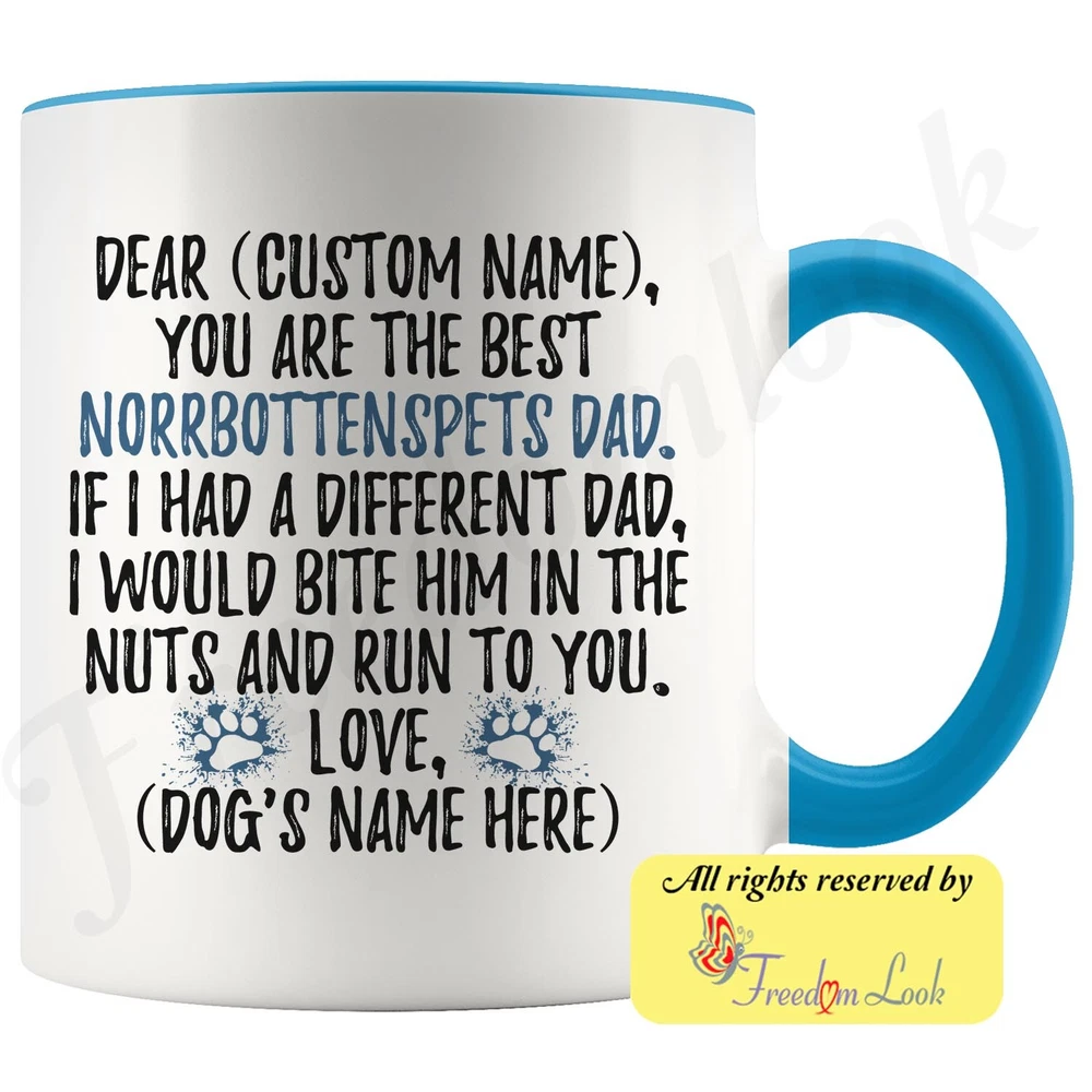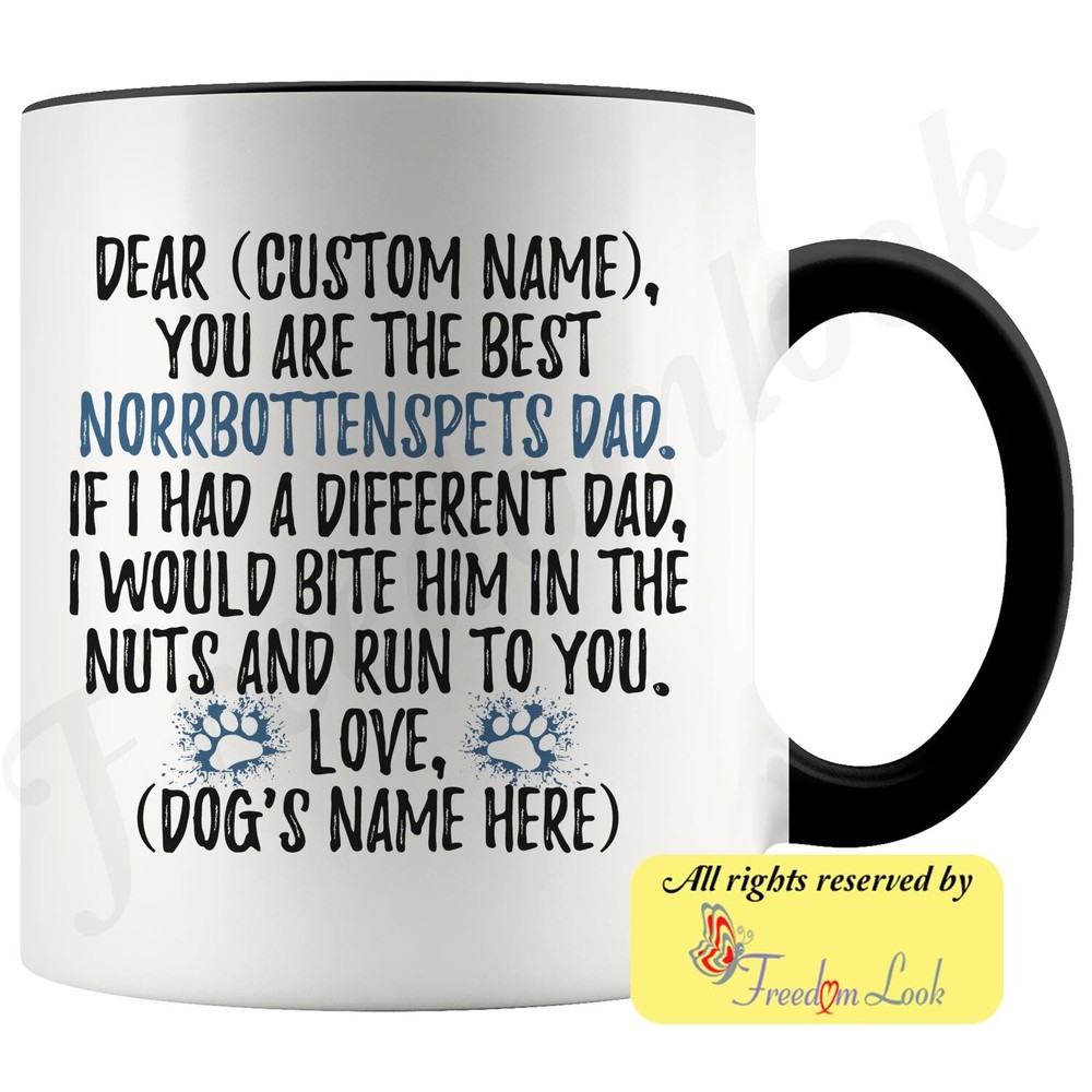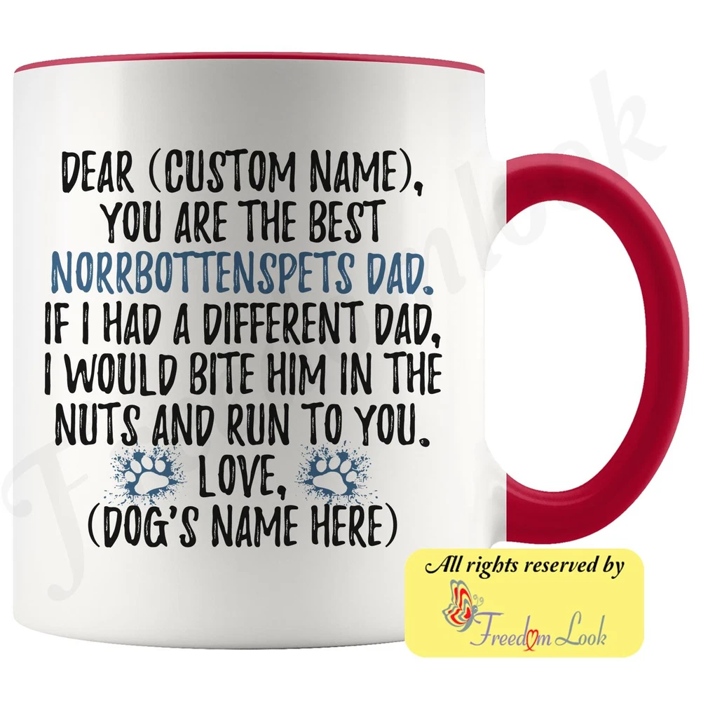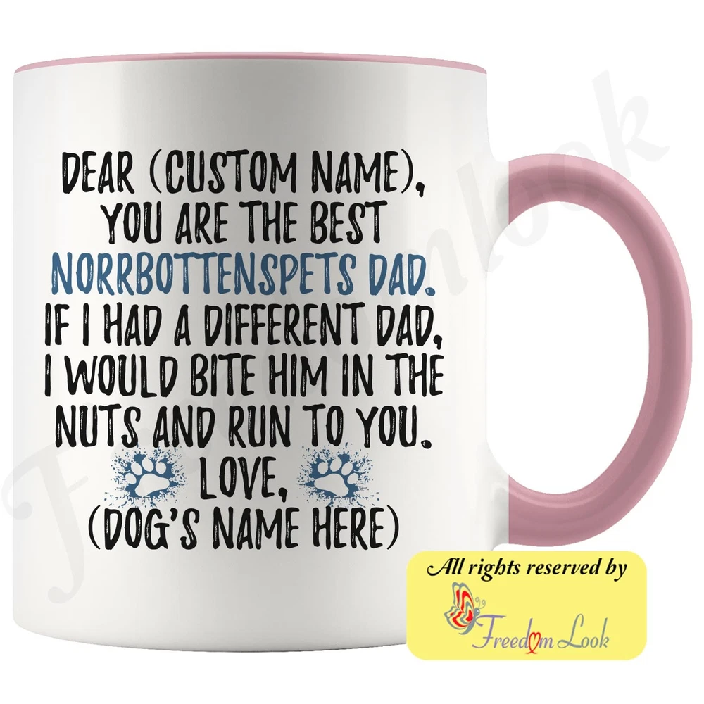 personalized norrbottenspets dog mug, nordic spitz coffee mug, norrbottenspitz gifts, pohjanpystykorva dad present gift, norrbottenspets daddy mug, norrbottenspets dog owner mug, i love dogs, custom dog gifts, dog coffee cup, fathers day gift Are you looking for a great, unique and personalized gift for a dog owner? Search no more and get this mug TODAY. They will be thankful forever. Don't miss it because you'll regret it later by not getting it. This is the perfect coffee mug with content "DEAR 'CUSTOM NAME', YOU ARE THE BEST NORRBOTTENSPETS DAD. IF I HAD A DIFFERENT DAD, I WOULD BITE HIM IN THE NUTS AND RUN TO YOU. LOVE, 'DOG'S NAME HERE' ". CUSTOM DAD'S NAME AND DOG'S NAME Please put the dad's and dog's name in the notes at the checkout or just send us a message. By not doing this, it will delay your order. Example: Dad's name: Bill; Dog's name: Charlie A PERFECT FUNNY GIFT FOR A NORRBOTTENSPETS DOG DAD! This special coffee cup can be a great gift for every Norrbottenspets dad. Sizes: Colored coffee mug size: 11 oz White coffee mug size: 11 oz or 15 oz DISHWASHER AND MICROWAVE SAFE! This version of ceramic mug shows it's true colors with quality assurance to withstand heat in the microwave and put it in the dishwasher as many times as you like, the quality will not be Altered. THE MUG DESIGN IS PRINTED ON BOTH SIDES! No matter if you hold your teacup in your right or left hand, you and everyone else will be able to see this unique design. Looking at this cute coffee mug will put a smile on everyone's face! We want you to be 100% satisfied, so please let us know if there is anything wrong with your order so we can fix it right away. We truly offer the most stunning, unique and trendy highest-quality products in the world. All of our products are custom-made-to-order and handcrafted to the highest quality standards. We stand by our products the quality is outstanding rest assured. Triple check your address , we copy addresses exactly as written, any undeliverable orders due to customer error are not our responsibility. Mug for every day. Christmas birthday brother sister mom mother father dad aunt grandma grandpa girlfriend gift
