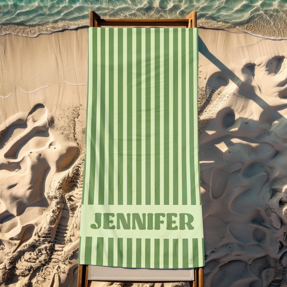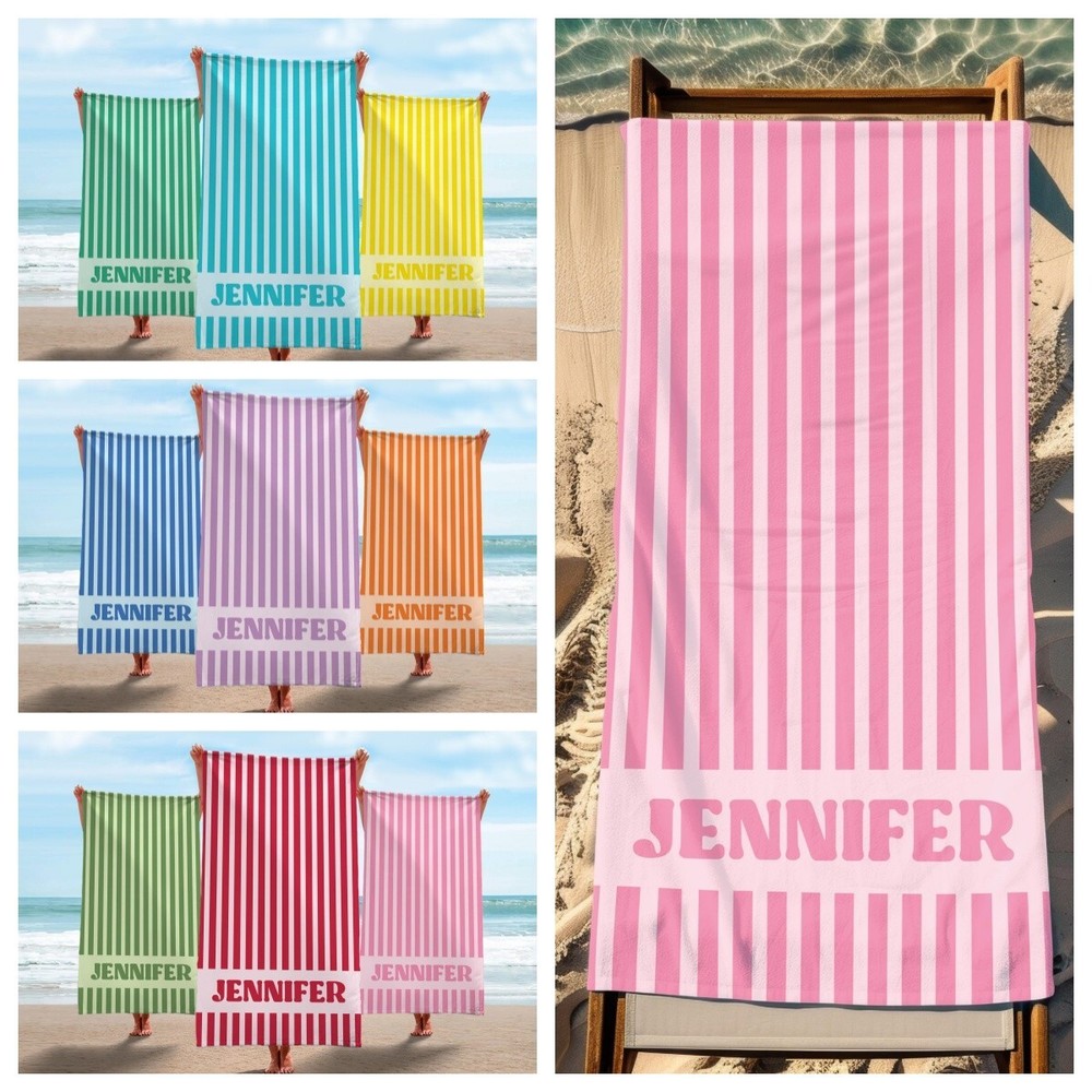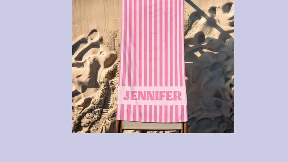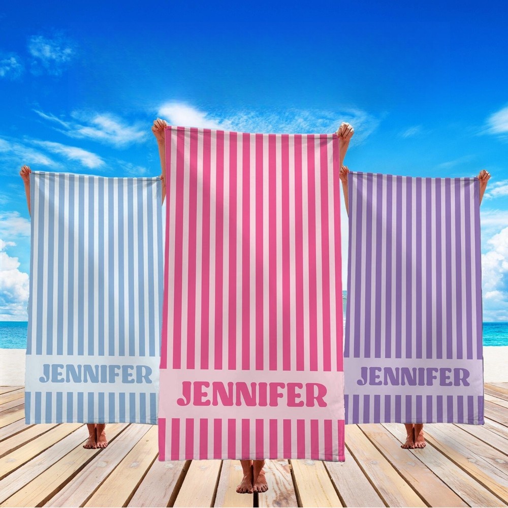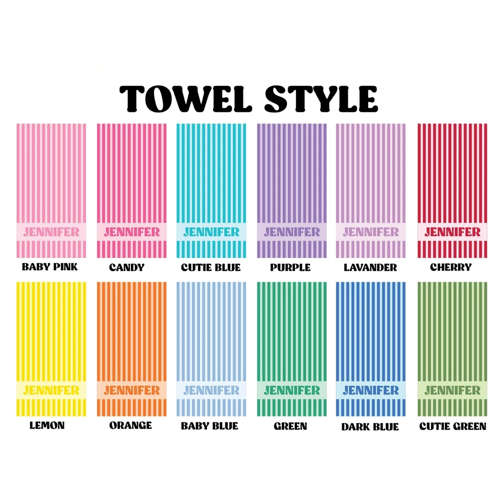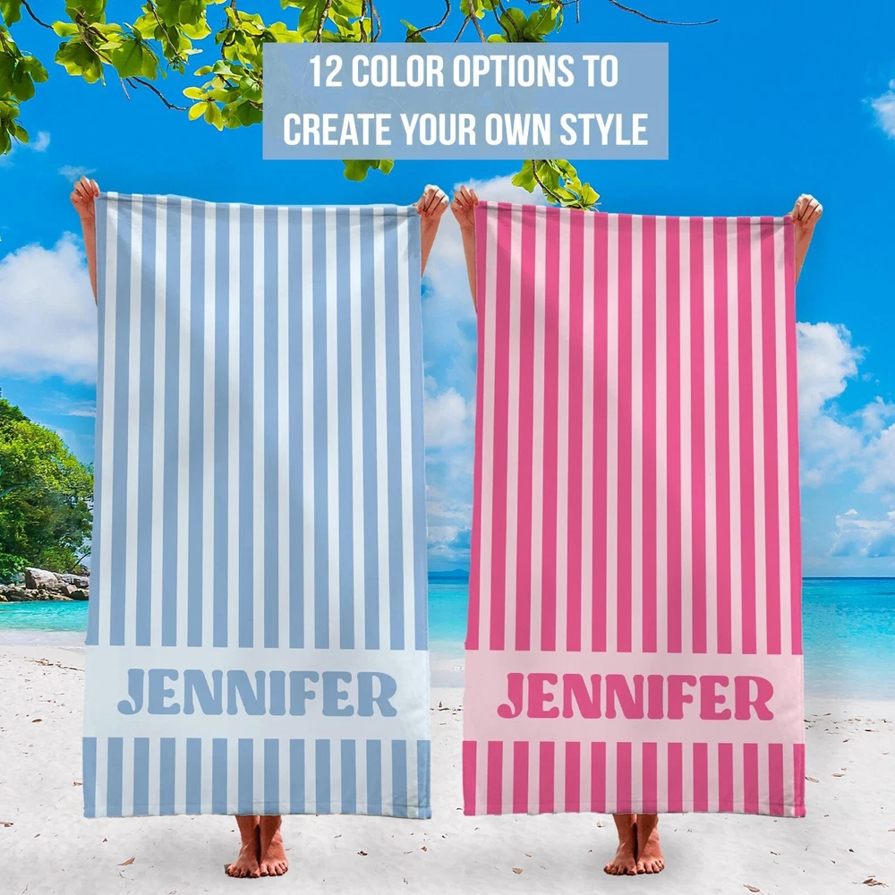 Make a splash at the beach with these vibrant personalized beach towels featuring classic vertical stripes and customizable name designs. Available in 12 eye-catching colors including Baby Pink, Candy, Cutie Blue, Purple, Lavender, Cherry, Lemon, Orange, Baby Blue, Green, Dark Blue, and Cutie Green, these towels let you express your personal style. The Microfiber construction offers quick-drying performance and excellent sand resistance, making these towels perfect for beach days, pool parties, or summer vacations. Each towel comes beautifully customized with your chosen name prominently displayed in a matching color scheme. The bold striped pattern adds a timeless touch while helping you easily spot your towel on busy beaches. These versatile towels make thoughtful personalized gifts for birthdays, summer celebrations, or family beach trips. The durable fabric blend maintains its color and shape through repeated use and washing, ensuring your personalized towel remains a beach day essential for seasons to come.