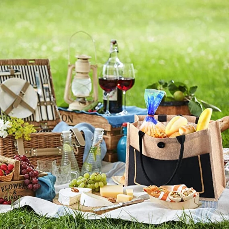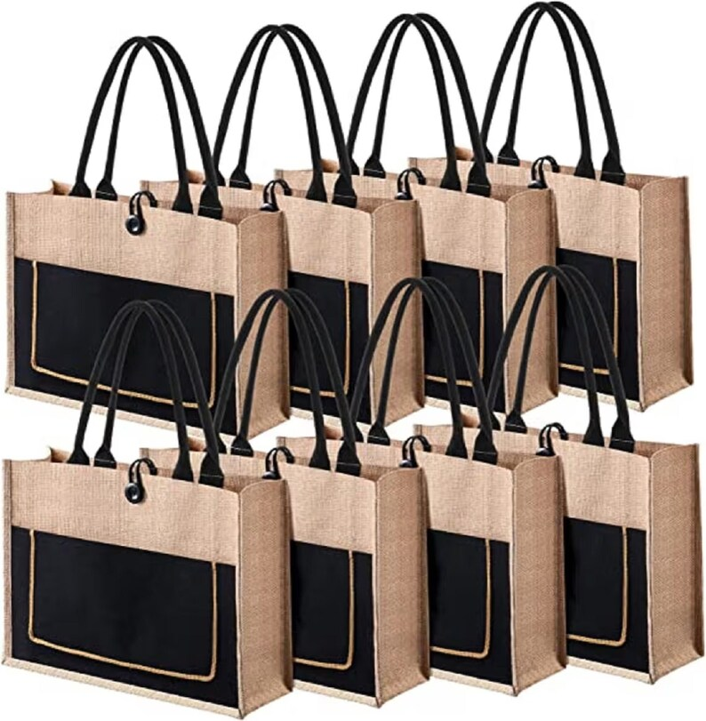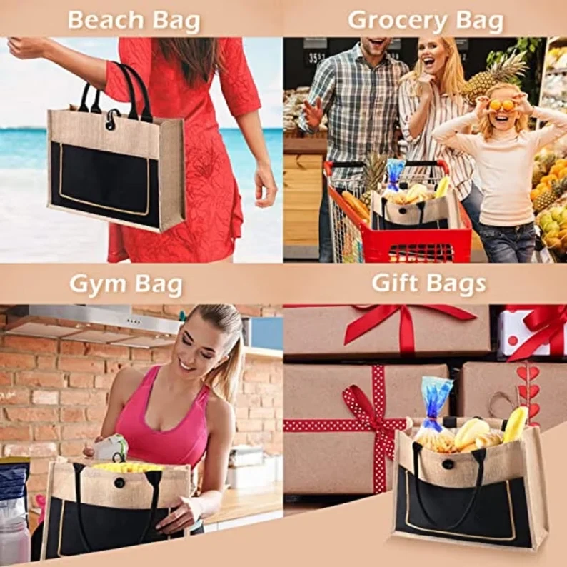 BAG FABRIC :- Burlap POCKET FABRIC :- Cotton SIZE :- Small Size :- 12"x 14" inch Large Size :- 14"x 16" inch FORDABLE & STAND-UP:-The cute beach tote bag is fordable and lightweight, it can be easily kept in your car or home. The bag can keep straight and stand upright when it's open up which make shopping more conveniently. DURABILITY:-The jute tote bag is made of burlap which is very heavy duty and durable, it can be used as reusable grocery bag or for daily use. The sturdy handles are fully stitched and soft, it is comfortable to hang on the arm or slung on the shoulder. MULTIPLE USES:-With the stylish appearance and large capacity, the summer bag can also be used as carry on and as beach bag, travel bag, picnic bag. Also It's big enough to carry laptop.The side front cotton pocket can contain your cellphone,keys,wallet and purse bag.