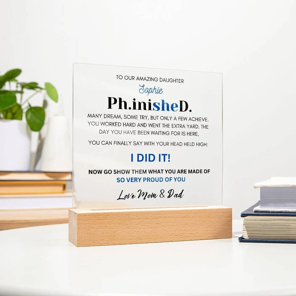 🎓 What a perfect keepsake to highlight the achievement of a PHD! This is a graduation gift that your daughter or son will cherish for years to come. 🎓 Our premium acrylic custom plaque makes a stunning and unique personalized gift for a PHD graduate. Surprise them with this gorgeous gift today! It is superbly printed on our high-quality acrylic, allowing the recipient to display your message on a shelf, desk, or anywhere they wish and reminding them every day how proud you are. R E A D Y • F O R • G I V I N G • P L A Q U E & S T AN D Create a memorable presentation when you upgrade to the LED wooden base! 📍Product specifications: ▪ Premium acrylic ▪ Size with wooden base: 6.5" (165mm) height x 6.5" (165mm) width ▪ Acrylic Depth: 0.1" (5mm) ▪ Wooden base: 1.2" (30mm) height x 6.5" (165mm) width x 1.8" (45mm) depth ▪ Battery-Powered CORDLESS LED Base uses a single button to customize light options with an On / Off switch located on the bottom of base ▪ Corded LED Base uses an attached controller to customize light options with Long USB cord with LED Controller, ▪ Both options have 7 colors, 3 modes, and 5 levels of brightness ▪ Sharp, detailed printed design ▪ Ships from USA