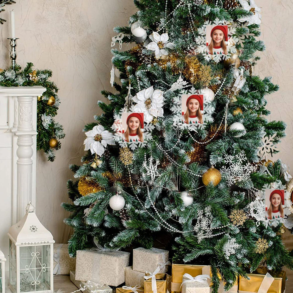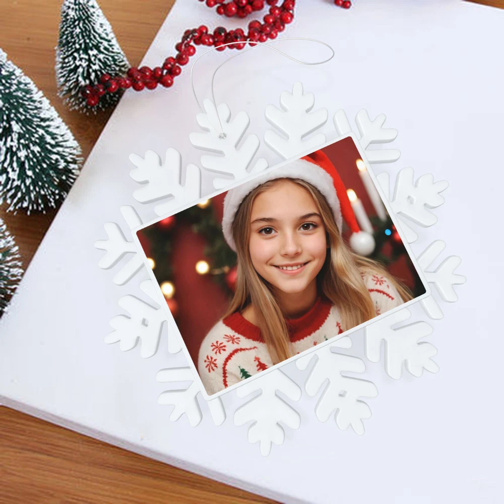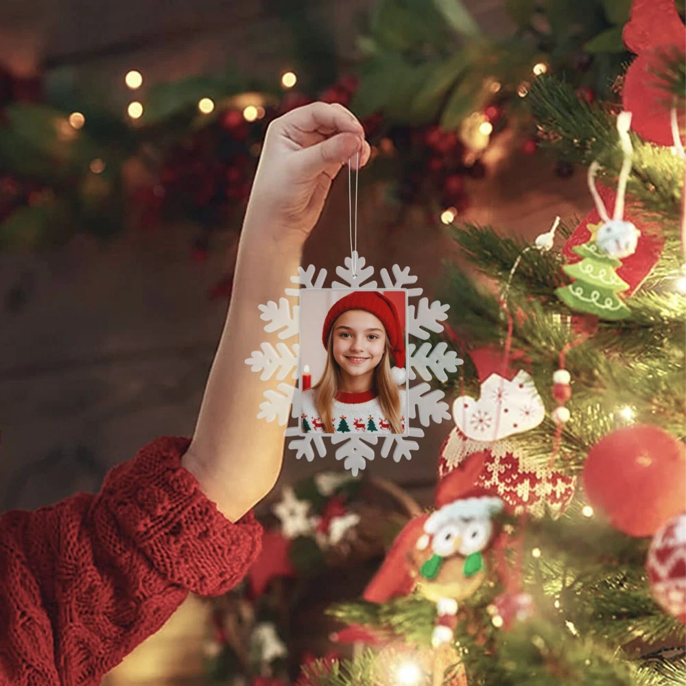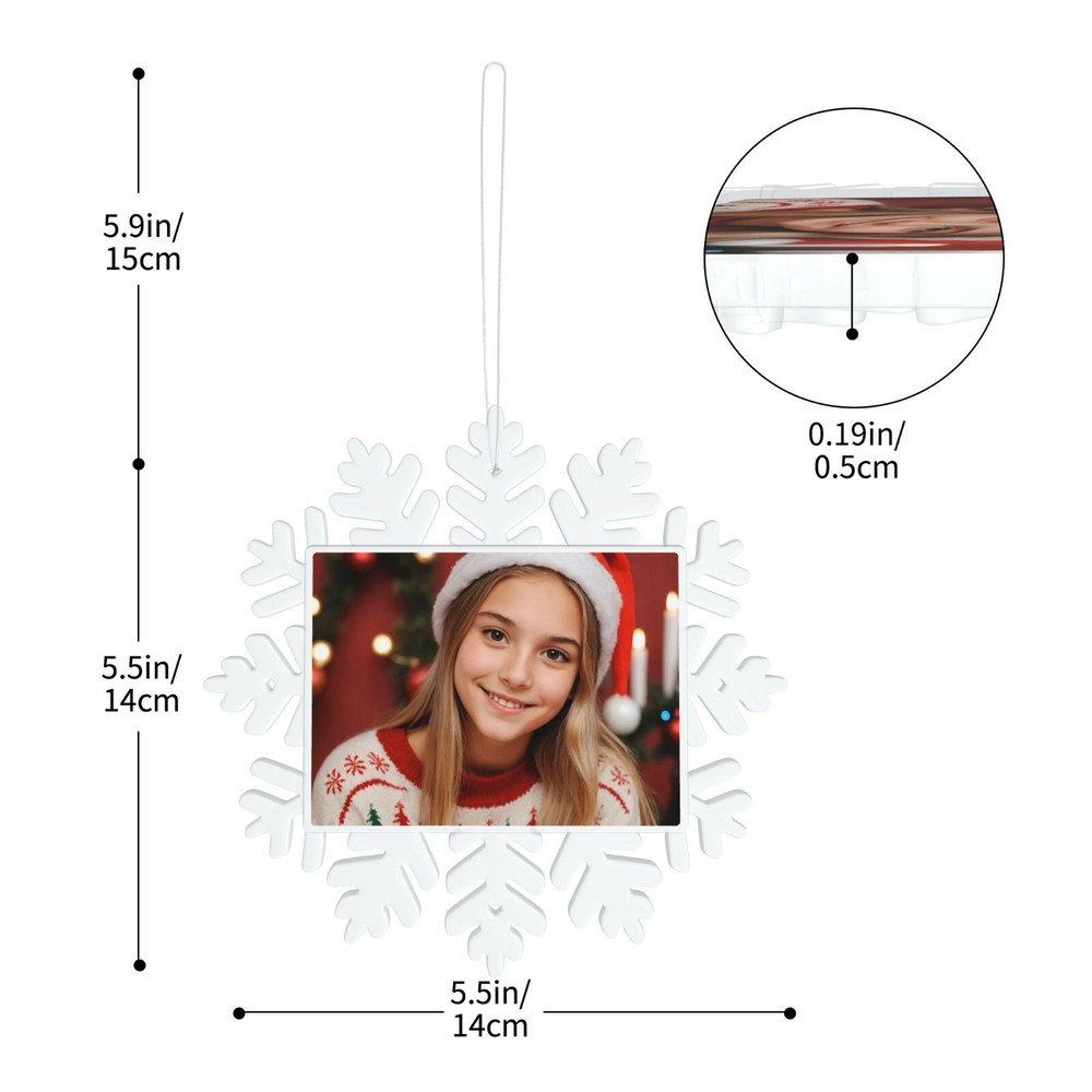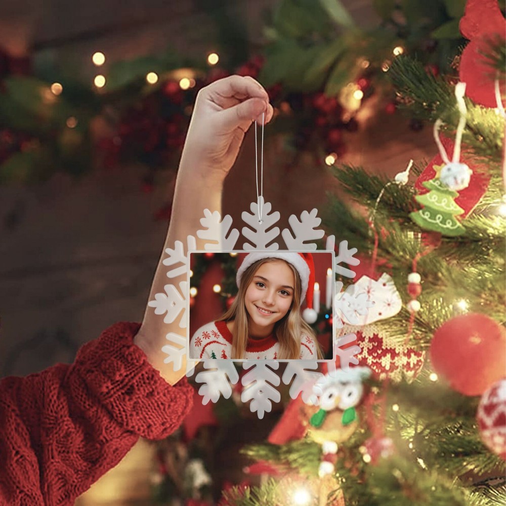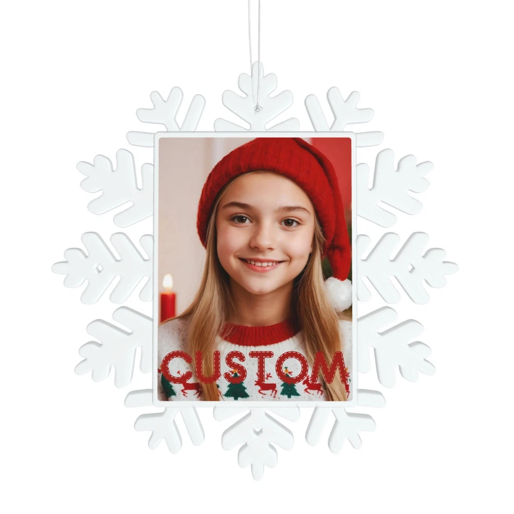 How to customize the Christmas ornament: Step 1: Please click "Buy It Now" or "Add to cart", and complete the payment. Step 2: Please send your custom photo via "eBay message". Make your Christmas tree uniquely memorable with our beautiful personalized photo ornament. Crafted in a stunning snowflake shape, this ornament features an elegant cut-out snowflake design around the edges, framing your cherished photo in the center. The clear plastic material and intricate snowflake cutouts create a magical winter wonderland effect, making your special memories shine. Whether it's a family portrait, a baby's first Christmas, or a special moment you want to remember, this ornament will become a treasured keepsake that brings joy year after year. This custom photo ornament also makes a thoughtful and heartwarming Christmas gift for family and friends, sure to surprise them and add a special touch to their holiday decorations. Premium Material: Made from a combination of durable transparent plastic and a sturdy aluminum insert, this ornament ensures longevity and a modern, sleek look for your Christmas tree décor. Perfect Size: Measuring 5.5 inches by 5.5 inches, it's large enough to showcase your favorite photo while still fitting perfectly on your tree. Elegant Design: The intricate snowflake shape, paired with a silver hanging ribbon, adds a touch of festive elegance to any holiday setting. Crystal Clear Printing: High-resolution photo printing ensures sharp, vivid image quality.