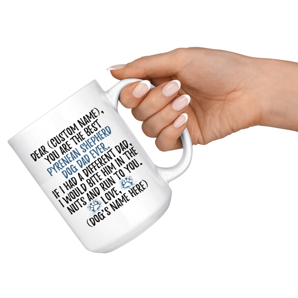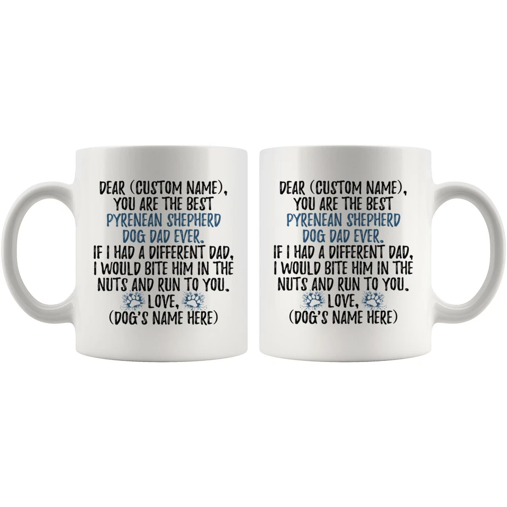 personalized pyrenean shepherd mug, berger des pyr??n??es coffee mug, petit berger dog gifts, pyrenees sheepdog dad present gift, pyr shep dog daddy mug, pyrenean shepherd owner mug, i love pyrenean shepherd, custom pyrenean shepherd gift, dog coffee cup, fathers day gift This is the perfect coffee mug with content "DEAR 'CUSTOM NAME', YOU ARE THE BEST PYRENEAN SHEPHERD DOG DAD EVER. IF I HAD A DIFFERENT DAD, I WOULD BITE HIM IN THE NUTS AND RUN TO YOU. LOVE, 'DOG'S NAME HERE' ". CUSTOM DAD'S NAME AND DOG'S NAME Please put the dad's name and dog's name in the notes at the checkout or send us a message. By not doing this, it will delay your order. Example: Dad's Name: Bill; Dog's name: Charlie PERFECT FUNNY GIFT FOR A PYRENEAN SHEPHERD DOG DAD! This special coffee cup can be a great gift for every Pyrenean Shepherd dad. DISHWASHER AND MICROWAVE SAFE! This version of ceramic mug shows it's true colors with quality assurance to withstand heat in the microwave and put it in the dishwasher as many times as you like, the quality will not be Altered. THE MUG DESIGN IS PRINTED ON BOTH SIDES! No matter if you hold your teacup in your right or left hand, you and everyone else will be able to see this unique design. Looking at this cute coffee mug will put a smile on everyone's face! We want you to be 100% satisfied, so please let us know if there is anything wrong with your order so we can fix it right away.