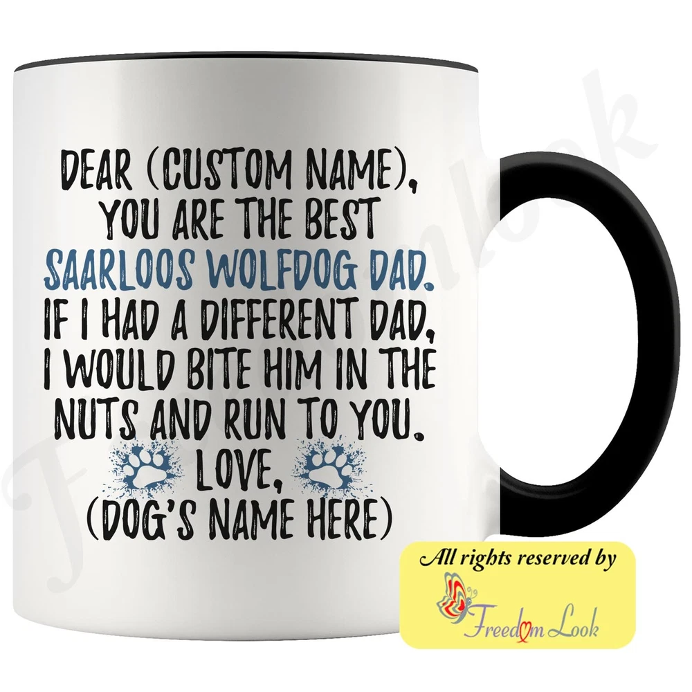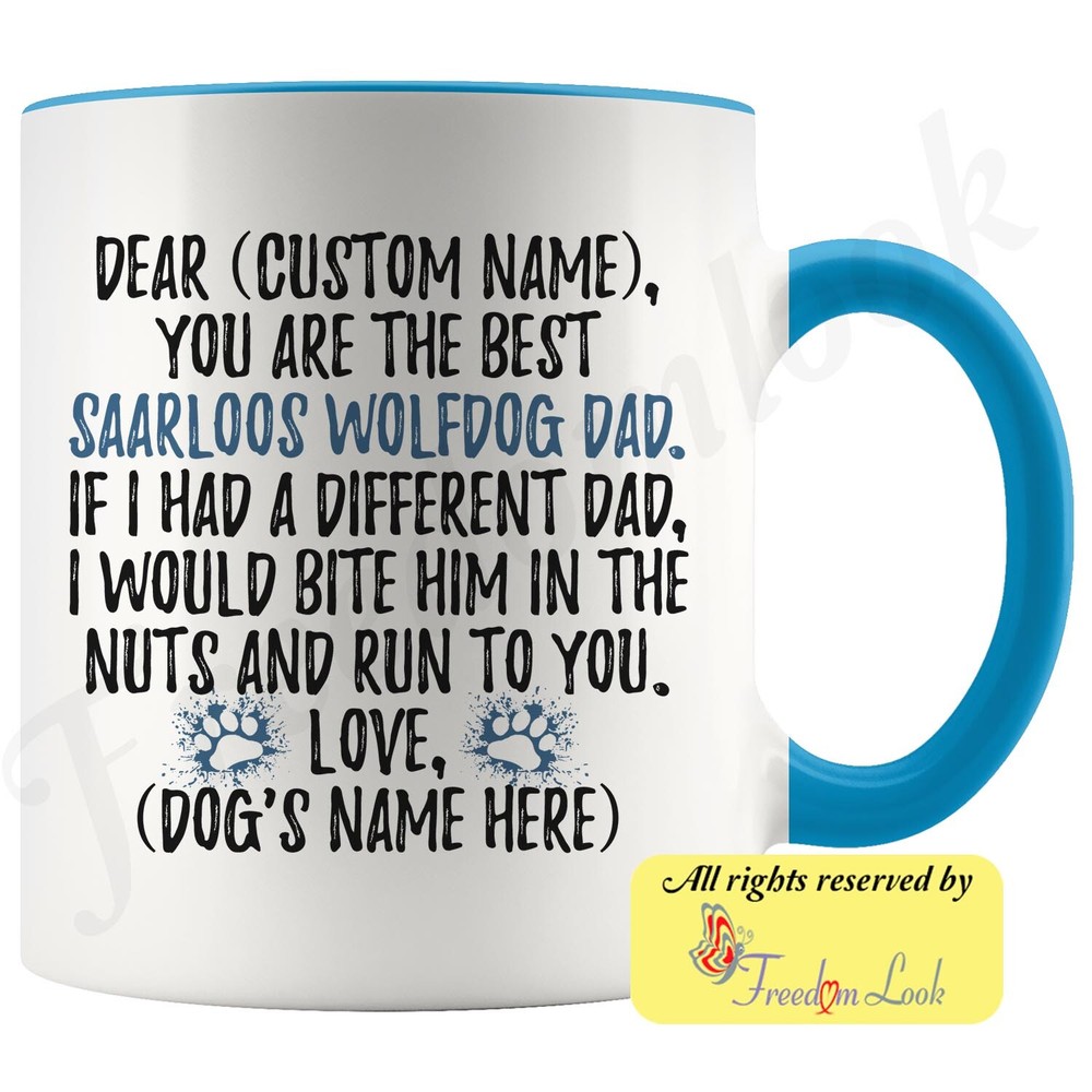 personalized saarloos wolfdog dog mug, saarloos wolfhound coffee mug, saarloos wolfdog gifts, saarloos wolfdog dad present gift, saarloos wolfdog daddy mug, saarloos wolfdog owner, i love saarloos wolfdog, custom dog gift, dog coffee cup, fathers day gift Are you looking for a great, unique and personalized gift for a dog owner? Search no more and get this mug TODAY. They will be thankful forever. Don't miss it because you'll regret it later by not getting it. This is the perfect coffee mug with content "DEAR 'CUSTOM NAME', YOU ARE THE BEST SAARLOOS WOLFDOG DAD. IF I HAD A DIFFERENT DAD, I WOULD BITE HIM IN THE NUTS AND RUN TO YOU. LOVE, 'DOG'S NAME HERE' ". CUSTOM DAD'S NAME AND DOG'S NAME Please put the dad's and dog's name in the notes at the checkout or just send us a message. By not doing this, it will delay your order. Example: Dad's name: Bill; Dog's name: Charlie A PERFECT FUNNY GIFT FOR A SAARLOOS WOLFDOG DAD! This special coffee cup can be a great gift for every Saarloos Wolfdog dad. Sizes: Colored coffee mug size: 11 oz White coffee mug size: 11 oz or 15 oz DISHWASHER AND MICROWAVE SAFE! This version of ceramic mug shows it's true colors with quality assurance to withstand heat in the microwave and put it in the dishwasher as many times as you like, the quality will not be Altered. THE MUG DESIGN IS PRINTED ON BOTH SIDES! No matter if you hold your teacup in your right or left hand, you and everyone else will be able to see this unique design. Looking at this cute coffee mug will put a smile on everyone's face! We want you to be 100% satisfied, so please let us know if there is anything wrong with your order so we can fix it right away. We truly offer the most stunning, unique and trendy highest-quality products in the world. All of our products are custom-made-to-order and handcrafted to the highest quality standards. We stand by our products the quality is outstanding rest assured. Triple check your address , we copy addresses exactly as written, any undeliverable orders due to customer error are not our responsibility. Mug for every day. Christmas birthday brother sister mom mother father dad aunt grandma grandpa girlfriend gift