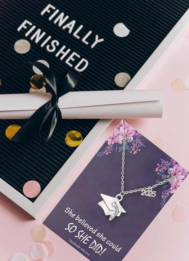 Personalized Graduation Cap Necklace for Her,Class of 2025,Fashion silver Product Details Package Dimensions : 3.66 x 2.72 x 0.31 inches; 0.63 ounces Department : 2025 Personalized Graduation Gifts for Her Him,Dainty Graduation Bracelets with Graduation Card,class of 2025,Gradaution Gifts for College/Master Degree/Phd 2025 Graduation Gifts for Her:Finding a cool graduation gifts for her?This graduation cap necklace is your choice Customized Graduation Necklace:This graduation pendant necklace offer graduation cap pendant,a 2025 pendant,a gift card,very fashionable and meaningful graduation gift in 2025 Personalized Gift Card:This dainty graduation necklace offer an elegant graduation gift card,so impressing graduation gifts Wide Graduation Gift Occasion:This graduation pendant necklace pack fit for all graduation occasions,like high school graduation gifts,college graduation gifts,nursing graduation gifts,8th grade graduation gifts,masters degree graduation gifts,5th grade graduation gifts,Phd graduation gifts... Material:This graduation pendant necklace is made of stainless steel,a gift card.If you have any problem,please feel free to contact us any time. Personalized Graduation Cap Necklace for Her,Class of 2025,Fashion Pendant Necklace for Her,Graduation Gifts for High School/College/8th Grade/Nursing/5th Grade/Masters Degree/Phd