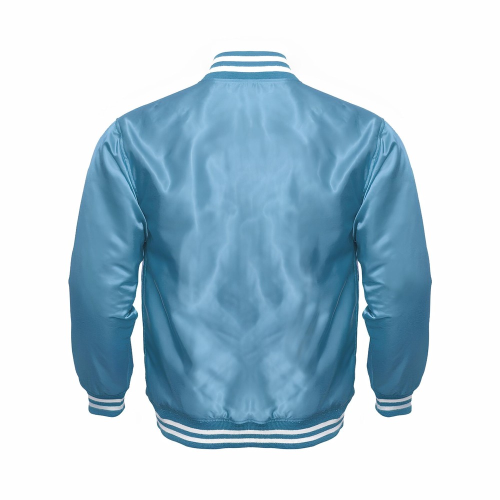 VARSITY/BASEBALL JACKET Sky Blue Satin - Baseball Jacket Varsity Jacket Letterman Jacket – Available in All Sizes We specialize in crafting personalized jackets featuring intricate embroidery and custom patches, designed to perfectly match your style and specifications. Product Description : This listing is for a beautiful well made Authentic Letterman Jacket Comes with Satin Specification : The varsity jacket is expertly crafted from premium-quality 100% satin for both the body and sleeves, ensuring a sleek and stylish finish. Varsity Jacket with 2 Front Side Pockets and 1 Interior Pocket Polyester Quilted Padded Lining for Superior Warmth and Insulation Soft-Shell Rib Knit Cuffs, Collar, and Bottom for Skin Protection We are confident that the exceptional quality and remarkable design of our products will exceed your expectations.