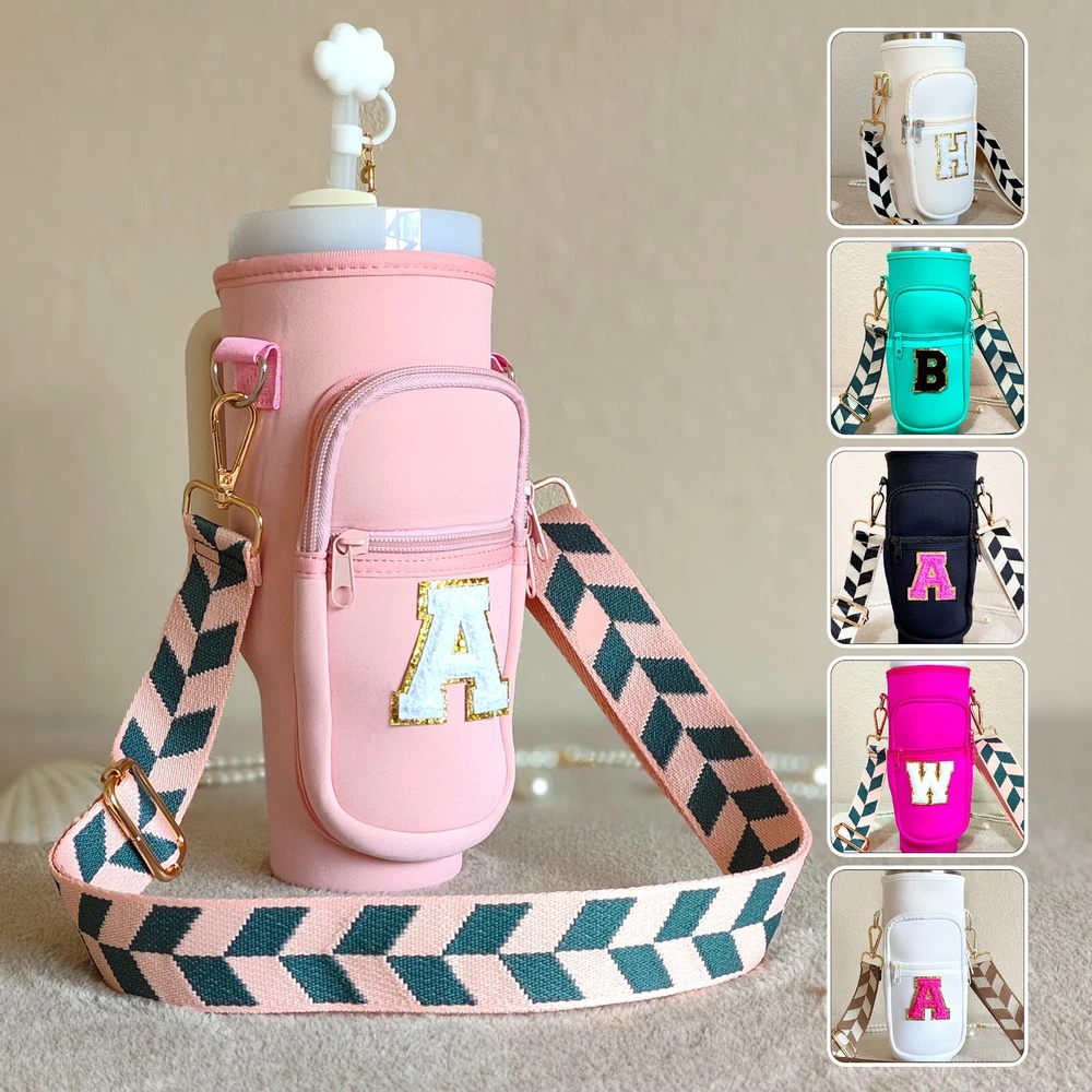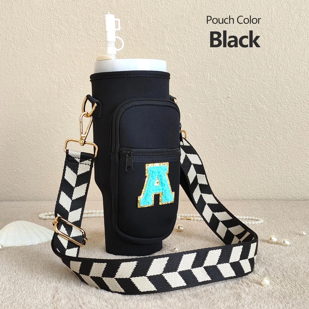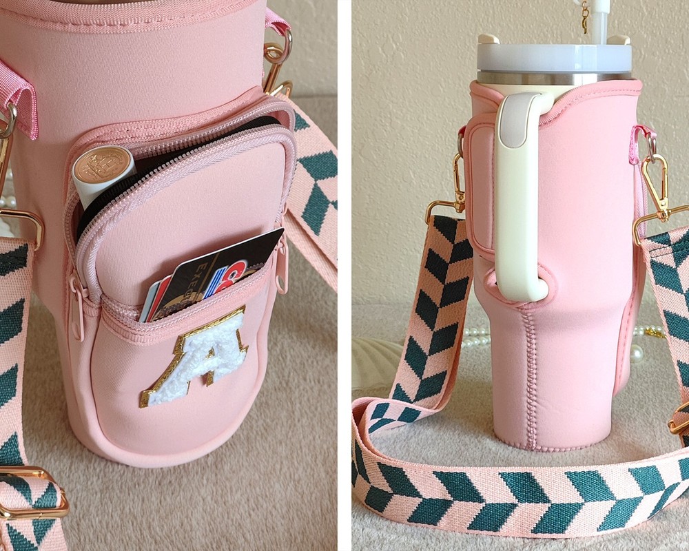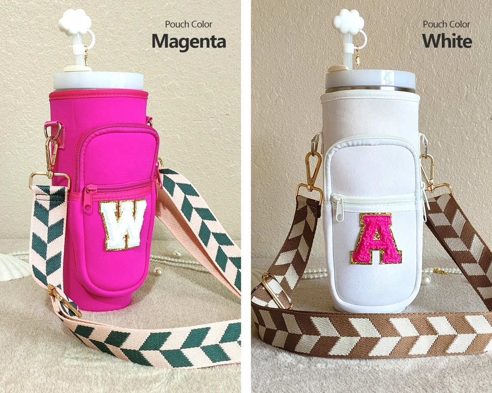 Specify letter color, or go with white by default. Meet our awesome Handcrafted Tumbler Pouch! The perfect accessory to add a touch of personality to your on-the-go style! Whether you're looking for a cute way to accessorize your tumbler or need a hands-free solution for your essentials, our personalized tumbler bag has you covered. Key Features: 🌈 Customizable with Chenille Patches for a unique touch. 🎨 Choose from various pouch and letter colors to suit your style. 🧳 Versatile and compact design – great for travel, outings, and more. πŸ”„ Adjustable shoulder strap ,various styles for you to choose from, fits 40oz tumblers securely. πŸ›οΈ Perfect for carrying hotel keys, car keys, tiny bottles, lip gloss, money, credit cards, and more. Material & Size: 🌟 Made from soft neoprene polyester fabric, water-resistant and durable. πŸ“ Pouch size: Sleeve: 9.65in x 3.9in. Outer specs of front pocket: 5.5in x 3.55in 🏷 Chenille letter height: Around 2.16 inches, width varies between 2.36" to 1.57". πŸ“ Strap size: Adjustable length (including snap hooks): minimum 28.5" & maximum 49.2" Personalization Options: 🌈 Select your preferred pouch color. ✨ Select your preferred strap style. πŸ“ Specify the letter and its color in the personalization box for a unique Patch. How to Care: 🧼 Wipe clean with gentle cleaners for easy maintenance. Add a splash of color and style to your tumbler experience with our versatile and chic Tumbler Pouch – the perfect accessory for any adventure!