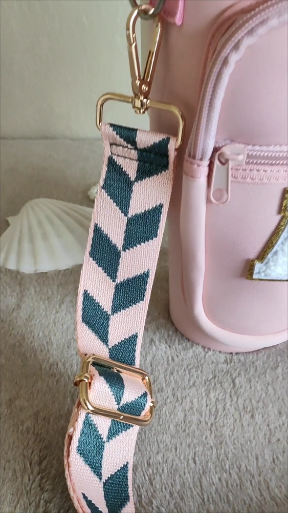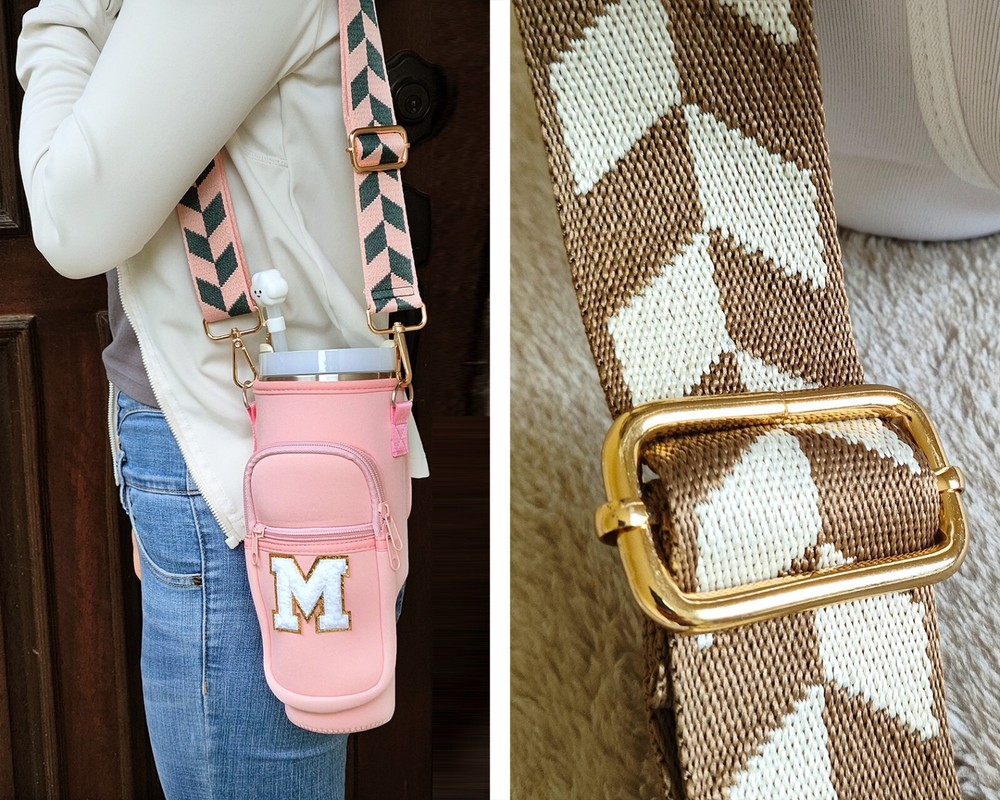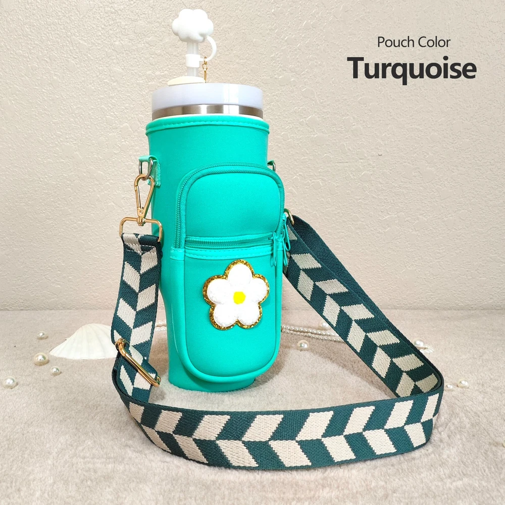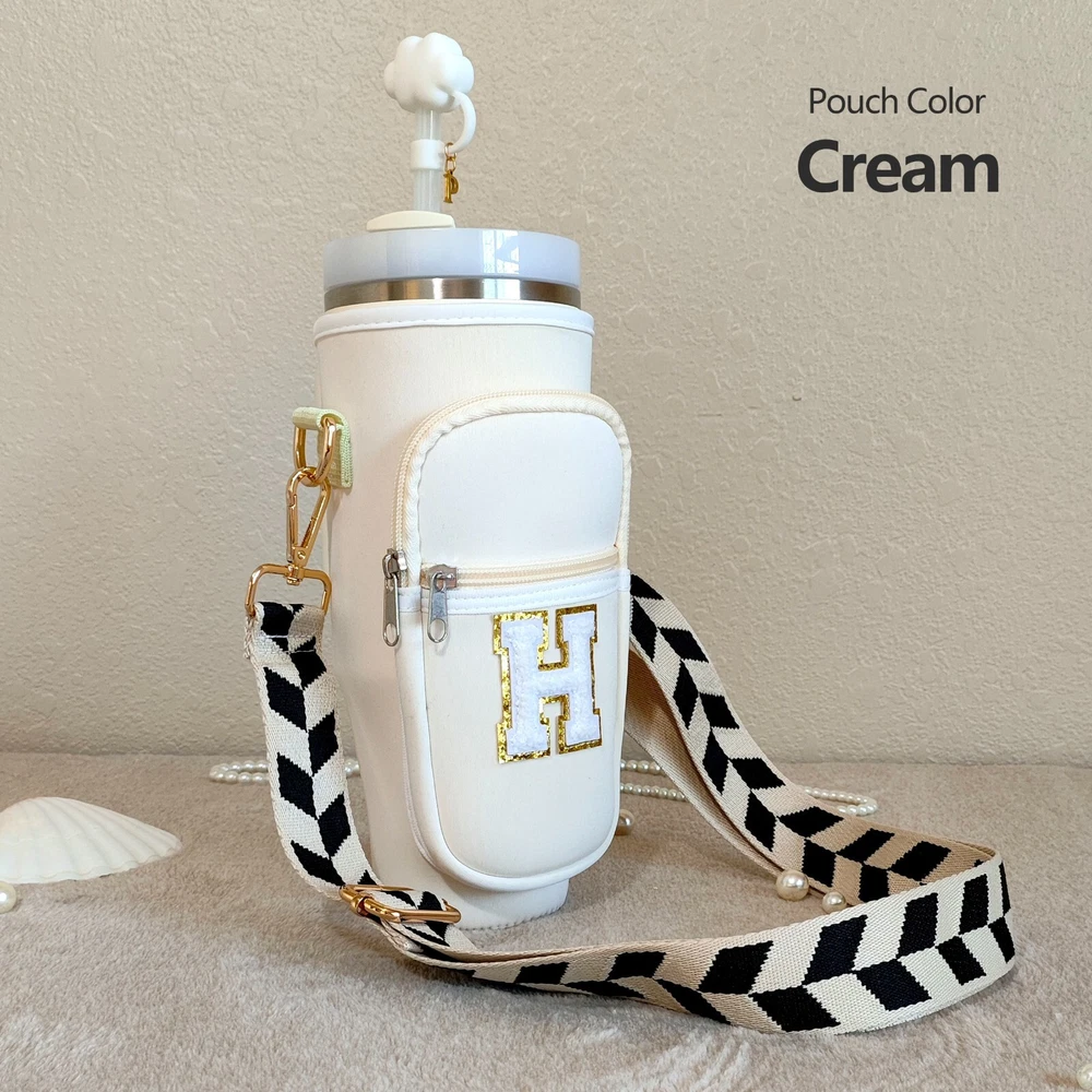 Specify letter color, or go with white by default. Meet our awesome Handcrafted Tumbler Pouch! The perfect accessory to add a touch of personality to your on-the-go style! Whether you're looking for a cute way to accessorize your tumbler or need a hands-free solution for your essentials, our personalized tumbler bag has you covered. Key Features: 🌈 Customizable with Chenille Patches for a unique touch. 🎨 Choose from various pouch and letter colors to suit your style. 🧳 Versatile and compact design – great for travel, outings, and more. πŸ”„ Adjustable shoulder strap ,various styles for you to choose from, fits 40oz tumblers securely. πŸ›οΈ Perfect for carrying hotel keys, car keys, tiny bottles, lip gloss, money, credit cards, and more. Material & Size: 🌟 Made from soft neoprene polyester fabric, water-resistant and durable. πŸ“ Pouch size: Sleeve: 9.65in x 3.9in. Outer specs of front pocket: 5.5in x 3.55in 🏷 Chenille letter height: Around 2.16 inches, width varies between 2.36" to 1.57". πŸ“ Strap size: Adjustable length (including snap hooks): minimum 28.5" & maximum 49.2" Personalization Options: 🌈 Select your preferred pouch color. ✨ Select your preferred strap style. πŸ“ Specify the letter and its color in the personalization box for a unique Patch. How to Care: 🧼 Wipe clean with gentle cleaners for easy maintenance. Add a splash of color and style to your tumbler experience with our versatile and chic Tumbler Pouch – the perfect accessory for any adventure!