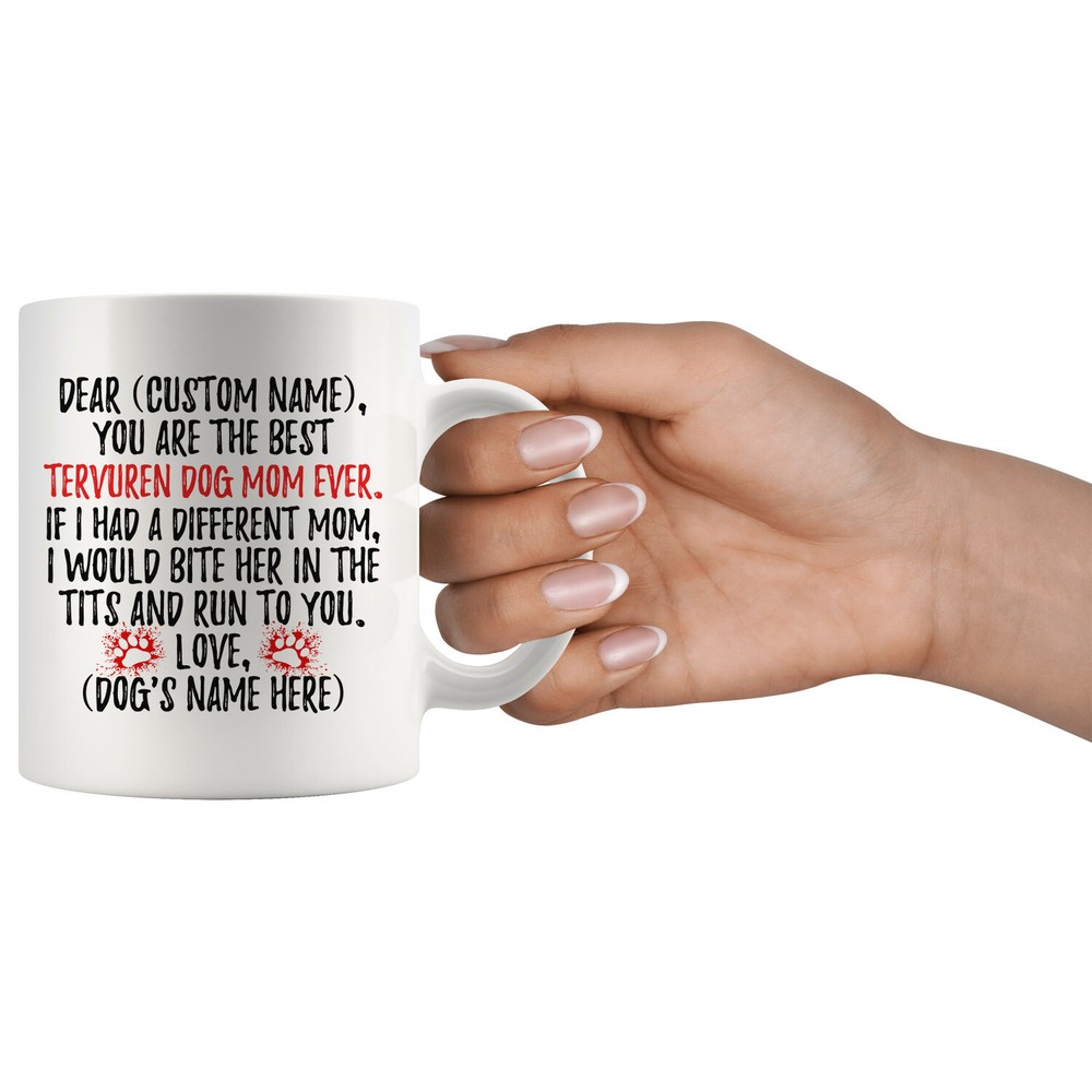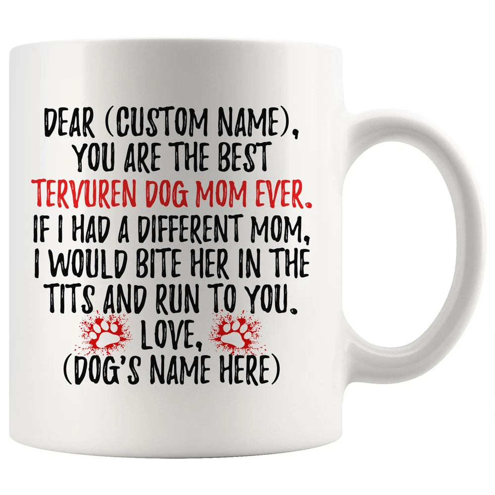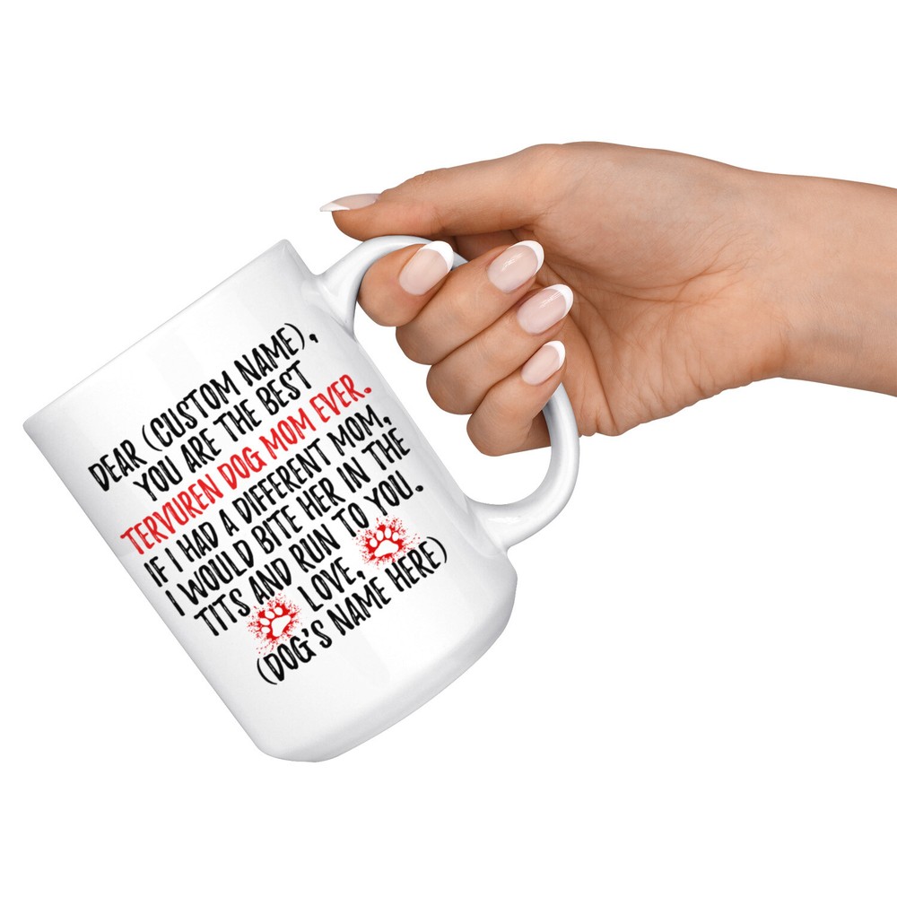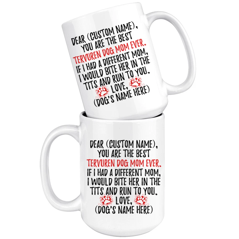 personalized tervuren dog mug, belgian tervuren coffee mug, chien de berger belge dog gifts, tervuren dog mom present gift, tervuren dog mommy mug, tervuren dog owner mug, i love tervuren dog, custom tervuren dog gift, dog coffee cup, mothers day gift This is the perfect coffee mug with content "DEAR 'CUSTOM NAME', YOU ARE THE BEST TERVUREN DOG MOM EVER. IF I HAD A DIFFERENT MOM, I WOULD BITE HER IN THE TITS AND RUN TO YOU. LOVE, 'DOG'S NAME HERE' ". CUSTOM MOM'S NAME AND DOG'S NAME Please put the mom's name and dog's name in the notes at the checkout or send us a message. By not doing this, it will delay your order. Example: Mom's Name: Mary; Dog's name: Charlie PERFECT FUNNY GIFT FOR A TERVUREN DOG MOM! This special coffee cup can be a great gift for every Tervuren dog mom. DISHWASHER AND MICROWAVE SAFE! This version of ceramic mug shows it's true colors with quality assurance to withstand heat in the microwave and put it in the dishwasher as many times as you like, the quality will not be Altered. THE MUG DESIGN IS PRINTED ON BOTH SIDES! No matter if you hold your teacup in your right or left hand, you and everyone else will be able to see this unique design. Looking at this cute coffee mug will put a smile on everyone's face! We want you to be 100% satisfied, so please let us know if there is anything wrong with your order so we can fix it right away.