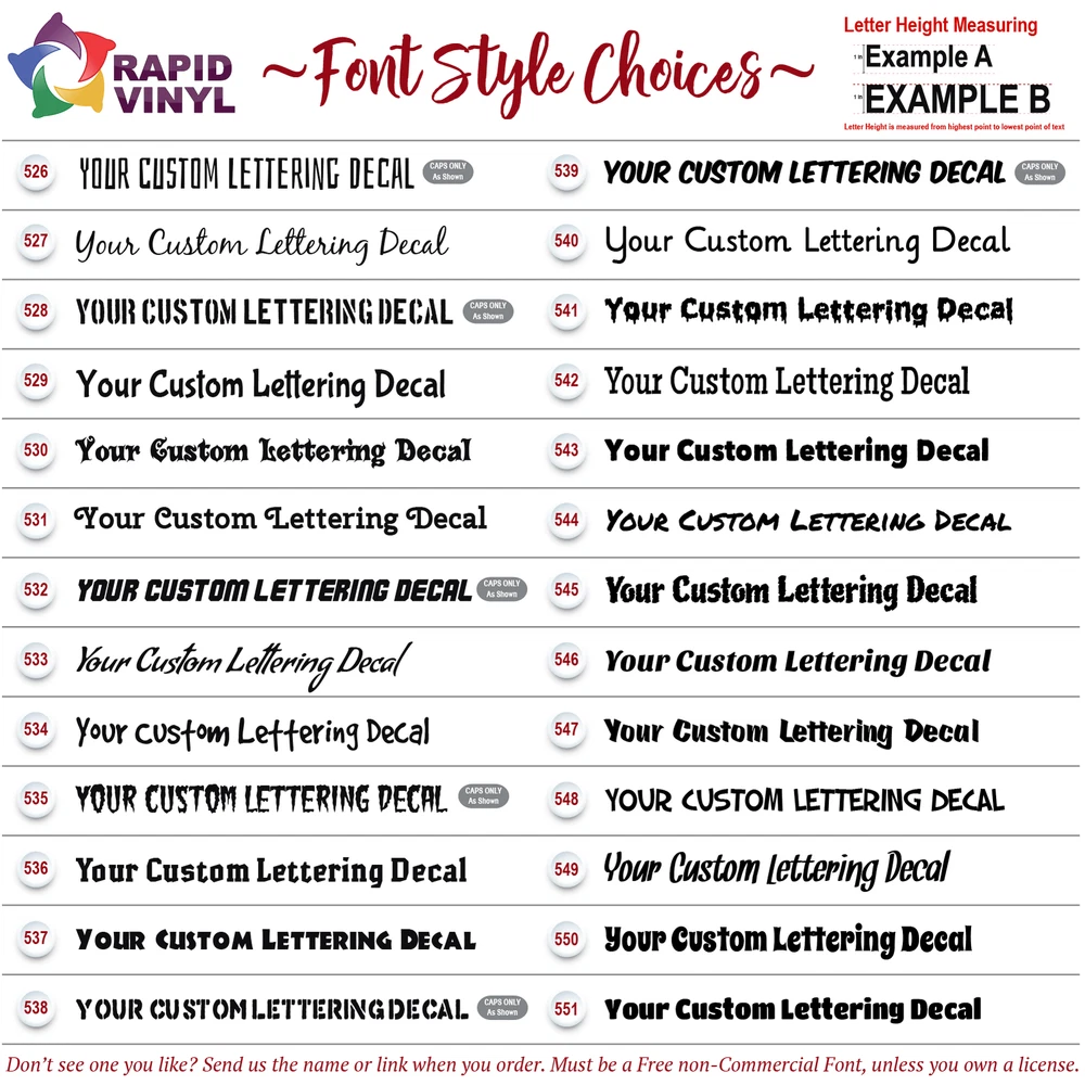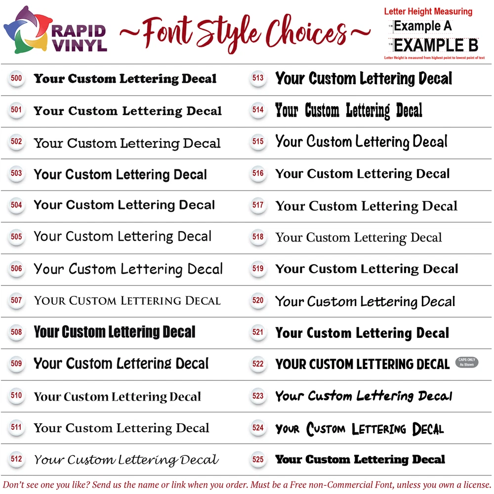 Custom Text Vinyl Lettering Sticker Decal Window Trailer Business Car Name Boat Custom Text Vinyl Lettering Sticker Decal Window Trailer Business Car Name Boat Rapid Vinyl Custom Vinyl Letters & Designs Made to Order. Create your personalized DIY decal! For homeowners, vinyl designs provide an option for elegant, classy yet different décor. Business owners can use the custom vinyl lettering service to design their logos, decorate their walls or have their contact information displayed on their vehicles and businesses. Order Instructions: Step 1: Select Size, Select Color, Change quantity and place an order Step 2: Send us an eBay message with your Custom Text, Lettering, Numbers, Max Length & Font Style Up to 20 characters per single order quantity of 1 Product Details: Custom made to order lettering transfer decals using your information. No Background 6 Year semi-permanent adhesive rating / withstands outdoor elements Will ship pre-spaced and ready to apply, letters are not individual You may cut the decal to create individual letters, sections, or groups (if not a script style/touching font style) Up to 20 characters per order for sizes .50" High through 3.5" High (Larger Sizes - Click Here ) Example Text: "Rapid Vinyl Chrome" = 16 Characters (Order Quantity 1) Example Text: "Rapid Vinyl Sells Vinyl Decals" = 26 Characters (Order Quantity 2) Letters, Numbers, Symbols and Exsessive Spaces count as characters Solid one color per order - If you need something customized, send us a message for a quote Sizes are measured by lettering height (Top of the tallest letter to the bottom of the lowest letter) Length depends on your text, phrase, word, sentence, and font selected If you have a max length restriction per phrase, word, line of words, etc let us know This is NOT a peel and stick pack of the alphabet Recommended use outdoors; car, truck, boat, trailer, glass, window, windshield, special projects, hobby, and more For indoor applications; walls, temporary projects, and removable vinyl visit our indoor listing For sizes larger than 3.5" High, please visit this listing For sizes 12" High through 22" High, please visit this listing For Chrome custom lettering, please visit this listing Installation instructions ship with the decal If you have any questions, send us a message Other Services & Info: Shipping is FREE on most orders and always FREE if you spend $10.00 or more Custom Requests may be requested via a message, not included with standard orders Upgrade to USPS Priority 2-3 Day Shipping during checkout for only $9.95! Orders over $75.00 receive free expedited shipping USPS Priority For Other Vinyl Sizes & Decals Visit our eBay Store Here To preview your text with our fonts google search "rapid vinyl font preview tool links" Lettering Decal Production Process: The Vinyl Lettering Process is simple: You send us the details for your vinyl lettering project and we turn it into a custom transfer decal. The key information we need to collect from you is 1) Size, 2) Color, 3) Text, Numbers, Phrase, Words, Symbols, 4) Font Style, 5) Max length as required. We then process this information using computer aided tools to create a vector file. We send this vector file to our cutter/plotter. This physical cutter cuts the outlines of your decal. We then weed the decal by pulling all of the excess vinyl off of the backing. Once complete we then cover with decal with transfer tape. The item is then shipped directly to you for application! Frequently Asked Questions: What is the difference between a decal and a sticker? - Lettering & Design decals are typically created using the method explained above and are single color unless layered to create an effect. Stickers are often referred to as a full color custom image or graphic design that is printed onto vinyl first, and then cut to a shape and size. This creates a sticker. Often stickers are ordered in large quantities because we need to process using a printer & cutter. Custom printed stickers are offered with minimum order quantities for a better price. How fast will you ship my Personalized Lettering Decal? - We process most all orders within 1-3 business days! Larger orders take a bit longer. The sooner we receive your details the sooner we are able to process and ship your custom decal! Am I able to use a different font style that what you offer? - Yes. However please keep in mind that the fancier the font the more time it takes our team to weed, thus we may charge more to produce your decal. You should also keep in mind that if you use a font style that has thin lines, the thinner the actual area of adhesion to the surface becomes. The install also becomes more delicate. Where is your font preview design tool located? - We have to host this off of eBay and are unable to share the link to this tool until after you have placed an order. We comply with eBay policies in this regard. We do have font images in the listing showing some of our font styles available but we have many more than the image quantity allows. We also believe it's a huge benefit to see your custom text displayed in the font of your choosing. If you have a valid email address on file with eBay, you will receive the link to the "Rapid Vinyl Font Preview Tool" after an order is placed. We are not permitted to share this link with you before an order is placed on eBay or through eBay messaging. What vinyl types do you offer on eBay? - We have 3 distinct types; Indoor Matte Finish, Outdoor/Indoor Gloss Finish, and Chrome Metal Finish. Indoor will last for many years and is cleanly removable for up to 2 years w/o damaging walls for example. Outdoor has a stronger adhesive and is made to weather the elements for 4-6 years. Chrome is a metal foil like material and also has a rating of 4-6 years. We can obtain other high performance vinyl types for custom orders. Higher performance vinyls will run higher in pricing depending on quantity and type wanted. What we offer here on eBay is 