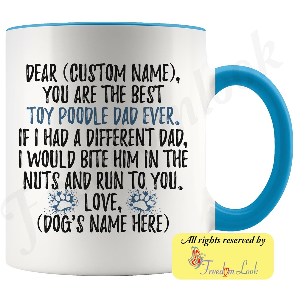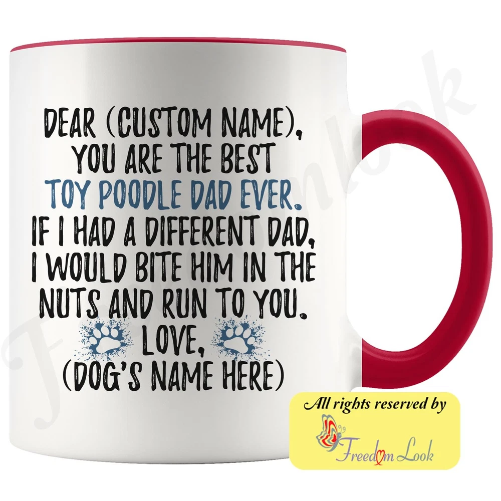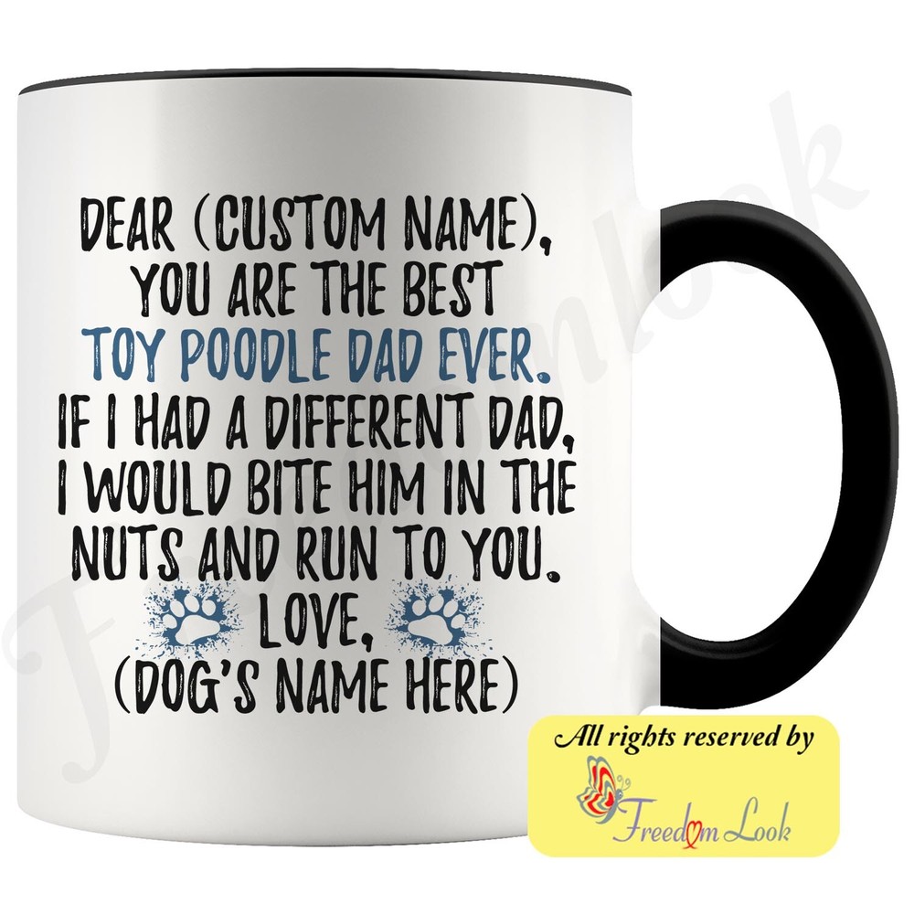 personalized toy poodle dog mug, caniche dog coffee mug, barbone dog gifts, chien canne dog dad present gift, teacup poodle dog daddy mug, french poodle dog owner, i love toy poodle, custom toy poodle gift, dog coffee cup, fathers day gift Are you looking for a great, unique and personalized gift for a dog owner? Search no more and get this mug TODAY. They will be thankful forever. Don't miss it because you'll regret it later by not getting it. This is the perfect coffee mug with content "DEAR 'CUSTOM NAME', YOU ARE THE BEST TOY POODLE DAD EVER. IF I HAD A DIFFERENT DAD, I WOULD BITE HIM IN THE NUTS AND RUN TO YOU. LOVE, 'DOG'S NAME HERE' ". CUSTOM DAD'S NAME AND DOG'S NAME Please put the dad's and dog's name in the notes at the checkout or just send us a message. By not doing this, it will delay your order. Example: Dad's name: Bill; Dog's name: Charlie A PERFECT FUNNY GIFT FOR A TOY POODLE DOG DAD! This special coffee cup can be a great gift for every Toy Poodle dad. Sizes: Colored coffee mug size: 11 oz White coffee mug size: 11 oz or 15 oz DISHWASHER AND MICROWAVE SAFE! This version of ceramic mug shows it's true colors with quality assurance to withstand heat in the microwave and put it in the dishwasher as many times as you like, the quality will not be Altered. THE MUG DESIGN IS PRINTED ON BOTH SIDES! No matter if you hold your teacup in your right or left hand, you and everyone else will be able to see this unique design. Looking at this cute coffee mug will put a smile on everyone's face! We want you to be 100% satisfied, so please let us know if there is anything wrong with your order so we can fix it right away. We truly offer the most stunning, unique and trendy highest-quality products in the world. All of our products are custom-made-to-order and handcrafted to the highest quality standards. We stand by our products the quality is outstanding rest assured. Triple check your address , we copy addresses exactly as written, any undeliverable orders due to customer error are not our responsibility. Mug for every day. Christmas birthday brother sister mom mother father dad aunt grandma grandpa girlfriend gift