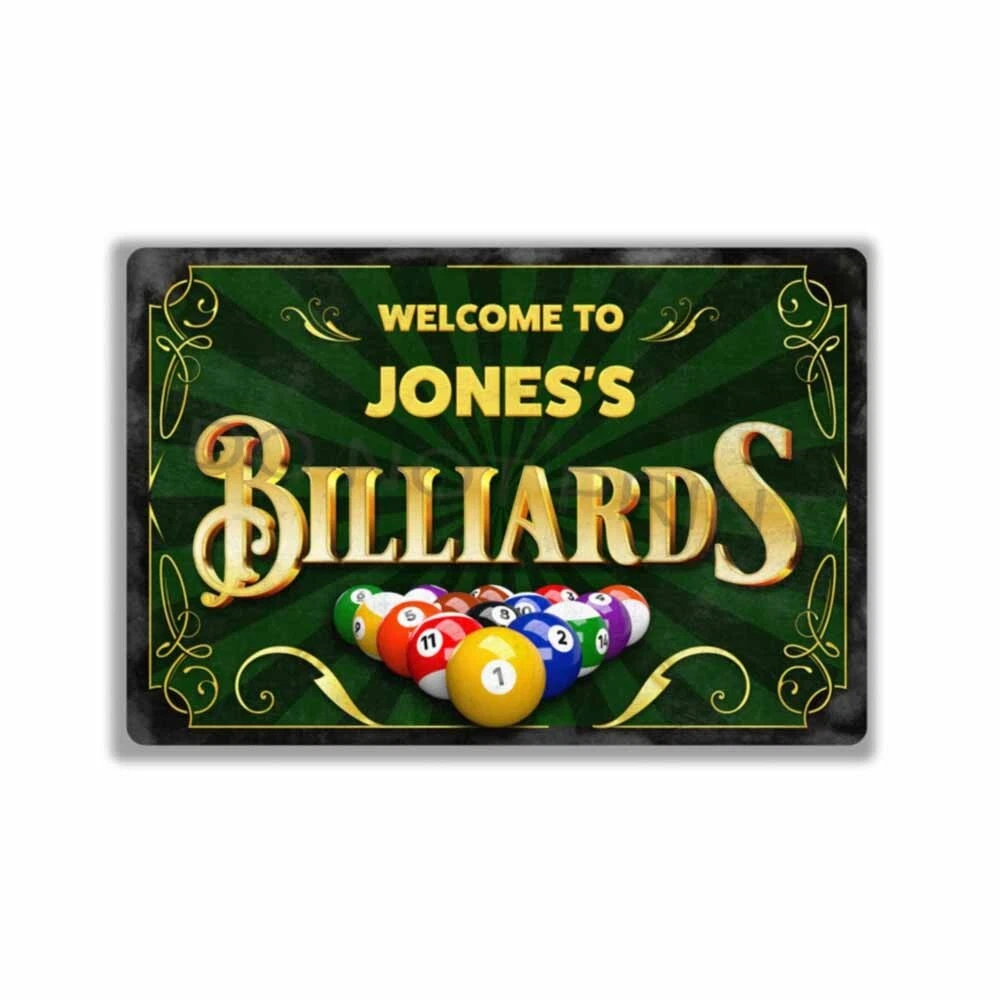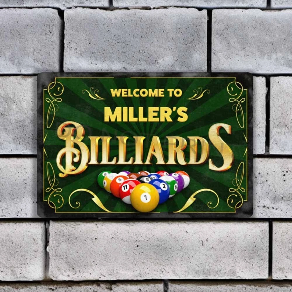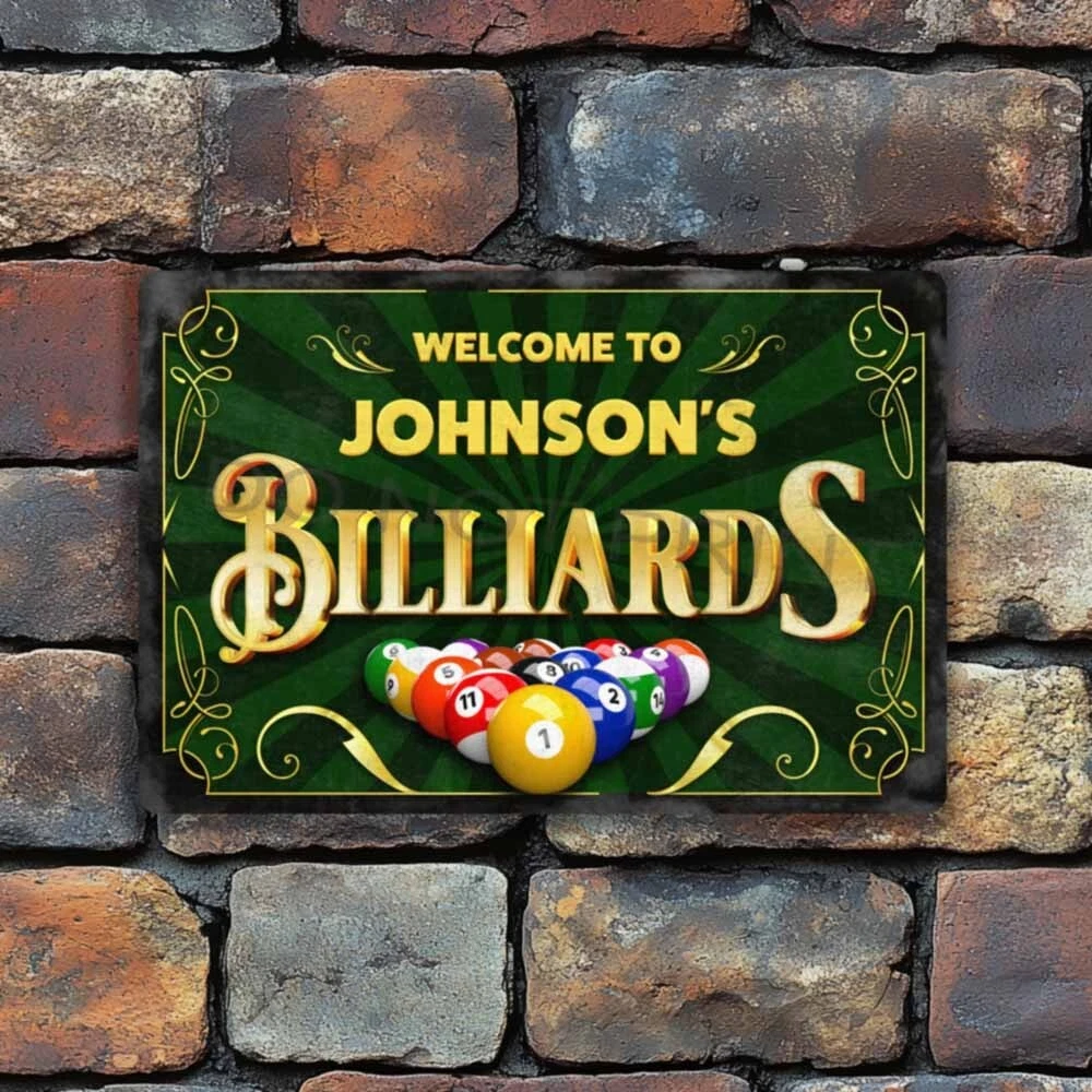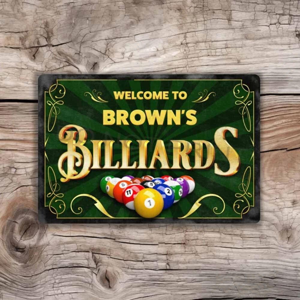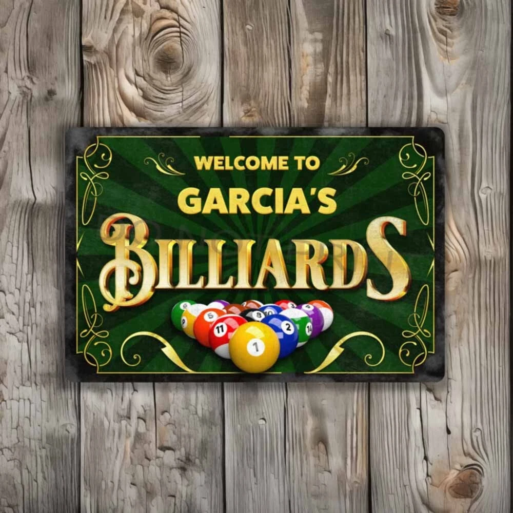 Personalized Billiards Sign 🎱 Level up your game room with our custom Personalized Billiards Sign! 🎯 Make your billiards room or man cave truly yours with this stunning customizable sign. Perfect for pool halls, home game rooms, bars, or any space where champions are made. Choose your preferred material: 🏷️ Vinyl Sticker: High-quality, weather-resistant vinyl that adheres smoothly to any clean, flat surface. Perfect for both indoor and outdoor use. Available in 6x4 and 12x8. 🛡️ Aluminum Sign: Durable, rust-resistant aluminum with vibrant, long-lasting colors. Built to last while maintaining its premium look. Only available in 12x8, with rounded-corners and with 2 holes for easy mounting. Each sign features: ✨ Custom name or text of your choice 🎨 Classic black and green color scheme 🎱 Elegant billiards-themed design 🏆 Professional-grade materials 🛠️ Easy installation Personalize your space today with this sophisticated billiards sign! The perfect addition to any game room or the ideal gift for the pool enthusiast in your life. Order now to create your custom piece!