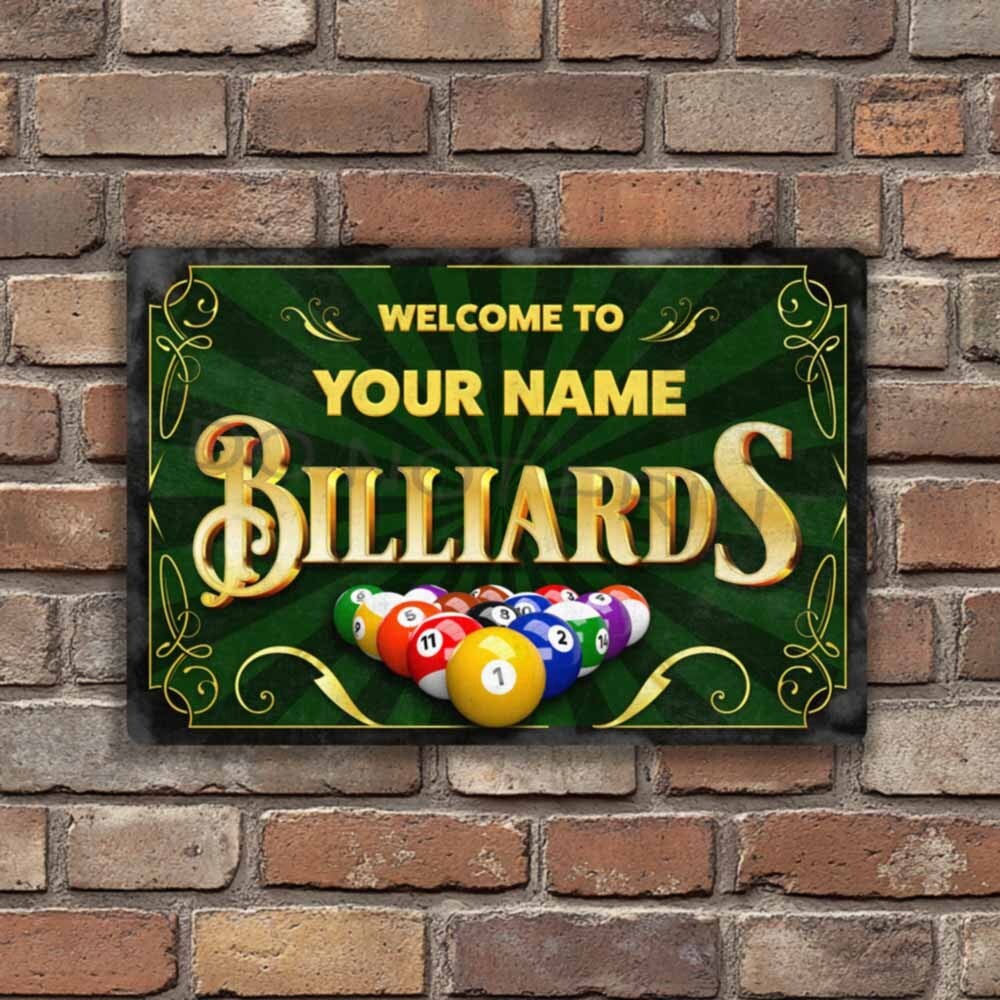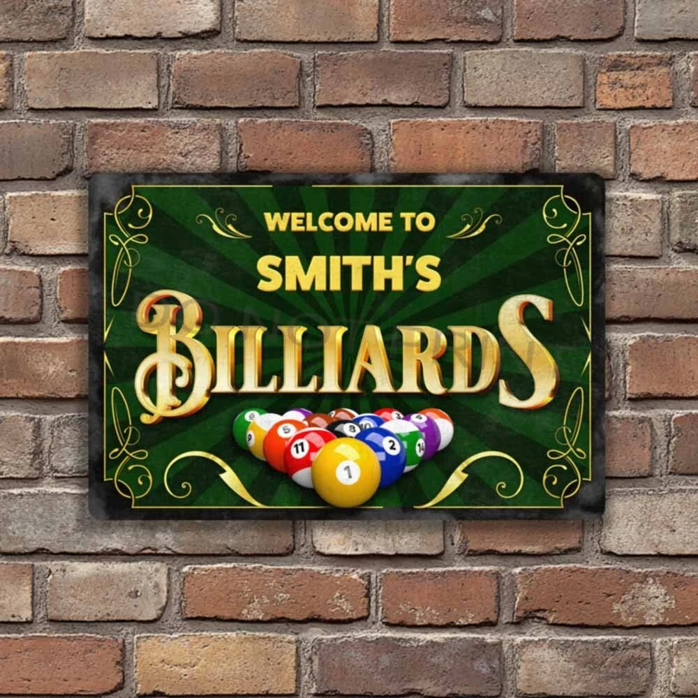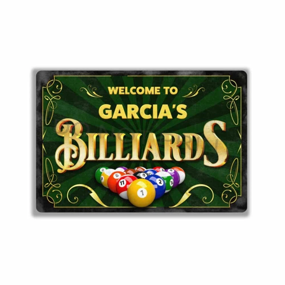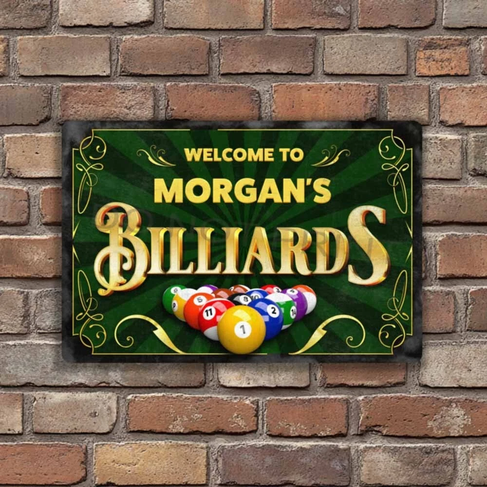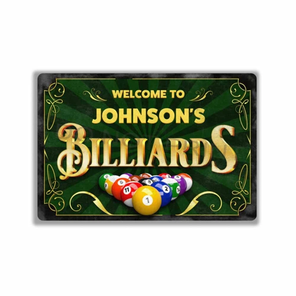 Personalized Billiards Sign 🎱 Level up your game room with our custom Personalized Billiards Sign! 🎯 Make your billiards room or man cave truly yours with this stunning customizable sign. Perfect for pool halls, home game rooms, bars, or any space where champions are made. Choose your preferred material: 🏷️ Vinyl Sticker: High-quality, weather-resistant vinyl that adheres smoothly to any clean, flat surface. Perfect for both indoor and outdoor use. Available in 6x4 and 12x8. 🛡️ Aluminum Sign: Durable, rust-resistant aluminum with vibrant, long-lasting colors. Built to last while maintaining its premium look. Only available in 12x8, with rounded-corners and with 2 holes for easy mounting. Each sign features: ✨ Custom name or text of your choice 🎨 Classic black and green color scheme 🎱 Elegant billiards-themed design 🏆 Professional-grade materials 🛠️ Easy installation Personalize your space today with this sophisticated billiards sign! The perfect addition to any game room or the ideal gift for the pool enthusiast in your life. Order now to create your custom piece!