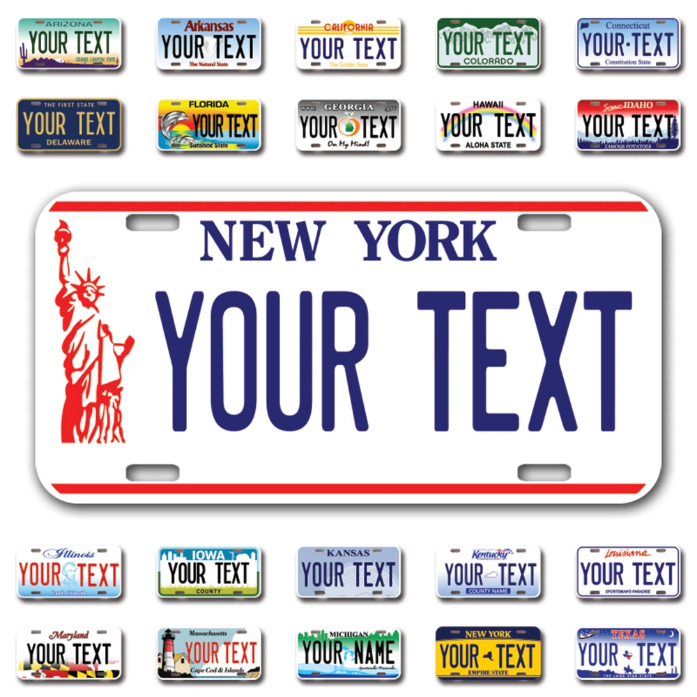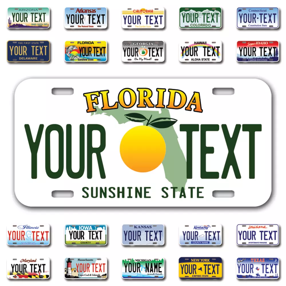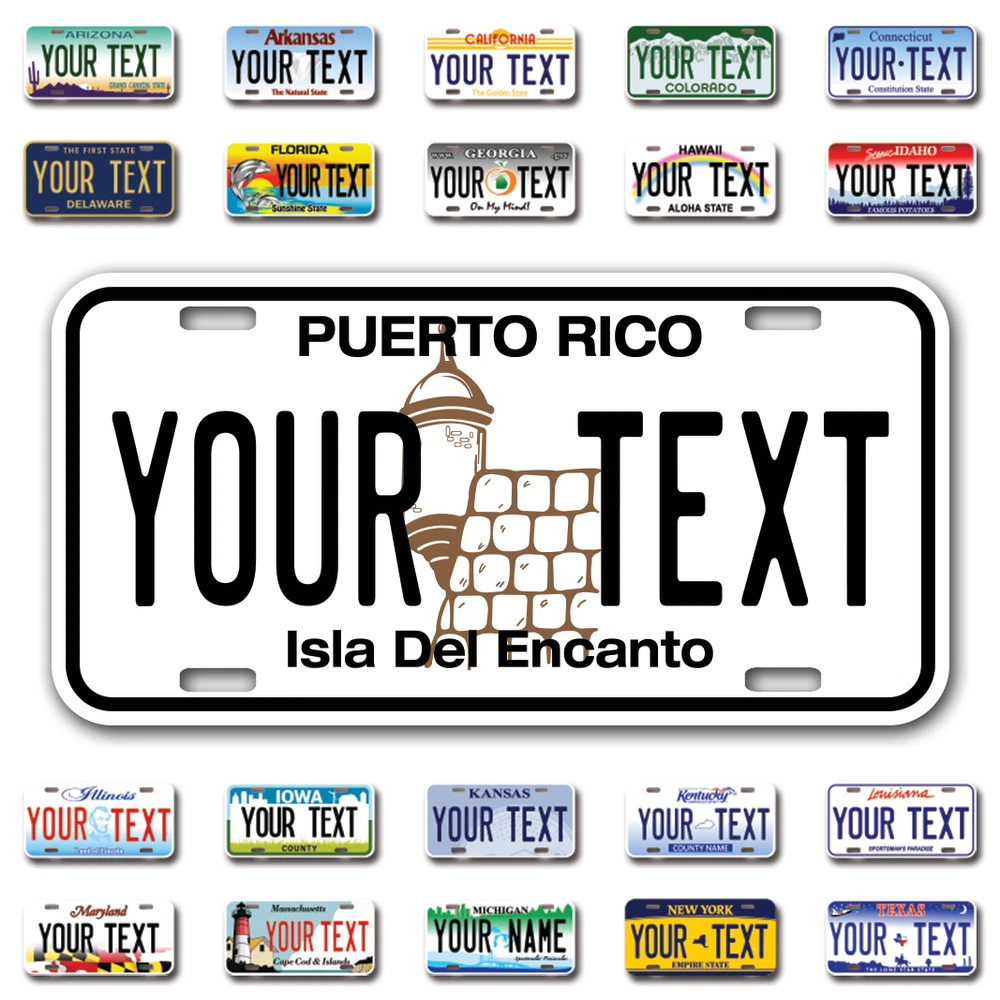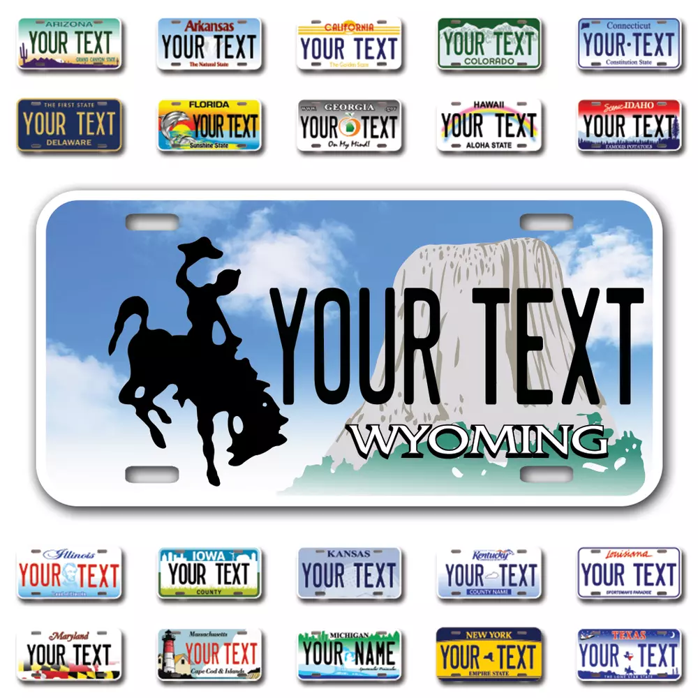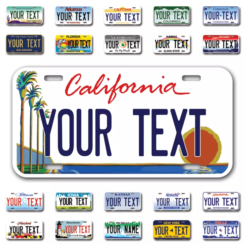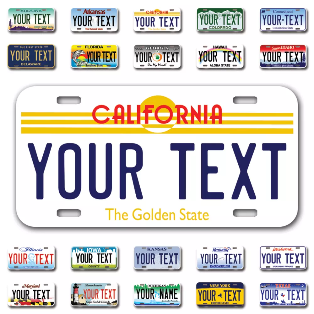 Our LICENSE plates are the most unique souvenirs from the United States, Choose between 50 states and 3 different sizes. Cannot be used in place of a state issued plate. IMPORTANT DESCRIPTION • Plates are made using High quality thick 040 rust free Aluminum. • Our plates are printed flat, not raised. The customizing is done using the latest UV Laser technique for weatherproof and high-quality finish. • 100% made in USA. • Standard car plate has four holes and can be used for trucks, motor homes, and more • M otorcycle plates have 2 holes on top for mounting and can be used on ATVS, Mopeds, Snowmobiles, wheelchairs and golf carts • B ike plates have two holes on top and can also be used for toy cars, wagons, electric toy cars, tricycles and more • Write your text in the personalization section. The text will be copied and pasted on the license plate as sent, so make sure of the spelling, punctuation, capitalization, etc. If you have any question regarding your text or you would like a preview, please let us know by adding a note or contacting Alabama | Alaska | Arizona | Arkansas | California | Colorado | Connecticut | Delaware | Florida | Georgia | Hawaii | Idaho | Illinois | Indiana | Iowa | Kansas | Kentucky | Louisiana | Maine | Maryland | Massachusetts | Michigan | Minnesota | Mississippi | Missouri | Montana | Nebraska | Nevada | New Hampshire | New Jersey | New Mexico | New York | North Carolina | North Dakota | Ohio | Oklahoma | Oregon | Pennsylvania | Puerto Rico | Rhode Island | South Carolina | South Dakota | Tennessee | Texas | Utah | Vermont | Virginia | Washington | West Virginia | Wisconsin | Wyoming