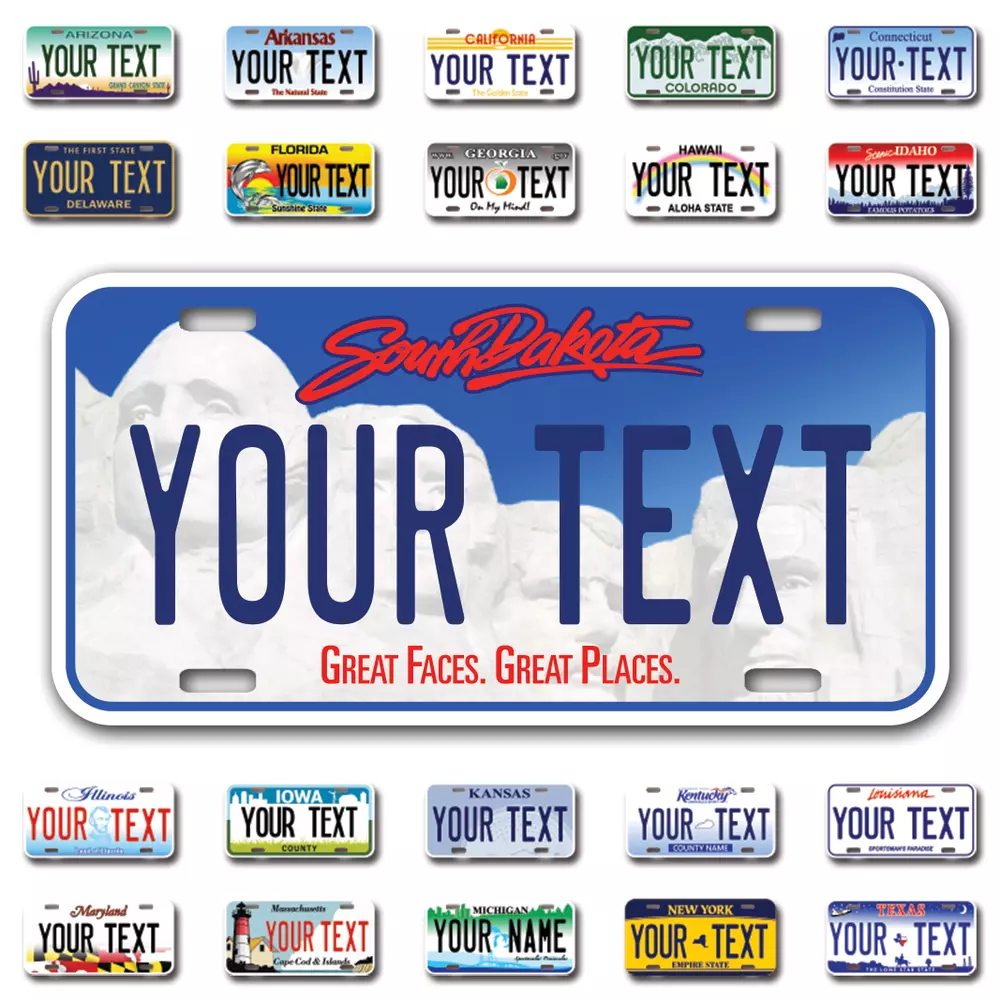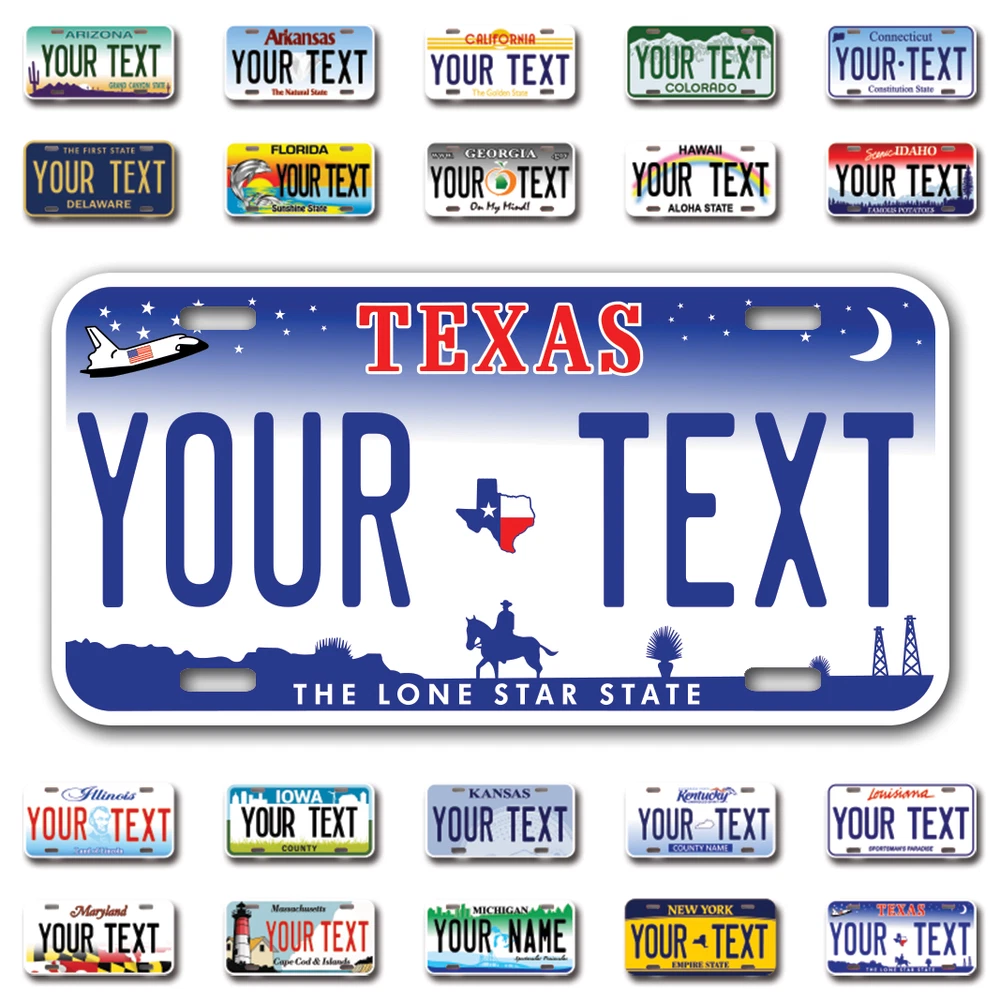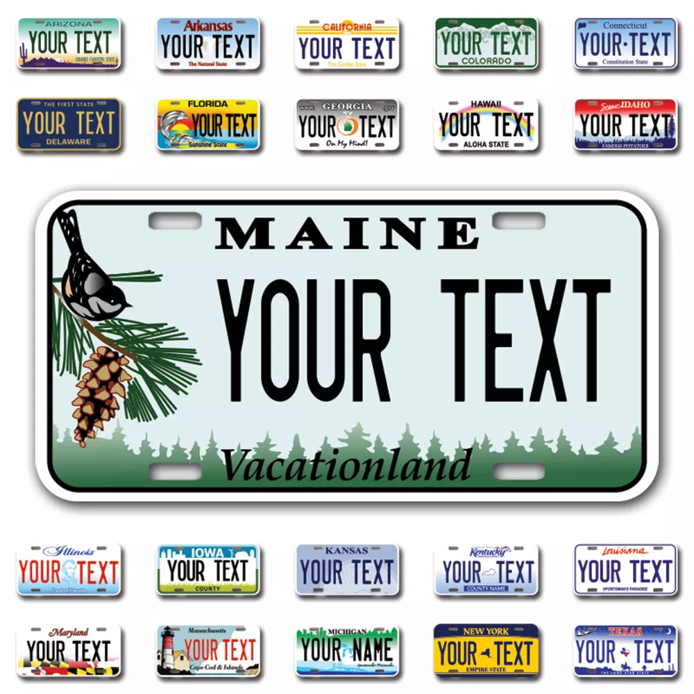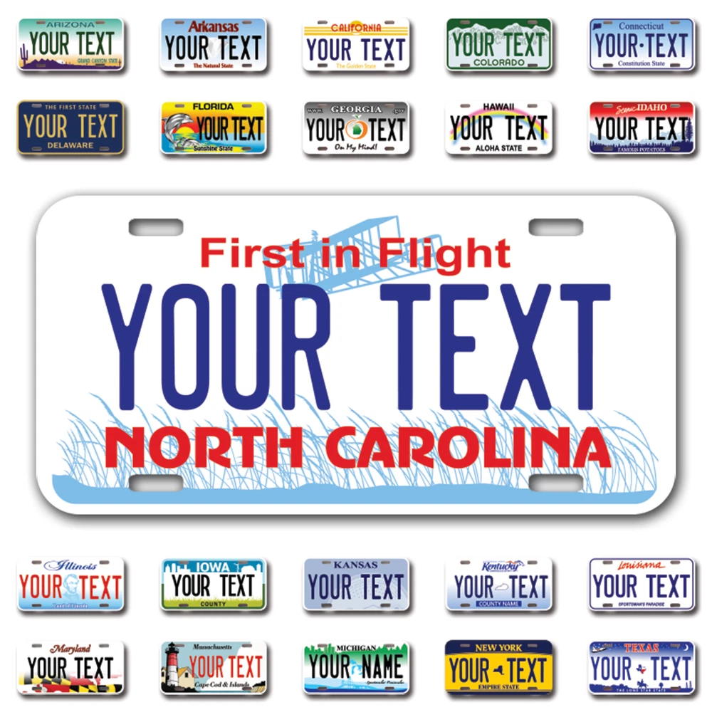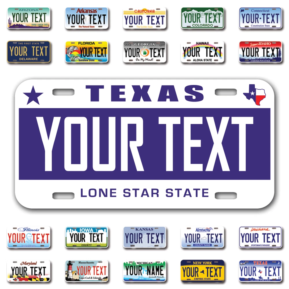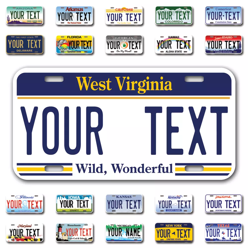 Our LICENSE plates are the most unique souvenirs from the United States, Choose between 50 states and 3 different sizes. Cannot be used in place of a state issued plate. IMPORTANT DESCRIPTION • Plates are made using High quality thick 040 rust free Aluminum. • Our plates are printed flat, not raised. The customizing is done using the latest UV Laser technique for weatherproof and high-quality finish. • 100% made in USA. • Standard car plate has four holes and can be used for trucks, motor homes, and more • M otorcycle plates have 2 holes on top for mounting and can be used on ATVS, Mopeds, Snowmobiles, wheelchairs and golf carts • B ike plates have two holes on top and can also be used for toy cars, wagons, electric toy cars, tricycles and more • Write your text in the personalization section. The text will be copied and pasted on the license plate as sent, so make sure of the spelling, punctuation, capitalization, etc. If you have any question regarding your text or you would like a preview, please let us know by adding a note or contacting Alabama | Alaska | Arizona | Arkansas | California | Colorado | Connecticut | Delaware | Florida | Georgia | Hawaii | Idaho | Illinois | Indiana | Iowa | Kansas | Kentucky | Louisiana | Maine | Maryland | Massachusetts | Michigan | Minnesota | Mississippi | Missouri | Montana | Nebraska | Nevada | New Hampshire | New Jersey | New Mexico | New York | North Carolina | North Dakota | Ohio | Oklahoma | Oregon | Pennsylvania | Puerto Rico | Rhode Island | South Carolina | South Dakota | Tennessee | Texas | Utah | Vermont | Virginia | Washington | West Virginia | Wisconsin | Wyoming