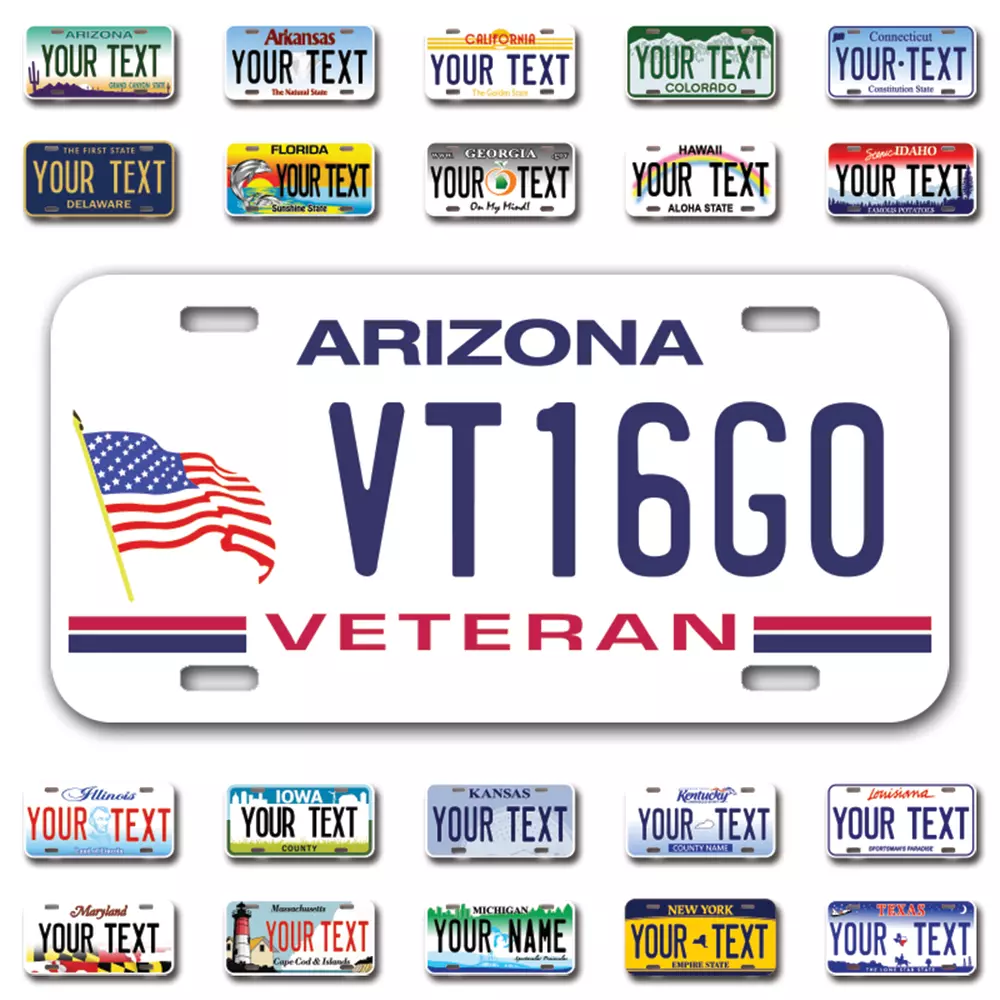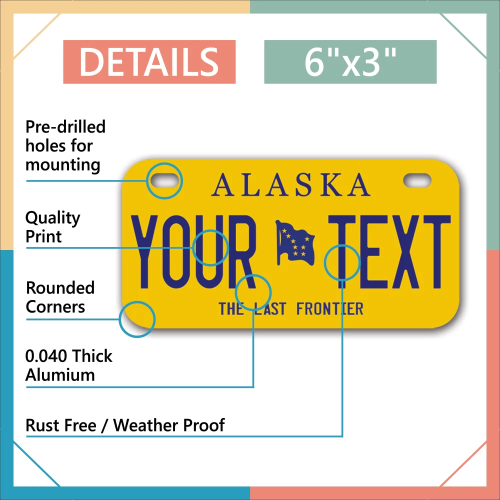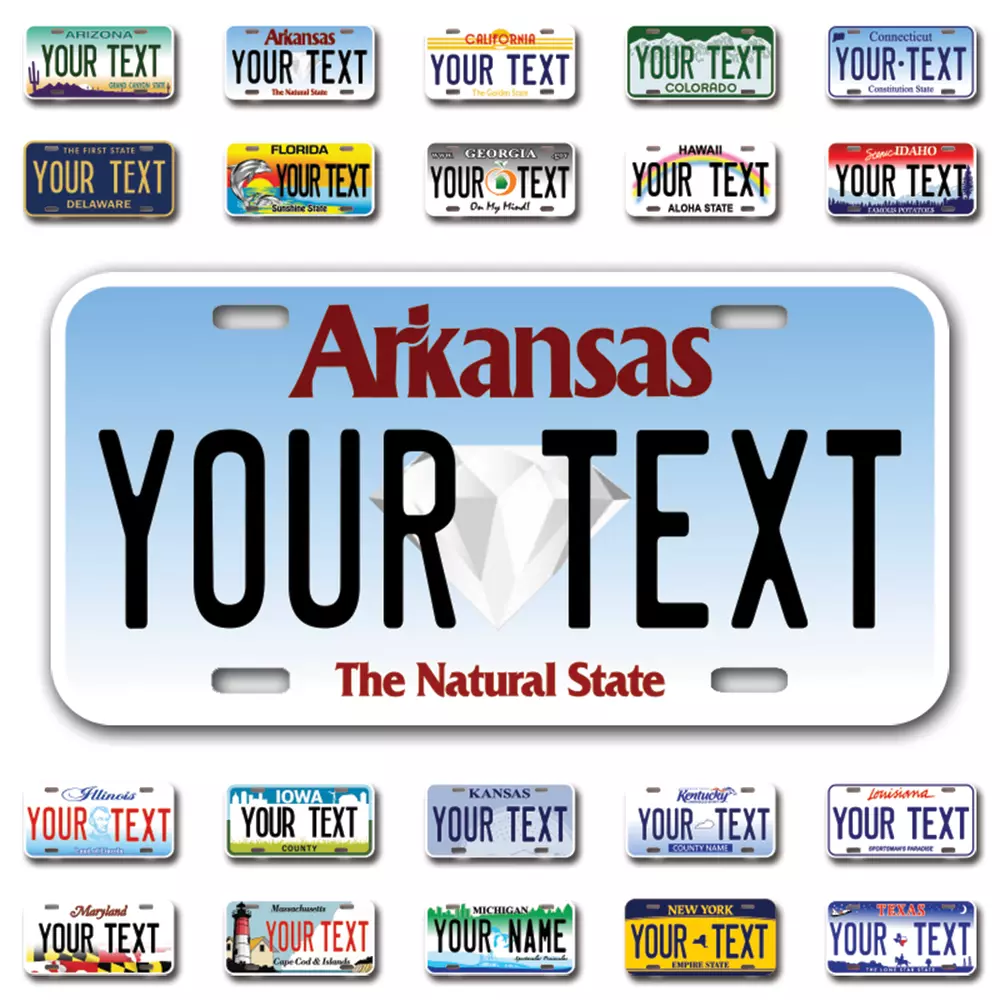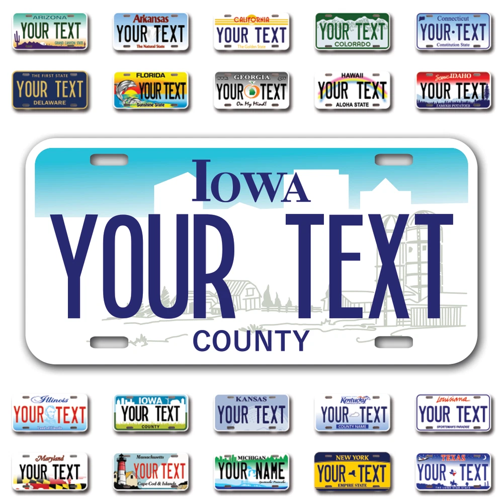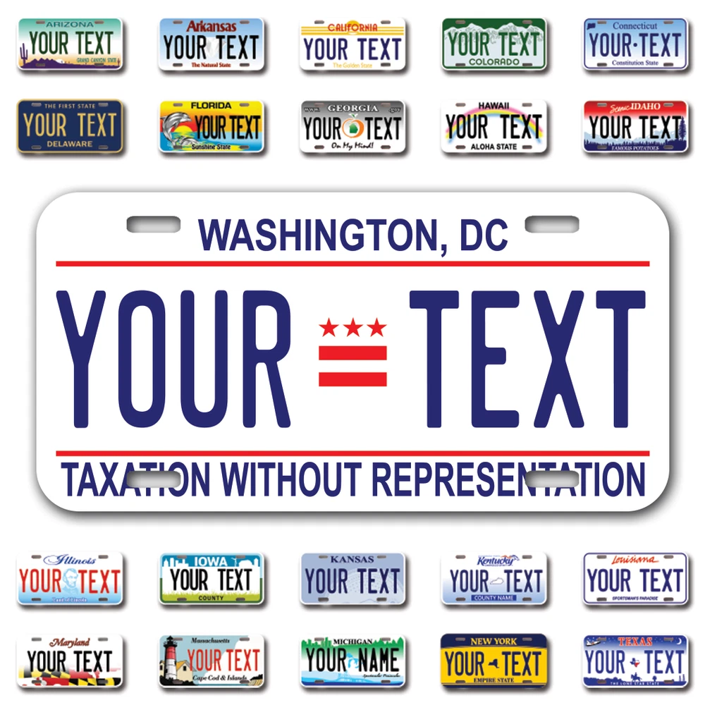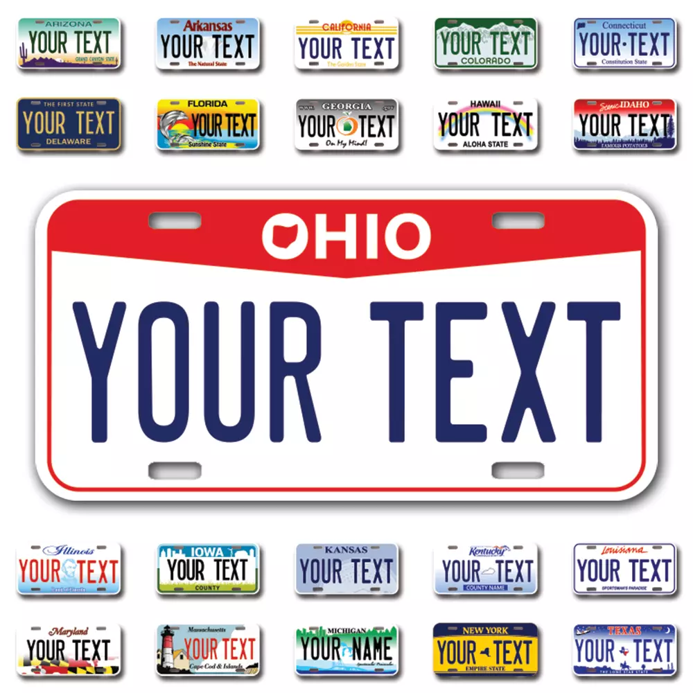 Our LICENSE plates are the most unique souvenirs from the United States, Choose between 50 states and 3 different sizes. Cannot be used in place of a state issued plate. IMPORTANT DESCRIPTION • Plates are made using High quality thick 040 rust free Aluminum. • Our plates are printed flat, not raised. The customizing is done using the latest UV Laser technique for weatherproof and high-quality finish. • 100% made in USA. • Standard car plate has four holes and can be used for trucks, motor homes, and more • M otorcycle plates have 2 holes on top for mounting and can be used on ATVS, Mopeds, Snowmobiles, wheelchairs and golf carts • B ike plates have two holes on top and can also be used for toy cars, wagons, electric toy cars, tricycles and more • Write your text in the personalization section. The text will be copied and pasted on the license plate as sent, so make sure of the spelling, punctuation, capitalization, etc. If you have any question regarding your text or you would like a preview, please let us know by adding a note or contacting Alabama | Alaska | Arizona | Arkansas | California | Colorado | Connecticut | Delaware | Florida | Georgia | Hawaii | Idaho | Illinois | Indiana | Iowa | Kansas | Kentucky | Louisiana | Maine | Maryland | Massachusetts | Michigan | Minnesota | Mississippi | Missouri | Montana | Nebraska | Nevada | New Hampshire | New Jersey | New Mexico | New York | North Carolina | North Dakota | Ohio | Oklahoma | Oregon | Pennsylvania | Puerto Rico | Rhode Island | South Carolina | South Dakota | Tennessee | Texas | Utah | Vermont | Virginia | Washington | West Virginia | Wisconsin | Wyoming