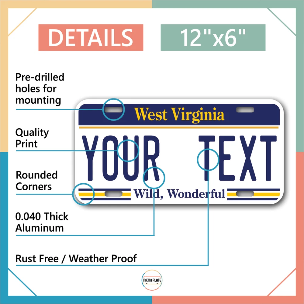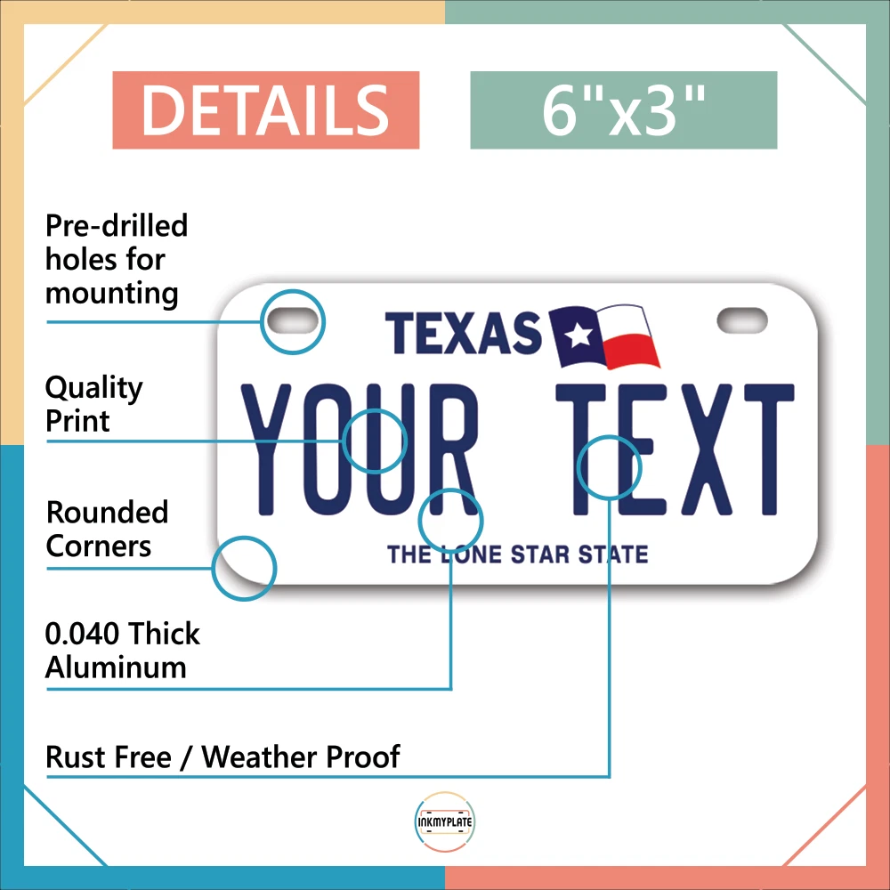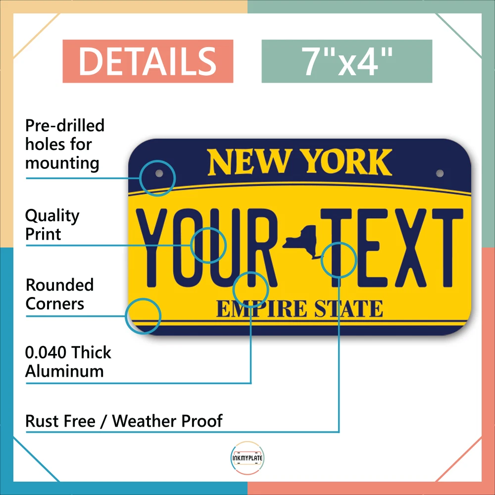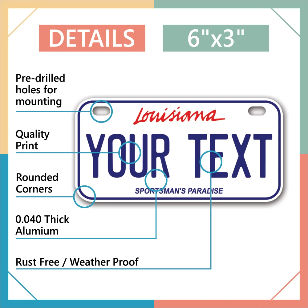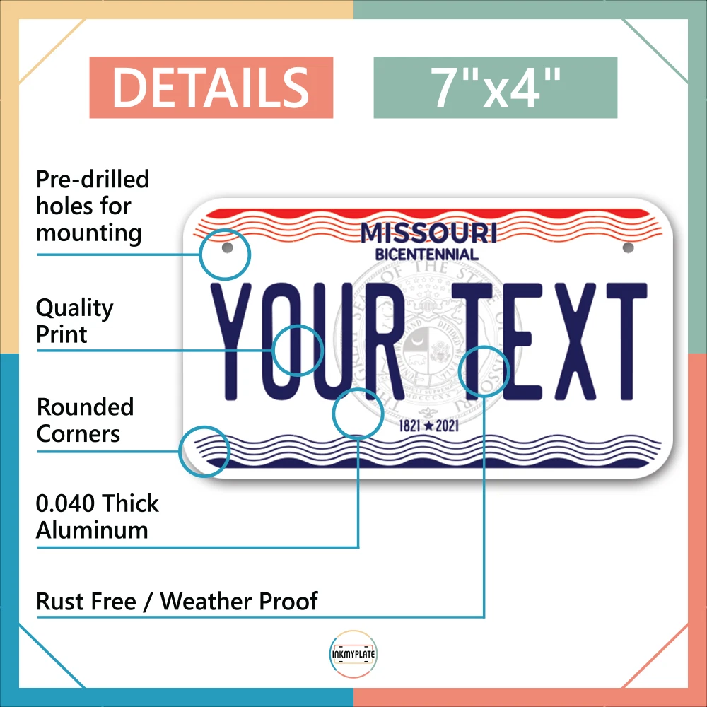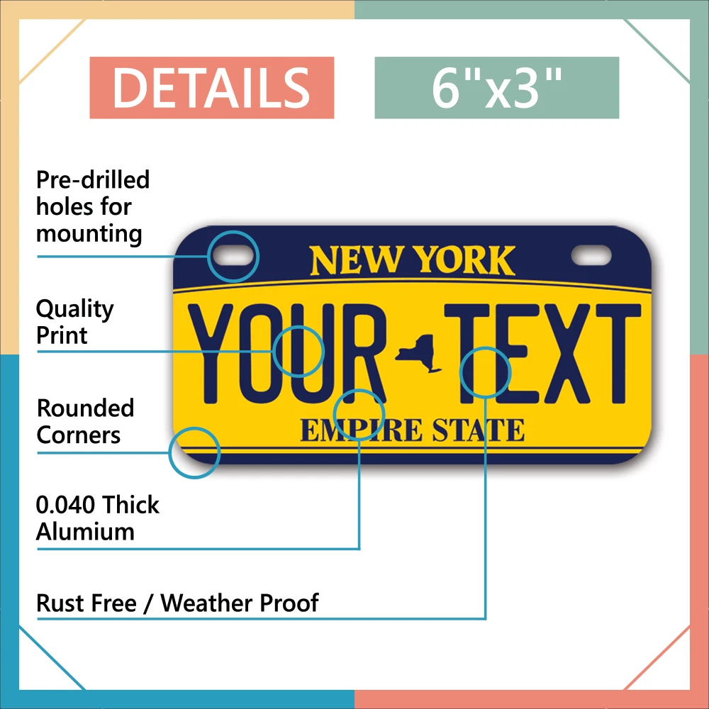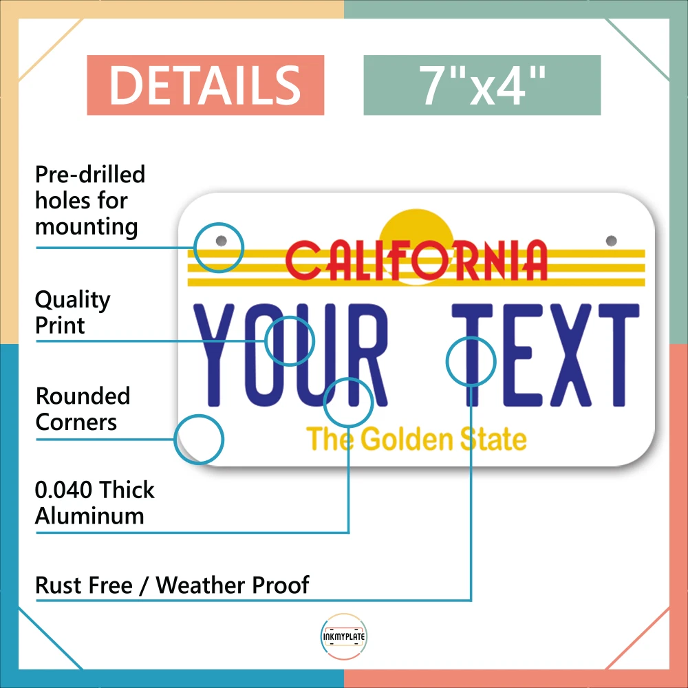 Our LICENSE plates are the most unique souvenirs from the United States, Choose between 50 states and 3 different sizes. Cannot be used in place of a state issued plate. IMPORTANT DESCRIPTION • Plates are made using High quality thick 040 rust free Aluminum. • Our plates are printed flat, not raised. The customizing is done using the latest UV Laser technique for weatherproof and high-quality finish. • 100% made in USA. • Standard car plate has four holes and can be used for trucks, motor homes, and more • M otorcycle plates have 2 holes on top for mounting and can be used on ATVS, Mopeds, Snowmobiles, wheelchairs and golf carts • B ike plates have two holes on top and can also be used for toy cars, wagons, electric toy cars, tricycles and more • Write your text in the personalization section. The text will be copied and pasted on the license plate as sent, so make sure of the spelling, punctuation, capitalization, etc. If you have any question regarding your text or you would like a preview, please let us know by adding a note or contacting Alabama | Alaska | Arizona | Arkansas | California | Colorado | Connecticut | Delaware | Florida | Georgia | Hawaii | Idaho | Illinois | Indiana | Iowa | Kansas | Kentucky | Louisiana | Maine | Maryland | Massachusetts | Michigan | Minnesota | Mississippi | Missouri | Montana | Nebraska | Nevada | New Hampshire | New Jersey | New Mexico | New York | North Carolina | North Dakota | Ohio | Oklahoma | Oregon | Pennsylvania | Puerto Rico | Rhode Island | South Carolina | South Dakota | Tennessee | Texas | Utah | Vermont | Virginia | Washington | West Virginia | Wisconsin | Wyoming