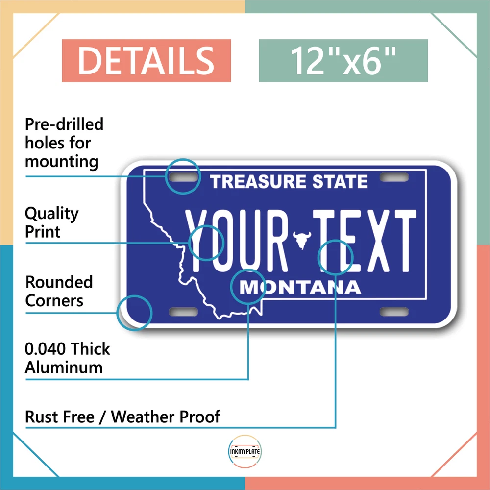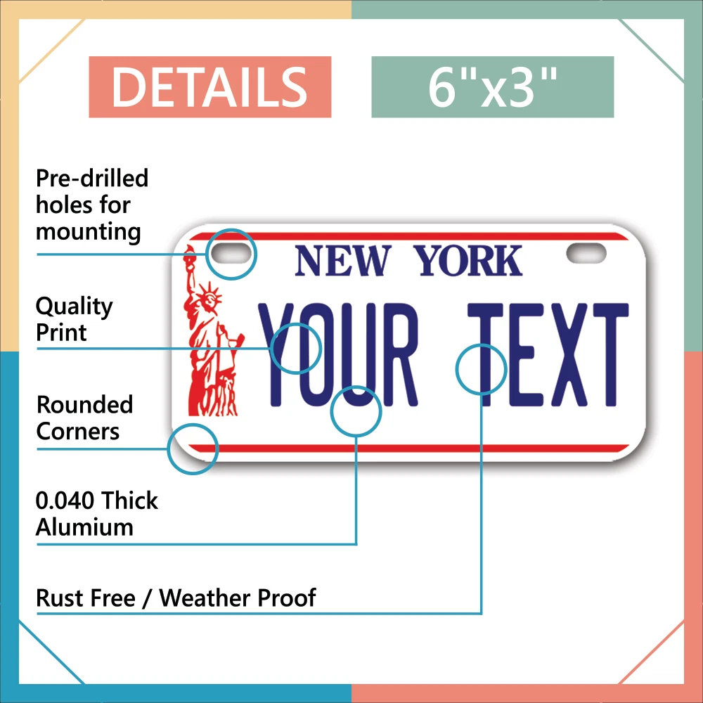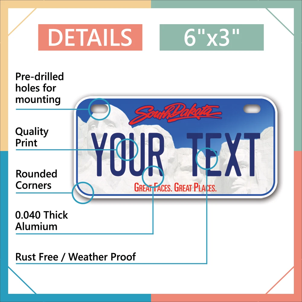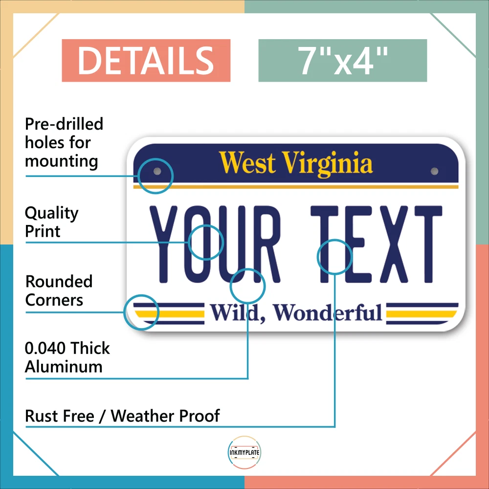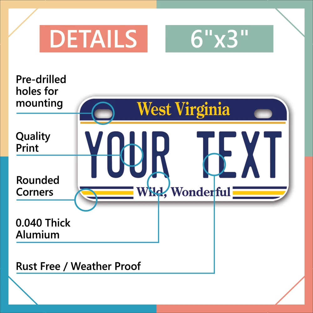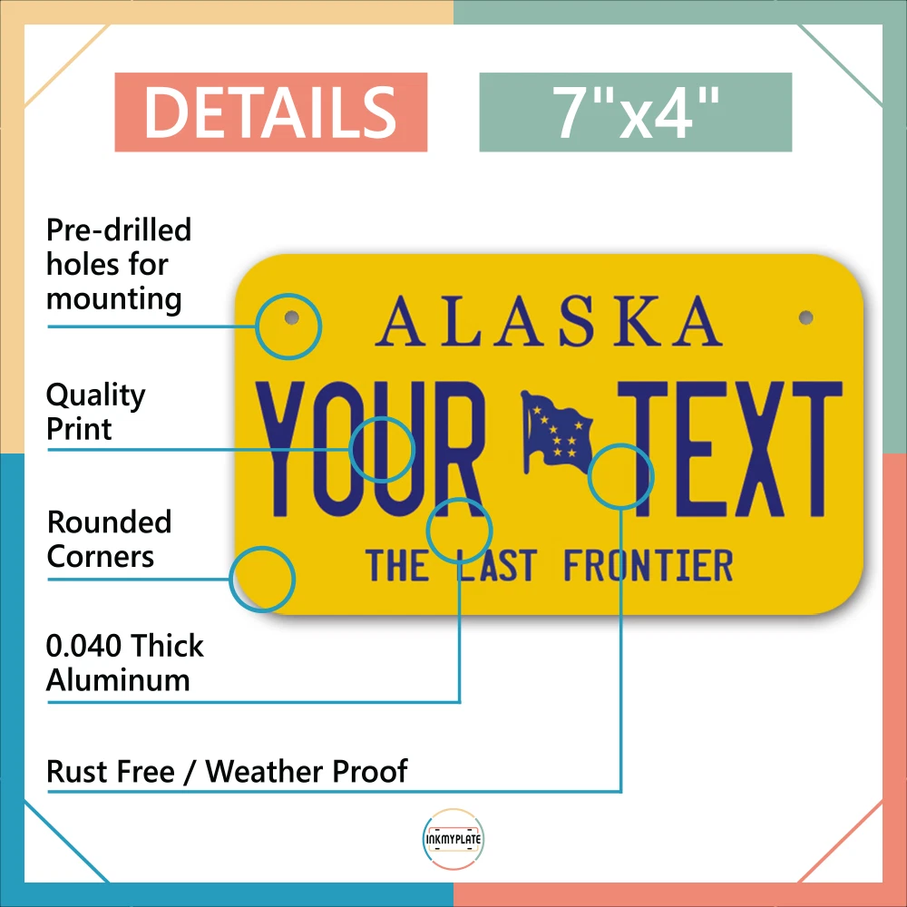 Our LICENSE plates are the most unique souvenirs from the United States, Choose between 50 states and 3 different sizes. Cannot be used in place of a state issued plate. IMPORTANT DESCRIPTION • Plates are made using High quality thick 040 rust free Aluminum. • Our plates are printed flat, not raised. The customizing is done using the latest UV Laser technique for weatherproof and high-quality finish. • 100% made in USA. • Standard car plate has four holes and can be used for trucks, motor homes, and more • M otorcycle plates have 2 holes on top for mounting and can be used on ATVS, Mopeds, Snowmobiles, wheelchairs and golf carts • B ike plates have two holes on top and can also be used for toy cars, wagons, electric toy cars, tricycles and more • Write your text in the personalization section. The text will be copied and pasted on the license plate as sent, so make sure of the spelling, punctuation, capitalization, etc. If you have any question regarding your text or you would like a preview, please let us know by adding a note or contacting Alabama | Alaska | Arizona | Arkansas | California | Colorado | Connecticut | Delaware | Florida | Georgia | Hawaii | Idaho | Illinois | Indiana | Iowa | Kansas | Kentucky | Louisiana | Maine | Maryland | Massachusetts | Michigan | Minnesota | Mississippi | Missouri | Montana | Nebraska | Nevada | New Hampshire | New Jersey | New Mexico | New York | North Carolina | North Dakota | Ohio | Oklahoma | Oregon | Pennsylvania | Puerto Rico | Rhode Island | South Carolina | South Dakota | Tennessee | Texas | Utah | Vermont | Virginia | Washington | West Virginia | Wisconsin | Wyoming