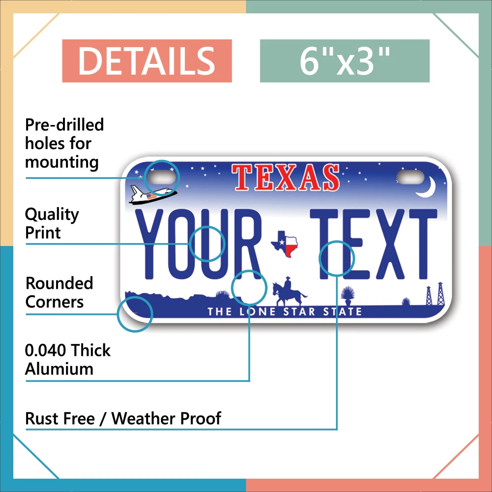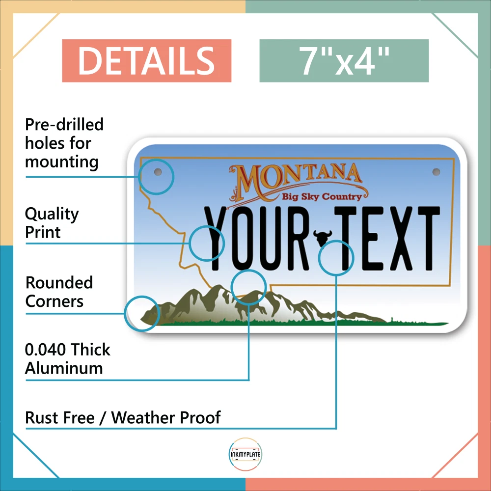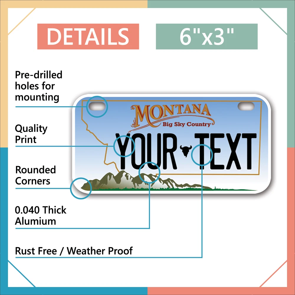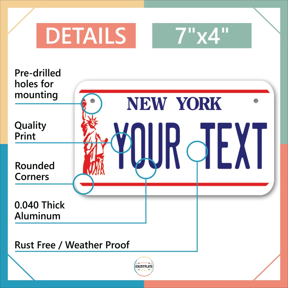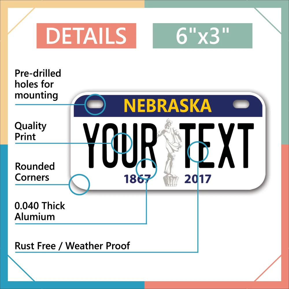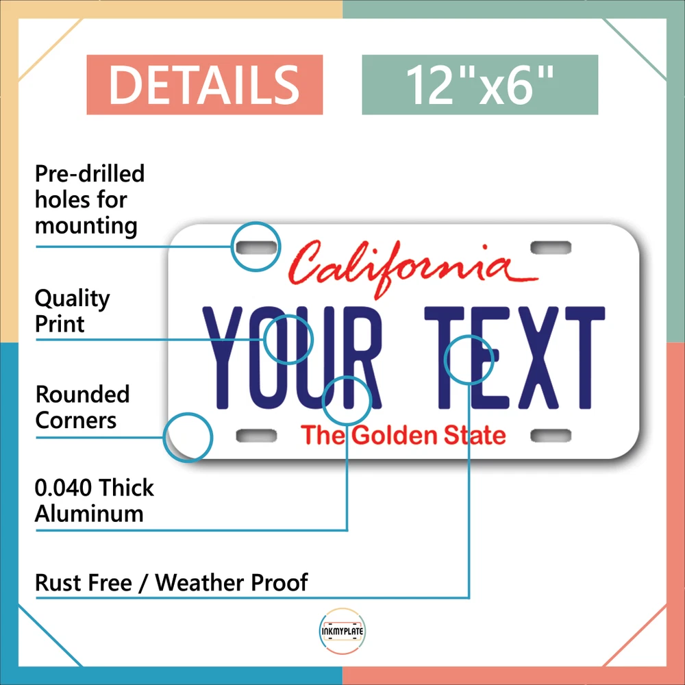 Our LICENSE plates are the most unique souvenirs from the United States, Choose between 50 states and 3 different sizes. Cannot be used in place of a state issued plate. IMPORTANT DESCRIPTION • Plates are made using High quality thick 040 rust free Aluminum. • Our plates are printed flat, not raised. The customizing is done using the latest UV Laser technique for weatherproof and high-quality finish. • 100% made in USA. • Standard car plate has four holes and can be used for trucks, motor homes, and more • M otorcycle plates have 2 holes on top for mounting and can be used on ATVS, Mopeds, Snowmobiles, wheelchairs and golf carts • B ike plates have two holes on top and can also be used for toy cars, wagons, electric toy cars, tricycles and more • Write your text in the personalization section. The text will be copied and pasted on the license plate as sent, so make sure of the spelling, punctuation, capitalization, etc. If you have any question regarding your text or you would like a preview, please let us know by adding a note or contacting Alabama | Alaska | Arizona | Arkansas | California | Colorado | Connecticut | Delaware | Florida | Georgia | Hawaii | Idaho | Illinois | Indiana | Iowa | Kansas | Kentucky | Louisiana | Maine | Maryland | Massachusetts | Michigan | Minnesota | Mississippi | Missouri | Montana | Nebraska | Nevada | New Hampshire | New Jersey | New Mexico | New York | North Carolina | North Dakota | Ohio | Oklahoma | Oregon | Pennsylvania | Puerto Rico | Rhode Island | South Carolina | South Dakota | Tennessee | Texas | Utah | Vermont | Virginia | Washington | West Virginia | Wisconsin | Wyoming