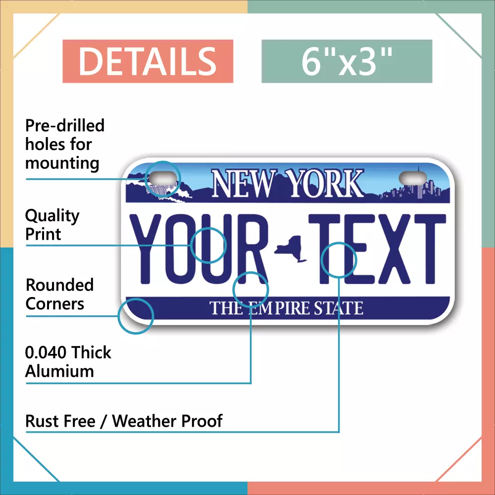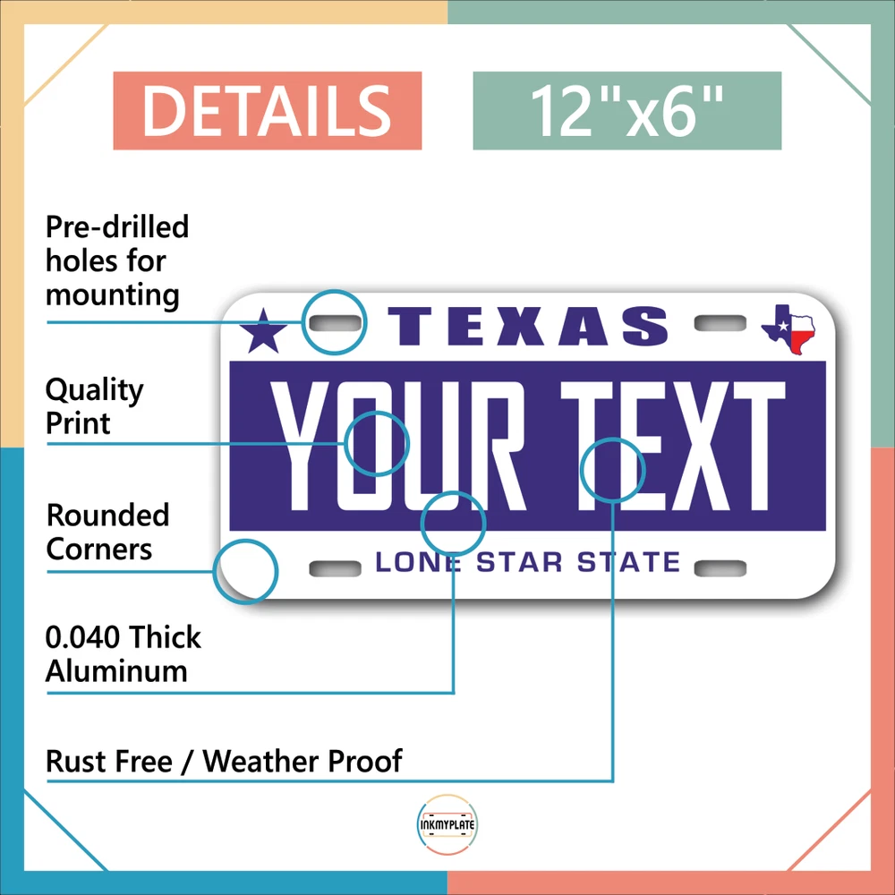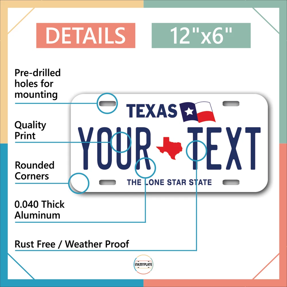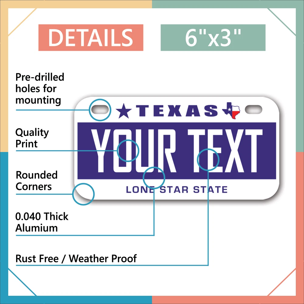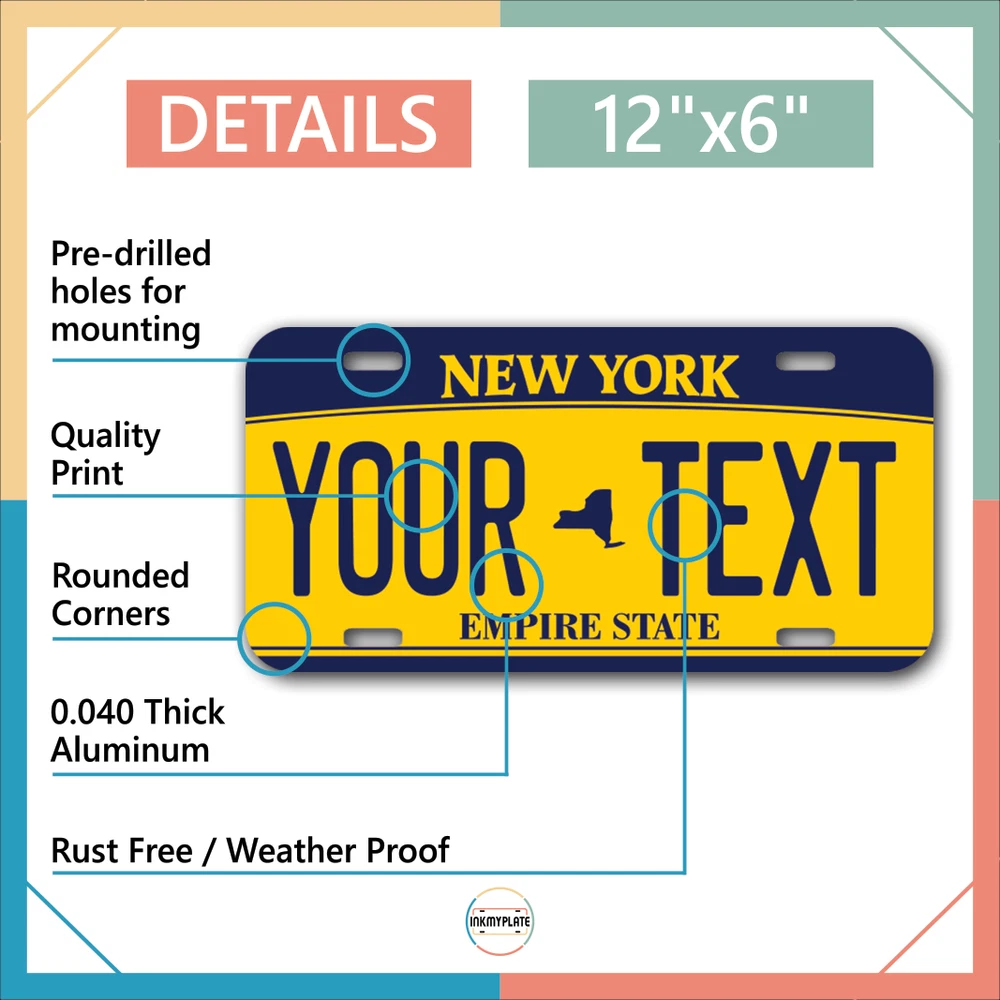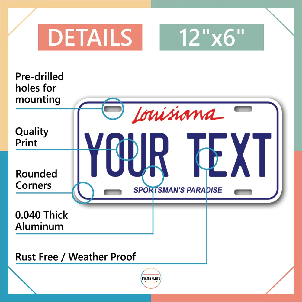 Our LICENSE plates are the most unique souvenirs from the United States, Choose between 50 states and 3 different sizes. Cannot be used in place of a state issued plate. IMPORTANT DESCRIPTION • Plates are made using High quality thick 040 rust free Aluminum. • Our plates are printed flat, not raised. The customizing is done using the latest UV Laser technique for weatherproof and high-quality finish. • 100% made in USA. • Standard car plate has four holes and can be used for trucks, motor homes, and more • M otorcycle plates have 2 holes on top for mounting and can be used on ATVS, Mopeds, Snowmobiles, wheelchairs and golf carts • B ike plates have two holes on top and can also be used for toy cars, wagons, electric toy cars, tricycles and more • Write your text in the personalization section. The text will be copied and pasted on the license plate as sent, so make sure of the spelling, punctuation, capitalization, etc. If you have any question regarding your text or you would like a preview, please let us know by adding a note or contacting Alabama | Alaska | Arizona | Arkansas | California | Colorado | Connecticut | Delaware | Florida | Georgia | Hawaii | Idaho | Illinois | Indiana | Iowa | Kansas | Kentucky | Louisiana | Maine | Maryland | Massachusetts | Michigan | Minnesota | Mississippi | Missouri | Montana | Nebraska | Nevada | New Hampshire | New Jersey | New Mexico | New York | North Carolina | North Dakota | Ohio | Oklahoma | Oregon | Pennsylvania | Puerto Rico | Rhode Island | South Carolina | South Dakota | Tennessee | Texas | Utah | Vermont | Virginia | Washington | West Virginia | Wisconsin | Wyoming