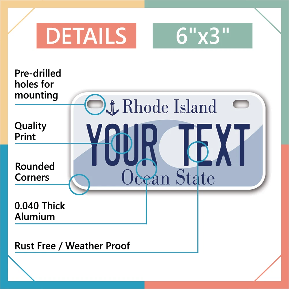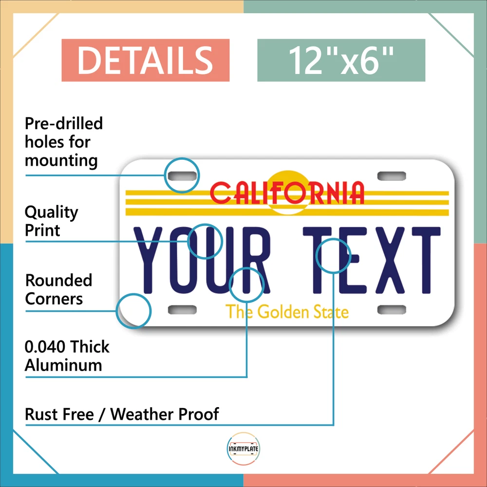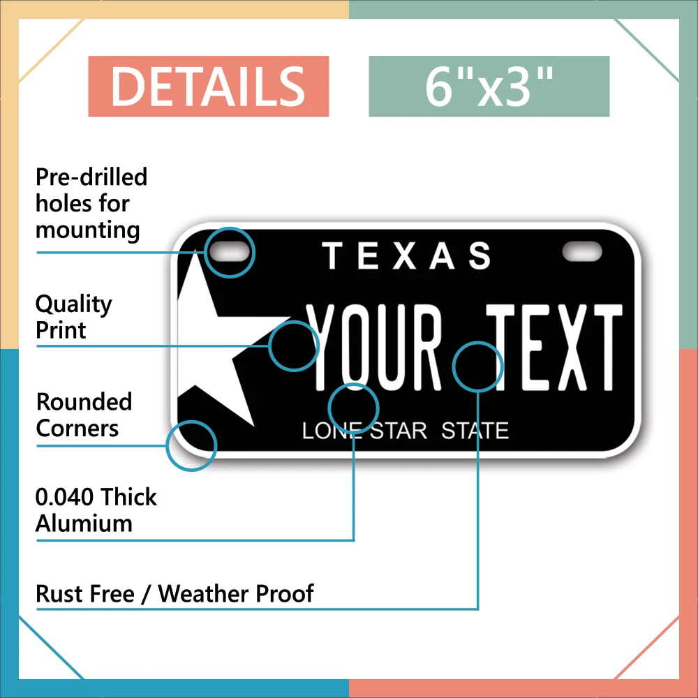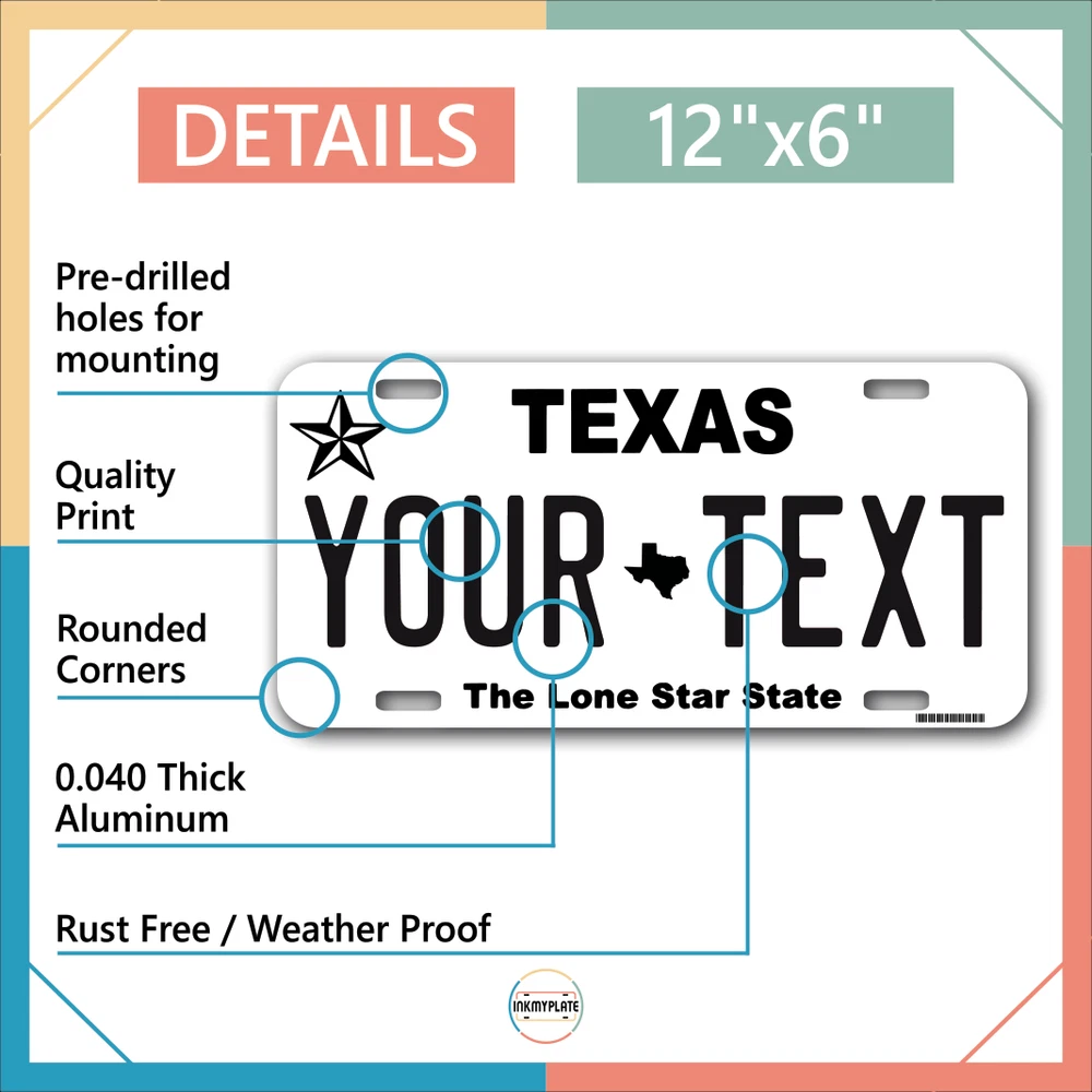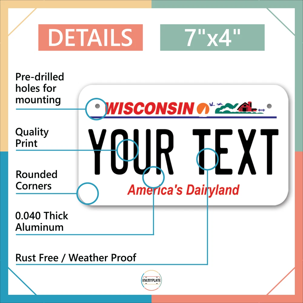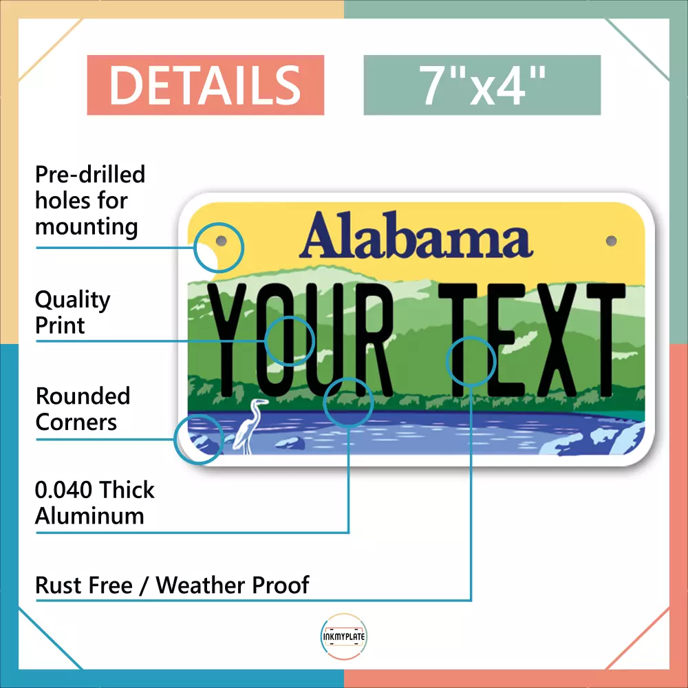 Our LICENSE plates are the most unique souvenirs from the United States, Choose between 50 states and 3 different sizes. Cannot be used in place of a state issued plate. IMPORTANT DESCRIPTION • Plates are made using High quality thick 040 rust free Aluminum. • Our plates are printed flat, not raised. The customizing is done using the latest UV Laser technique for weatherproof and high-quality finish. • 100% made in USA. • Standard car plate has four holes and can be used for trucks, motor homes, and more • M otorcycle plates have 2 holes on top for mounting and can be used on ATVS, Mopeds, Snowmobiles, wheelchairs and golf carts • B ike plates have two holes on top and can also be used for toy cars, wagons, electric toy cars, tricycles and more • Write your text in the personalization section. The text will be copied and pasted on the license plate as sent, so make sure of the spelling, punctuation, capitalization, etc. If you have any question regarding your text or you would like a preview, please let us know by adding a note or contacting Alabama | Alaska | Arizona | Arkansas | California | Colorado | Connecticut | Delaware | Florida | Georgia | Hawaii | Idaho | Illinois | Indiana | Iowa | Kansas | Kentucky | Louisiana | Maine | Maryland | Massachusetts | Michigan | Minnesota | Mississippi | Missouri | Montana | Nebraska | Nevada | New Hampshire | New Jersey | New Mexico | New York | North Carolina | North Dakota | Ohio | Oklahoma | Oregon | Pennsylvania | Puerto Rico | Rhode Island | South Carolina | South Dakota | Tennessee | Texas | Utah | Vermont | Virginia | Washington | West Virginia | Wisconsin | Wyoming
