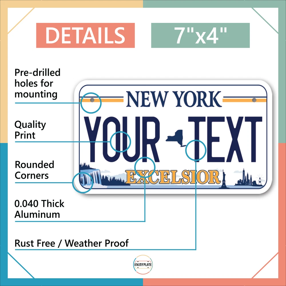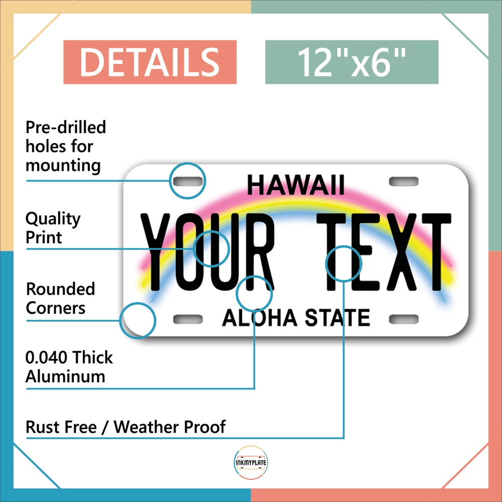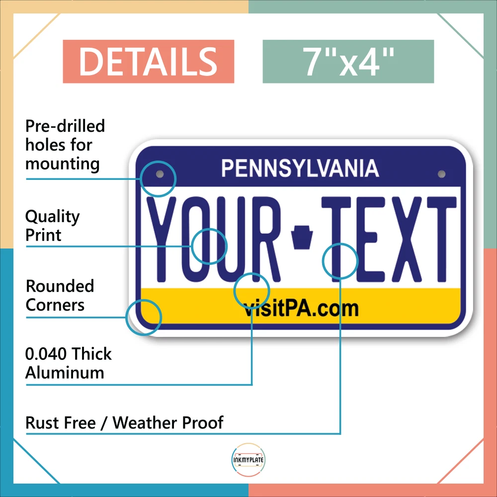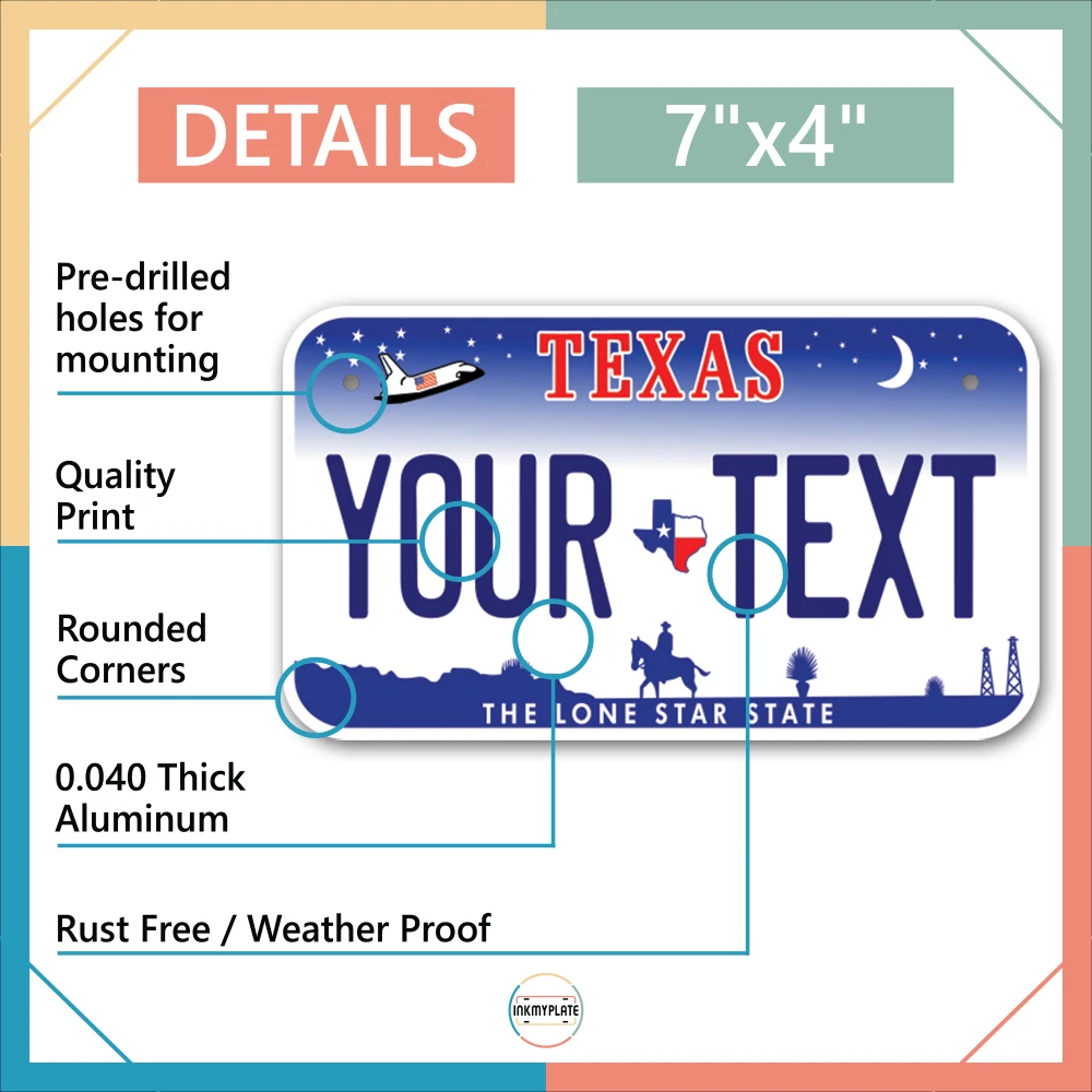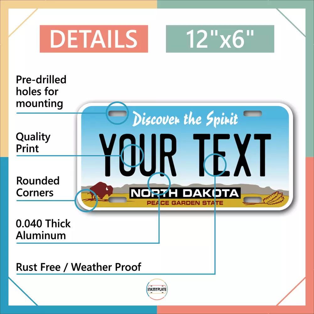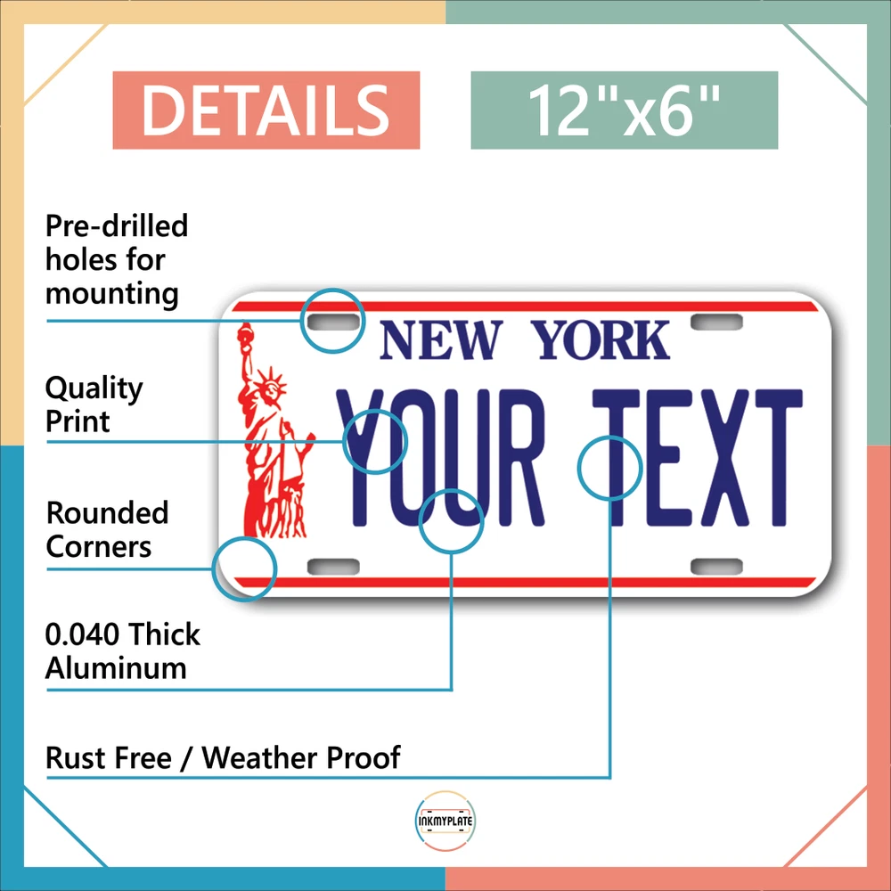 Our LICENSE plates are the most unique souvenirs from the United States, Choose between 50 states and 3 different sizes. Cannot be used in place of a state issued plate. IMPORTANT DESCRIPTION • Plates are made using High quality thick 040 rust free Aluminum. • Our plates are printed flat, not raised. The customizing is done using the latest UV Laser technique for weatherproof and high-quality finish. • 100% made in USA. • Standard car plate has four holes and can be used for trucks, motor homes, and more • M otorcycle plates have 2 holes on top for mounting and can be used on ATVS, Mopeds, Snowmobiles, wheelchairs and golf carts • B ike plates have two holes on top and can also be used for toy cars, wagons, electric toy cars, tricycles and more • Write your text in the personalization section. The text will be copied and pasted on the license plate as sent, so make sure of the spelling, punctuation, capitalization, etc. If you have any question regarding your text or you would like a preview, please let us know by adding a note or contacting Alabama | Alaska | Arizona | Arkansas | California | Colorado | Connecticut | Delaware | Florida | Georgia | Hawaii | Idaho | Illinois | Indiana | Iowa | Kansas | Kentucky | Louisiana | Maine | Maryland | Massachusetts | Michigan | Minnesota | Mississippi | Missouri | Montana | Nebraska | Nevada | New Hampshire | New Jersey | New Mexico | New York | North Carolina | North Dakota | Ohio | Oklahoma | Oregon | Pennsylvania | Puerto Rico | Rhode Island | South Carolina | South Dakota | Tennessee | Texas | Utah | Vermont | Virginia | Washington | West Virginia | Wisconsin | Wyoming