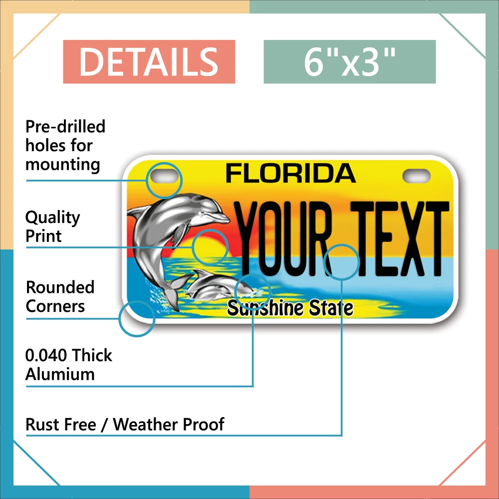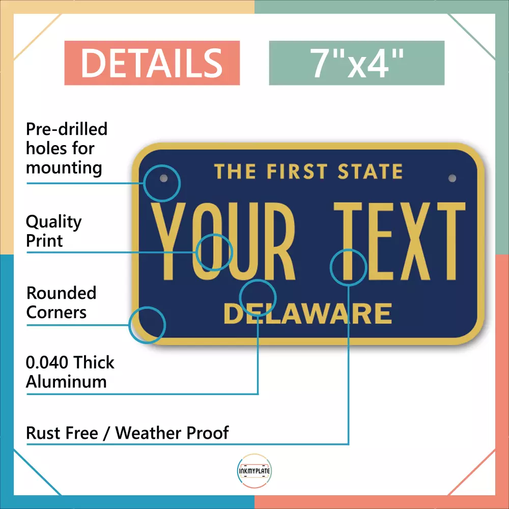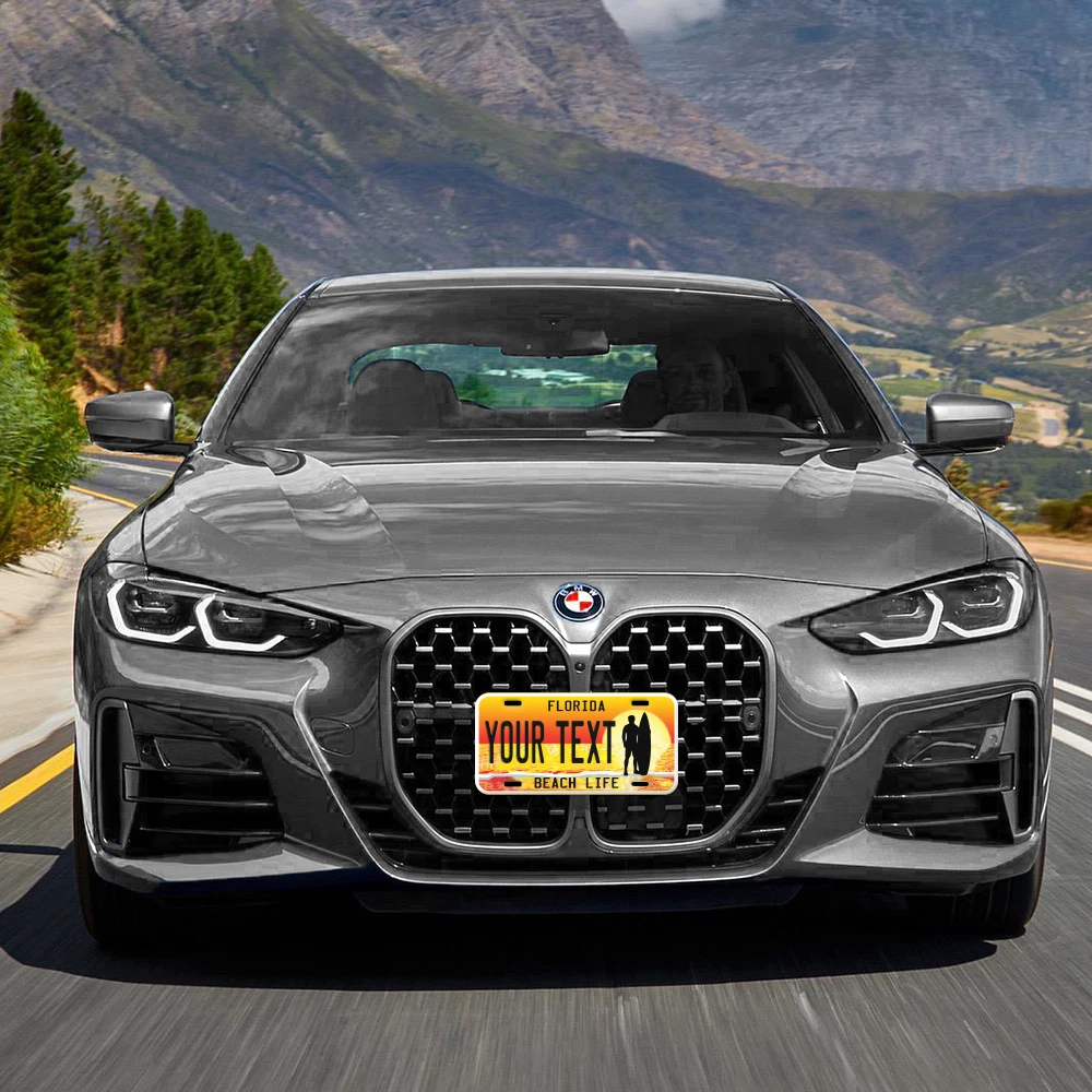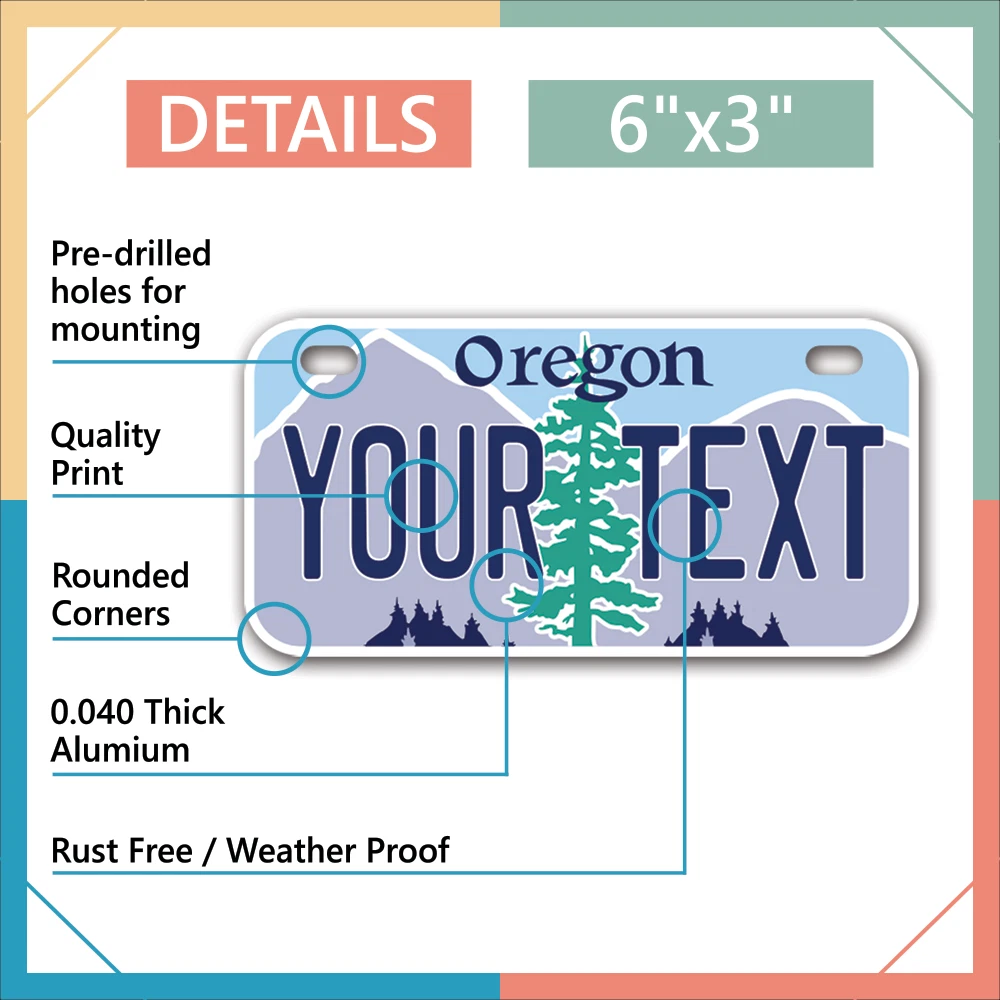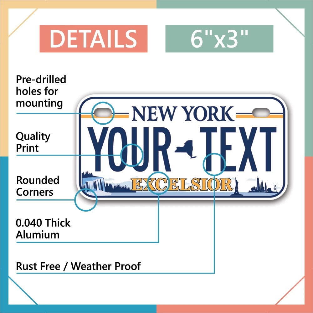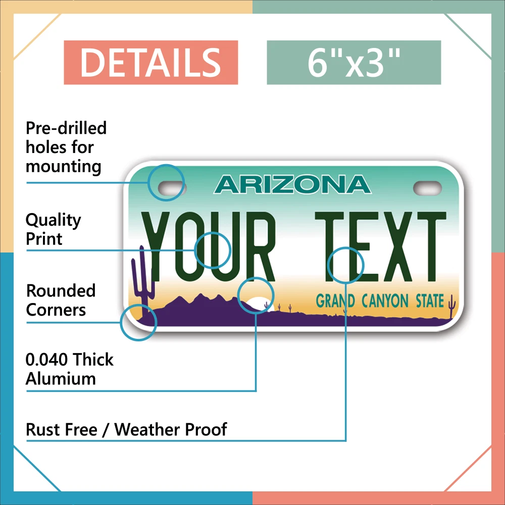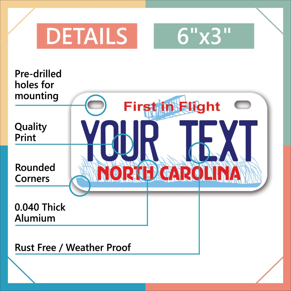 Our LICENSE plates are the most unique souvenirs from the United States, Choose between 50 states and 3 different sizes. Cannot be used in place of a state issued plate. IMPORTANT DESCRIPTION • Plates are made using High quality thick 040 rust free Aluminum. • Our plates are printed flat, not raised. The customizing is done using the latest UV Laser technique for weatherproof and high-quality finish. • 100% made in USA. • Standard car plate has four holes and can be used for trucks, motor homes, and more • M otorcycle plates have 2 holes on top for mounting and can be used on ATVS, Mopeds, Snowmobiles, wheelchairs and golf carts • B ike plates have two holes on top and can also be used for toy cars, wagons, electric toy cars, tricycles and more • Write your text in the personalization section. The text will be copied and pasted on the license plate as sent, so make sure of the spelling, punctuation, capitalization, etc. If you have any question regarding your text or you would like a preview, please let us know by adding a note or contacting Alabama | Alaska | Arizona | Arkansas | California | Colorado | Connecticut | Delaware | Florida | Georgia | Hawaii | Idaho | Illinois | Indiana | Iowa | Kansas | Kentucky | Louisiana | Maine | Maryland | Massachusetts | Michigan | Minnesota | Mississippi | Missouri | Montana | Nebraska | Nevada | New Hampshire | New Jersey | New Mexico | New York | North Carolina | North Dakota | Ohio | Oklahoma | Oregon | Pennsylvania | Puerto Rico | Rhode Island | South Carolina | South Dakota | Tennessee | Texas | Utah | Vermont | Virginia | Washington | West Virginia | Wisconsin | Wyoming