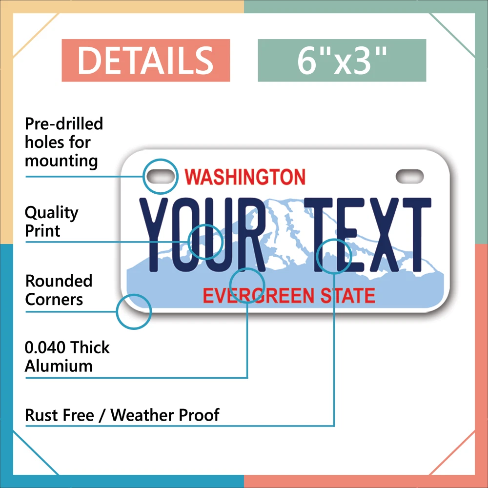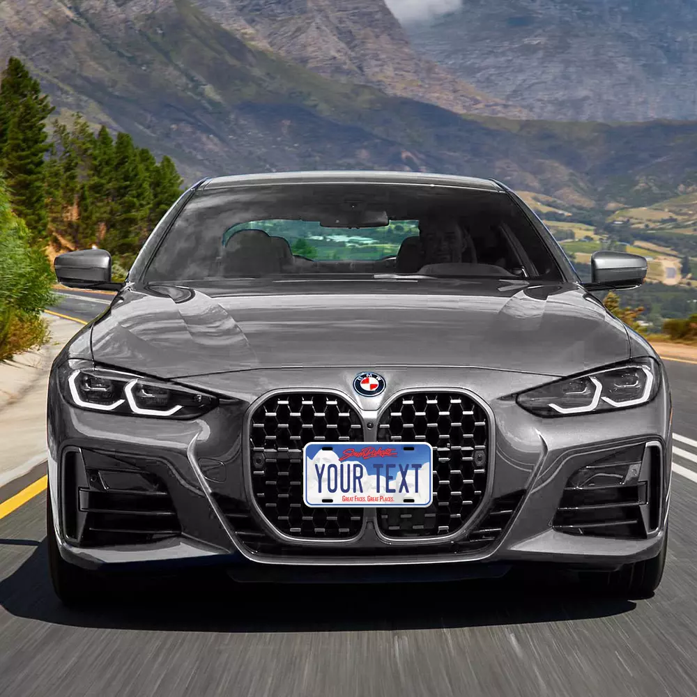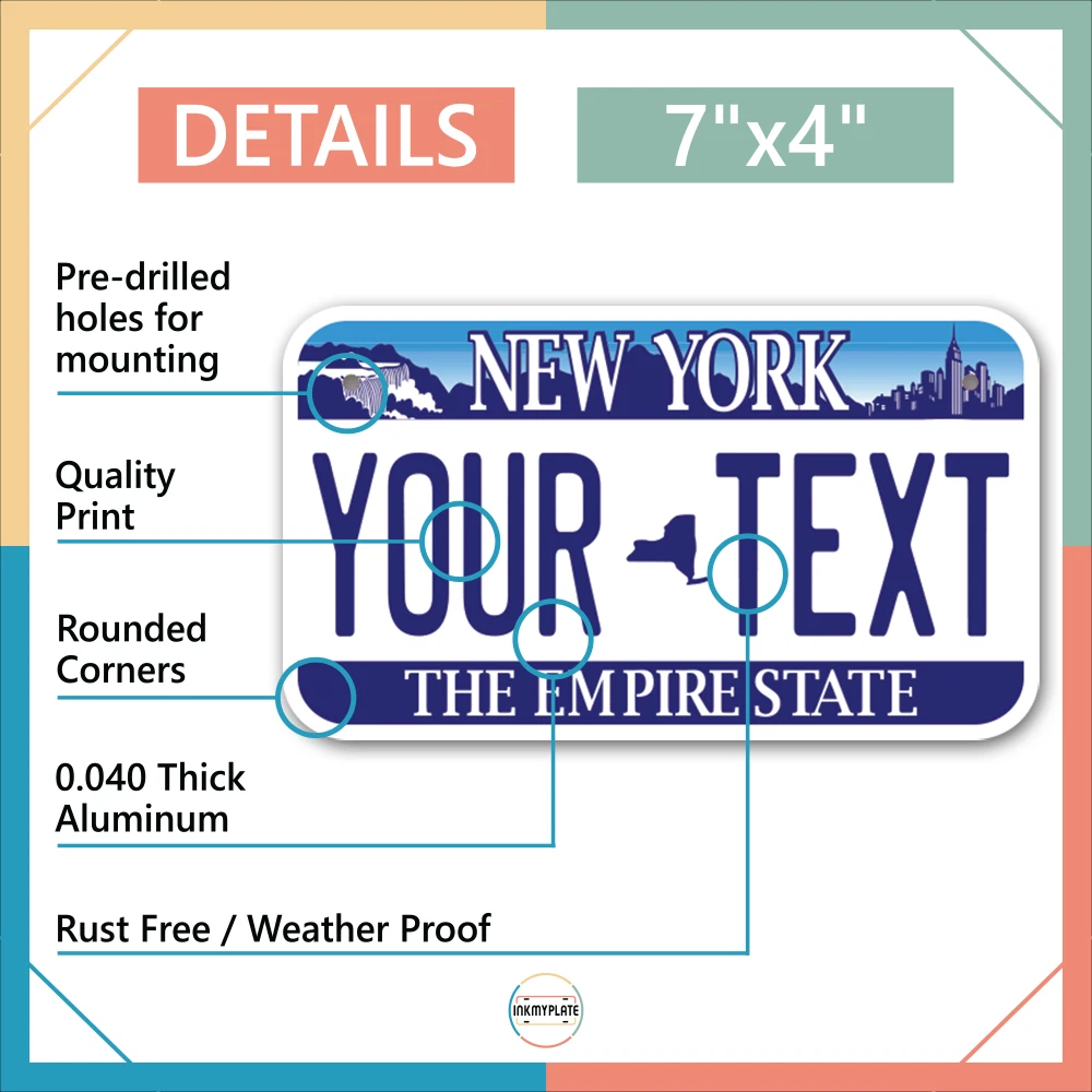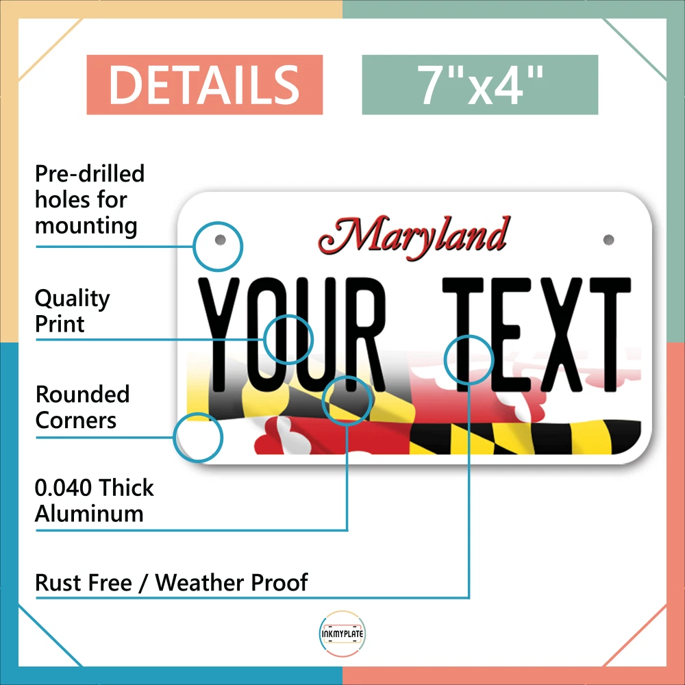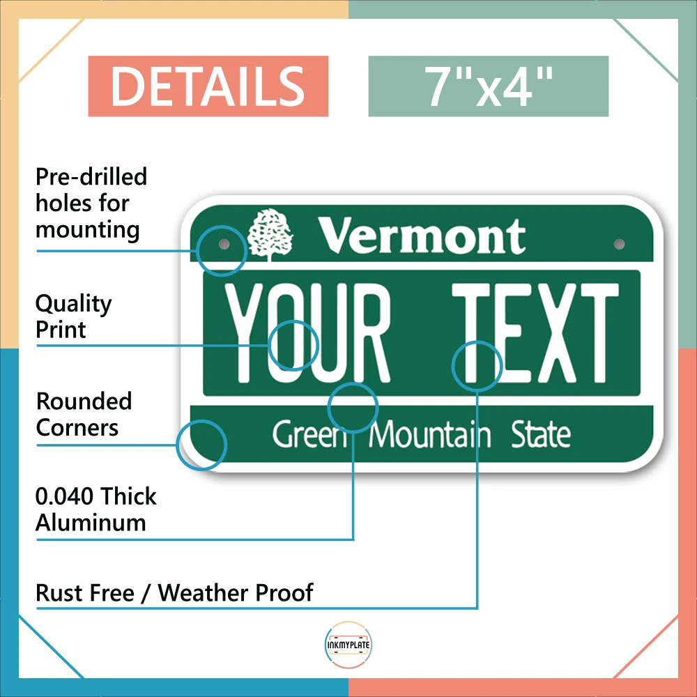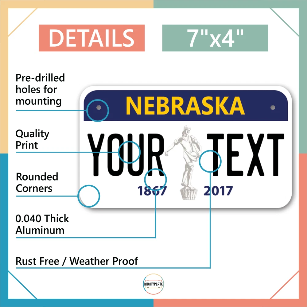 Our LICENSE plates are the most unique souvenirs from the United States, Choose between 50 states and 3 different sizes. Cannot be used in place of a state issued plate. IMPORTANT DESCRIPTION • Plates are made using High quality thick 040 rust free Aluminum. • Our plates are printed flat, not raised. The customizing is done using the latest UV Laser technique for weatherproof and high-quality finish. • 100% made in USA. • Standard car plate has four holes and can be used for trucks, motor homes, and more • M otorcycle plates have 2 holes on top for mounting and can be used on ATVS, Mopeds, Snowmobiles, wheelchairs and golf carts • B ike plates have two holes on top and can also be used for toy cars, wagons, electric toy cars, tricycles and more • Write your text in the personalization section. The text will be copied and pasted on the license plate as sent, so make sure of the spelling, punctuation, capitalization, etc. If you have any question regarding your text or you would like a preview, please let us know by adding a note or contacting Alabama | Alaska | Arizona | Arkansas | California | Colorado | Connecticut | Delaware | Florida | Georgia | Hawaii | Idaho | Illinois | Indiana | Iowa | Kansas | Kentucky | Louisiana | Maine | Maryland | Massachusetts | Michigan | Minnesota | Mississippi | Missouri | Montana | Nebraska | Nevada | New Hampshire | New Jersey | New Mexico | New York | North Carolina | North Dakota | Ohio | Oklahoma | Oregon | Pennsylvania | Puerto Rico | Rhode Island | South Carolina | South Dakota | Tennessee | Texas | Utah | Vermont | Virginia | Washington | West Virginia | Wisconsin | Wyoming