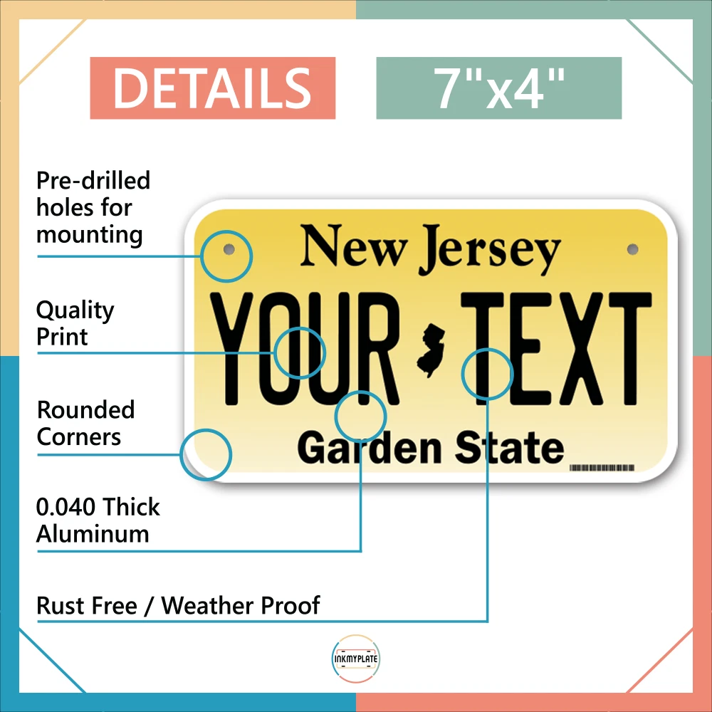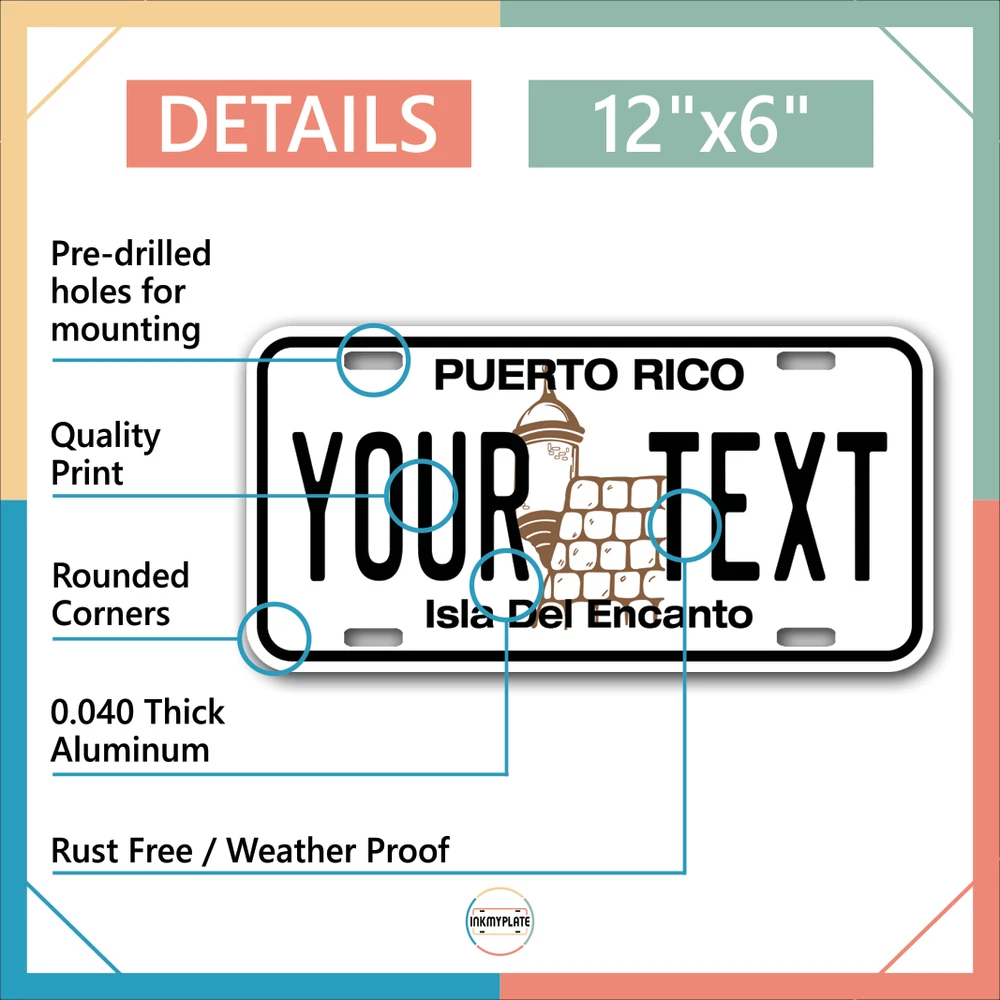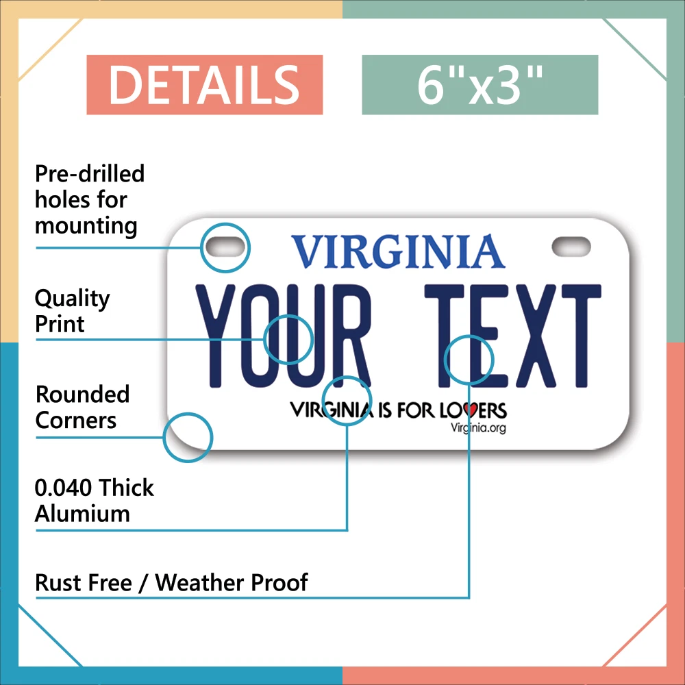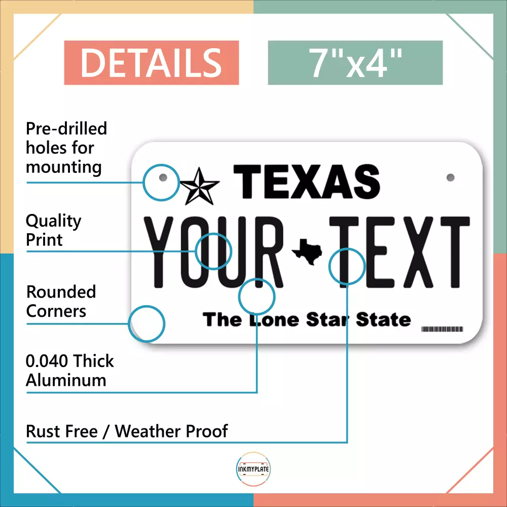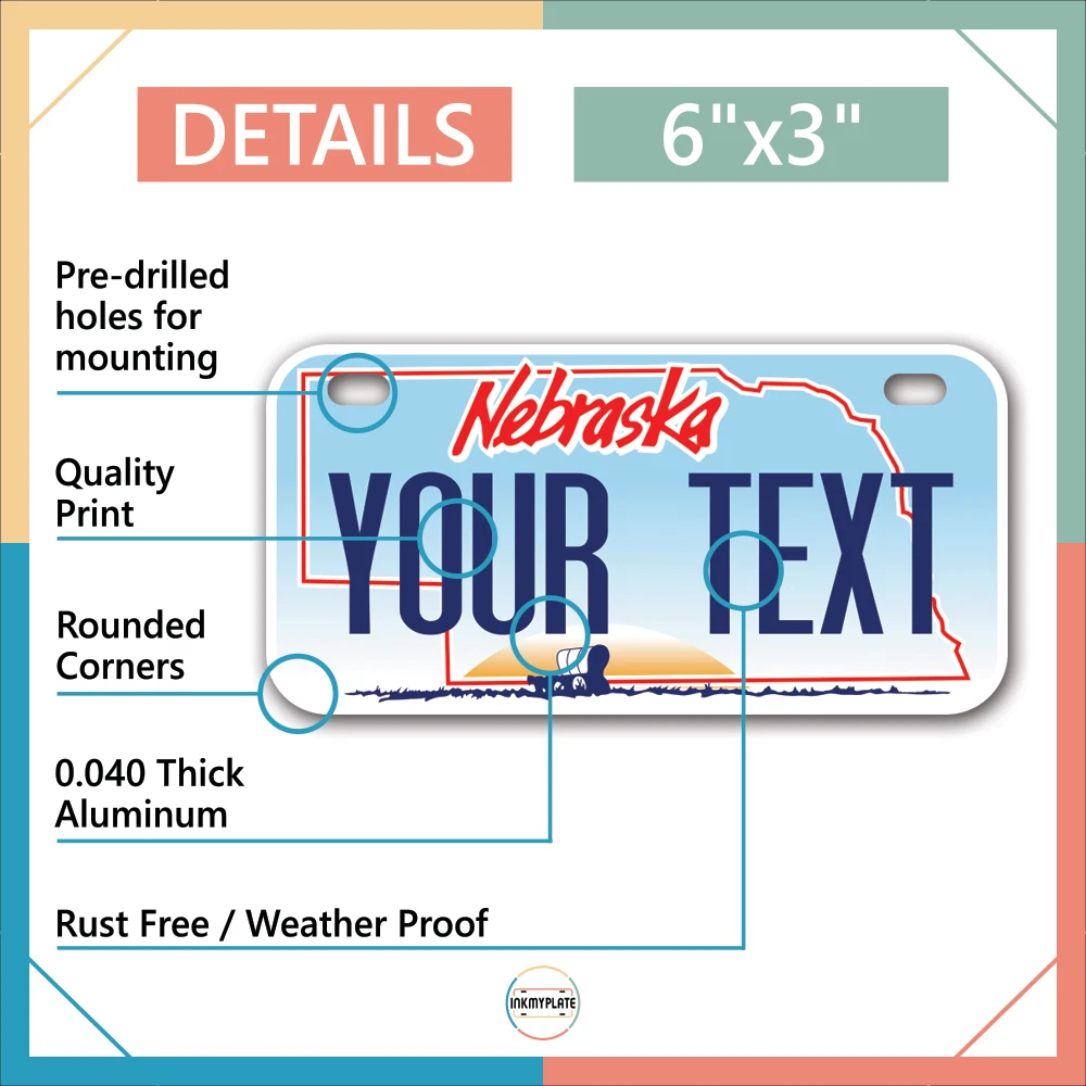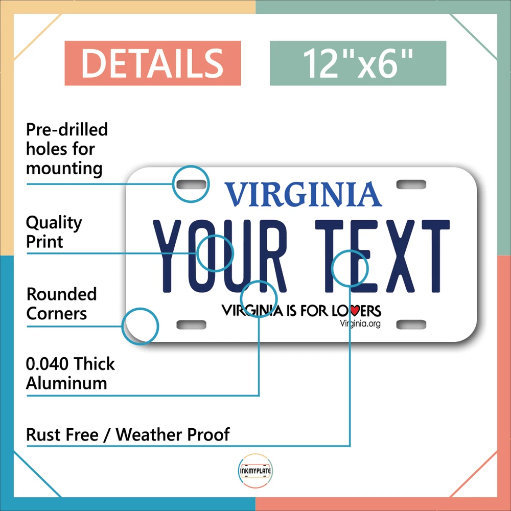 Our LICENSE plates are the most unique souvenirs from the United States, Choose between 50 states and 3 different sizes. Cannot be used in place of a state issued plate. IMPORTANT DESCRIPTION • Plates are made using High quality thick 040 rust free Aluminum. • Our plates are printed flat, not raised. The customizing is done using the latest UV Laser technique for weatherproof and high-quality finish. • 100% made in USA. • Standard car plate has four holes and can be used for trucks, motor homes, and more • M otorcycle plates have 2 holes on top for mounting and can be used on ATVS, Mopeds, Snowmobiles, wheelchairs and golf carts • B ike plates have two holes on top and can also be used for toy cars, wagons, electric toy cars, tricycles and more • Write your text in the personalization section. The text will be copied and pasted on the license plate as sent, so make sure of the spelling, punctuation, capitalization, etc. If you have any question regarding your text or you would like a preview, please let us know by adding a note or contacting Alabama | Alaska | Arizona | Arkansas | California | Colorado | Connecticut | Delaware | Florida | Georgia | Hawaii | Idaho | Illinois | Indiana | Iowa | Kansas | Kentucky | Louisiana | Maine | Maryland | Massachusetts | Michigan | Minnesota | Mississippi | Missouri | Montana | Nebraska | Nevada | New Hampshire | New Jersey | New Mexico | New York | North Carolina | North Dakota | Ohio | Oklahoma | Oregon | Pennsylvania | Puerto Rico | Rhode Island | South Carolina | South Dakota | Tennessee | Texas | Utah | Vermont | Virginia | Washington | West Virginia | Wisconsin | Wyoming